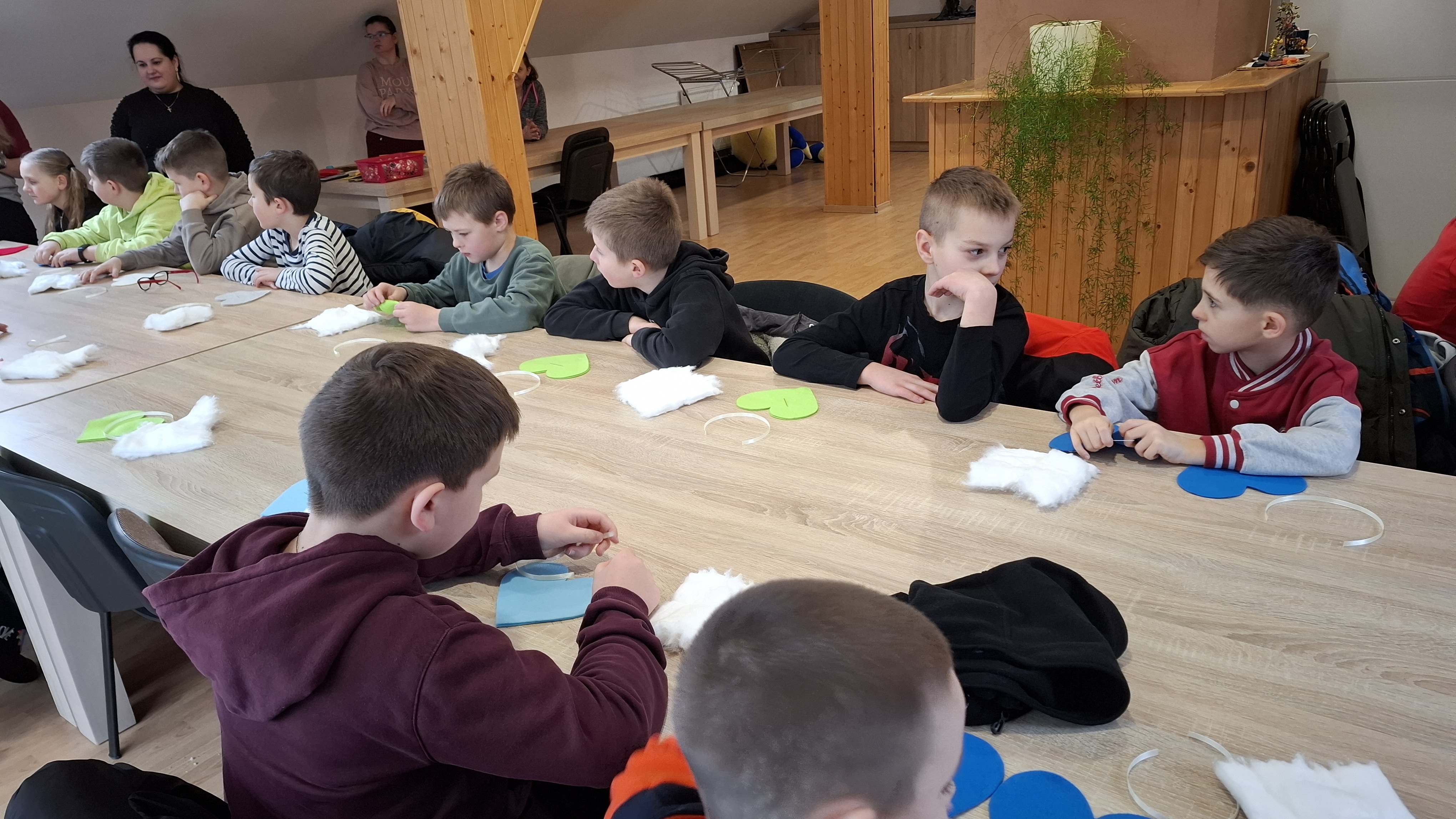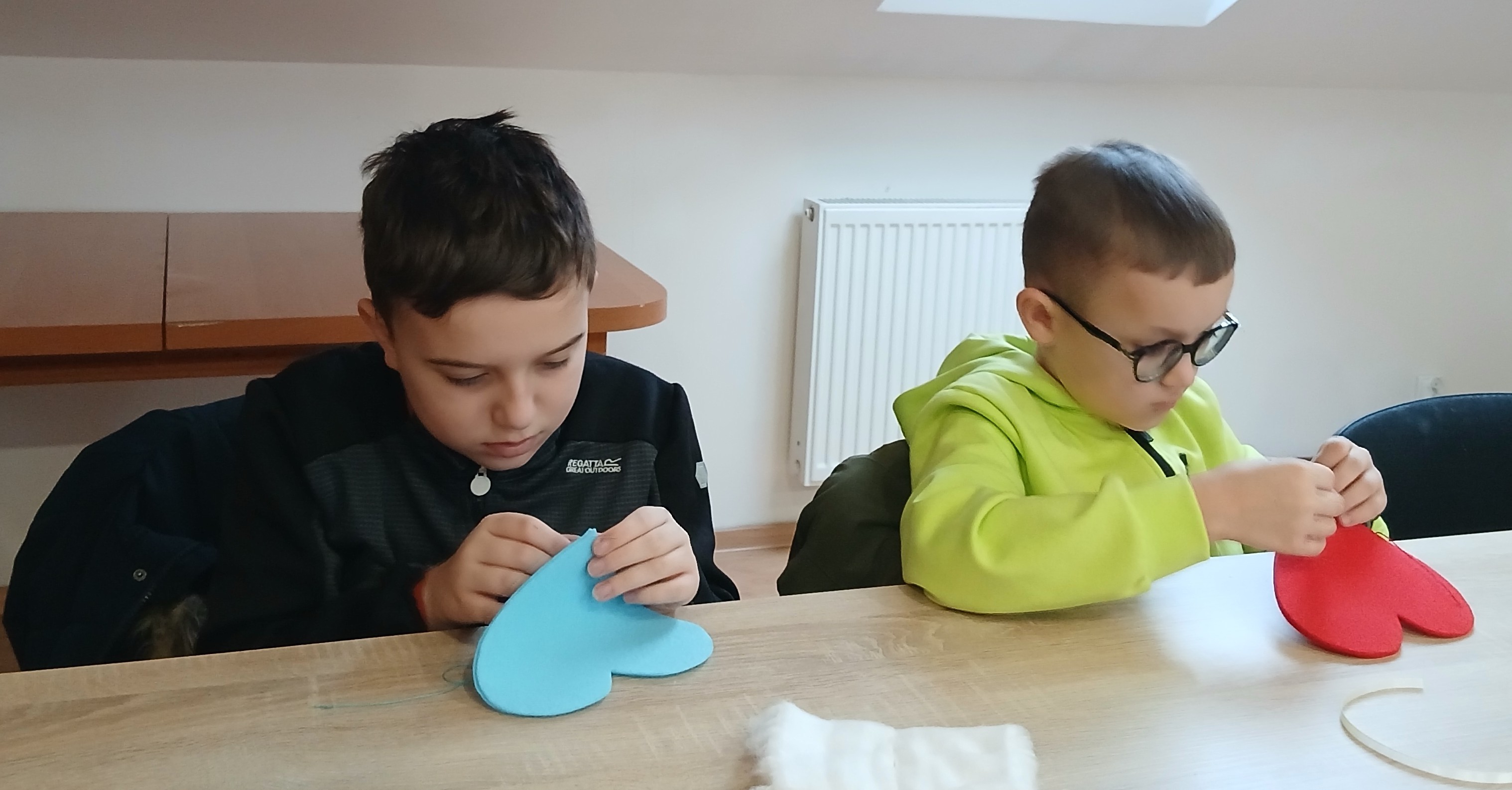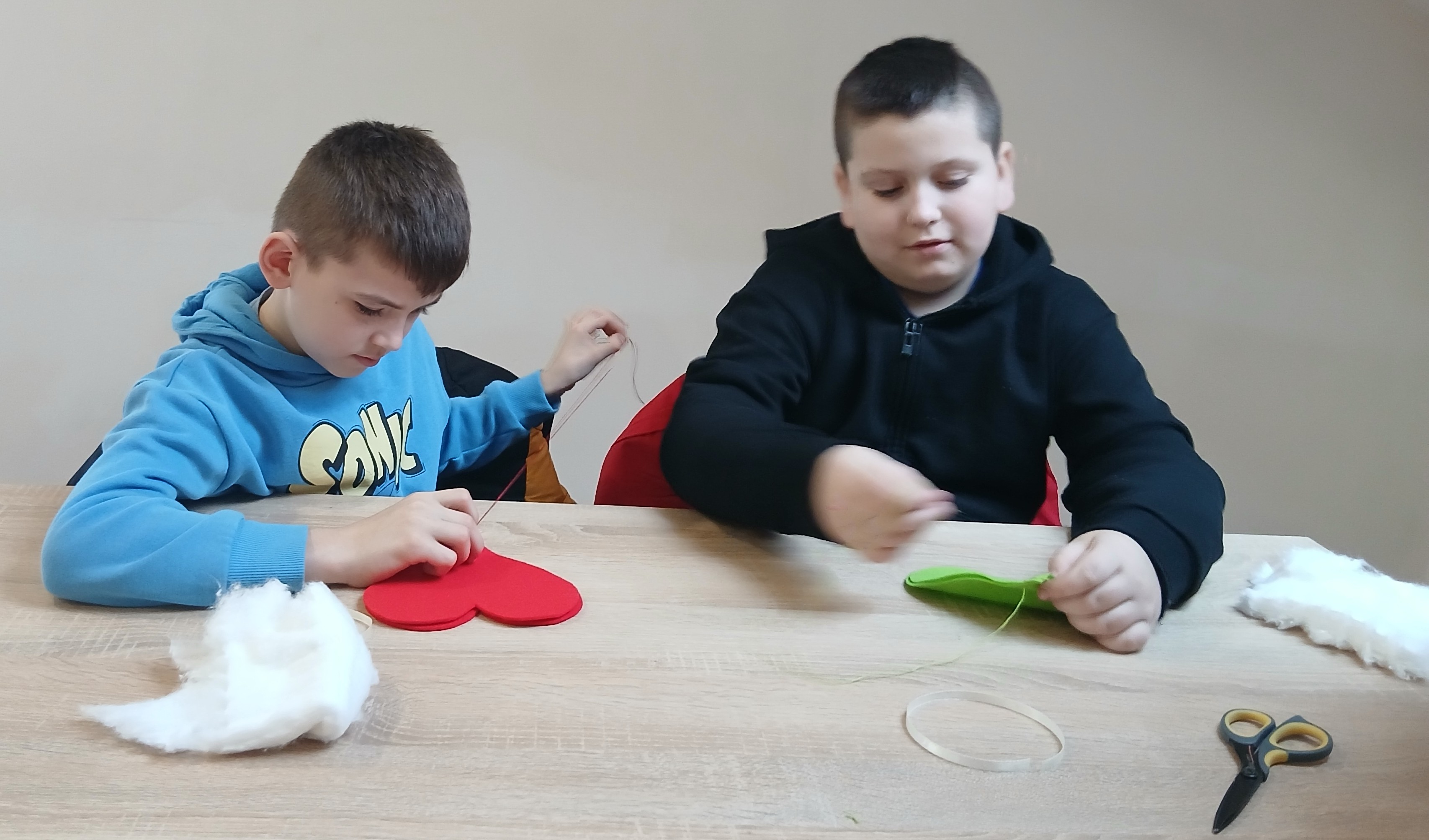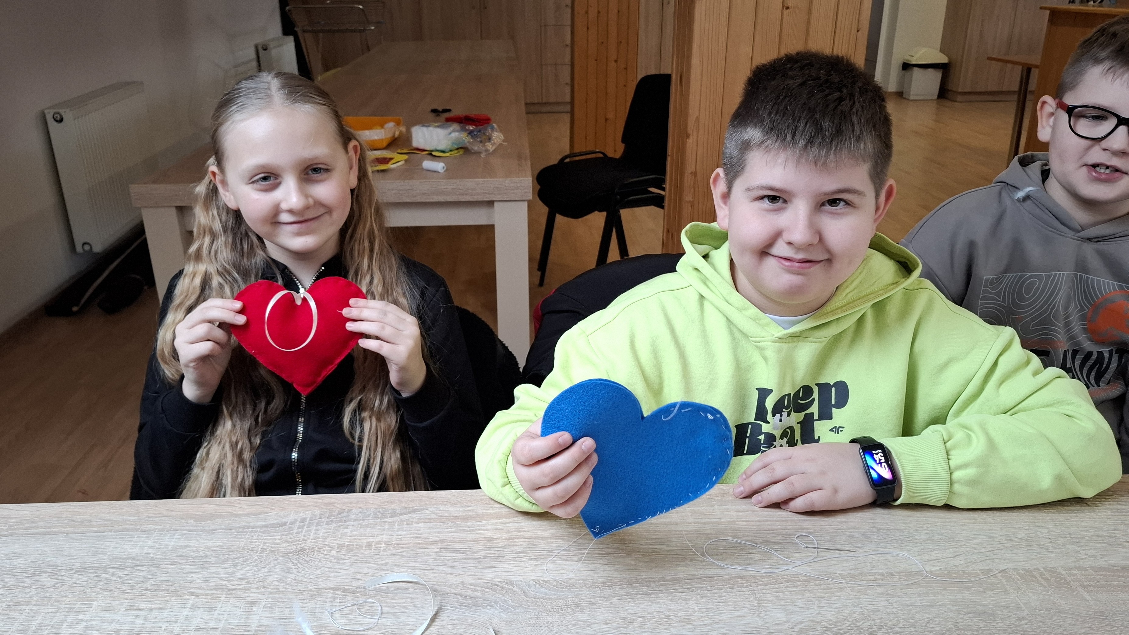 Wyprawa od samego początku owiana była mgiełką tajemnicy. Dzieci, a nawet wychowawcy klas, nie wiedzieli, co dokładnie będzie tematem zajęć! Kiedy na stołach pojawiły się igły, nici i kolorowe materiały, na twarzach wszystkich odmalowało się wielkie zaskoczenie. Szycie? Dla większości była to absolutna nowość i nie lada wyzwanie. Choć na początku w oczach niektórych widać było lekką niepewność – w końcu nawlekanie nitki i operowanie igłą to sztuka – strach szybko ustąpił miejsca pasji tworzenia. Pod czujnym okiem cierpliwych instruktorów z WTZ, dzieci krok po kroku zgłębiały tajniki krawiectwa. Uczniowie musieli wykazać się dużą cierpliwością i precyzją, aby starannie połączyć ze sobą dwa kawałki kolorowego filcu w kształt walentynkowego serca. Najbardziej emocjonującym etapem dla większości z nich była pierwsza w życiu dzieci nauka nawlekania nitki na igłę, robienia supełka, a następnie szycia. Pod okiem instruktorów trzecioklasiści skupiali się na każdym ruchu igły, tworząc ściegi łączące brzegi materiału. Na koniec, aby nadać pracom puszystości, dzieci wypełniły wnętrza serc miękką watą, dzięki czemu płaskie skrawki filcu zamieniły się w piękne, wypukłe upominki. Największym zaskoczeniem dla samych uczniów, a także dorosłych opiekunów, był fakt, że każdy bez wyjątku poradził sobie z zadaniem. Mimo że był to ich pierwszy kontakt z igłą, sala szybko wypełniła się pięknymi, kolorowymi serduszkami. Praca w skupieniu przeplatała się z radosnymi okrzykami sukcesu, gdy kolejne dzieło było gotowe.