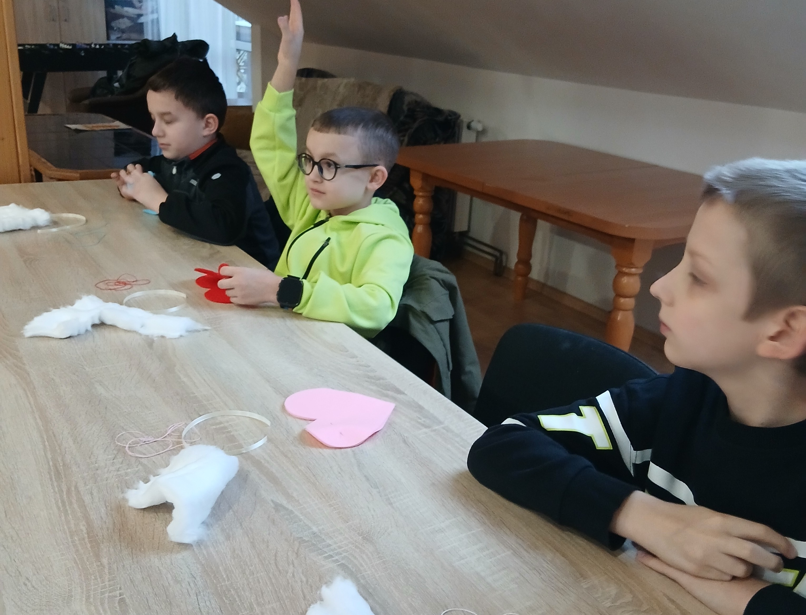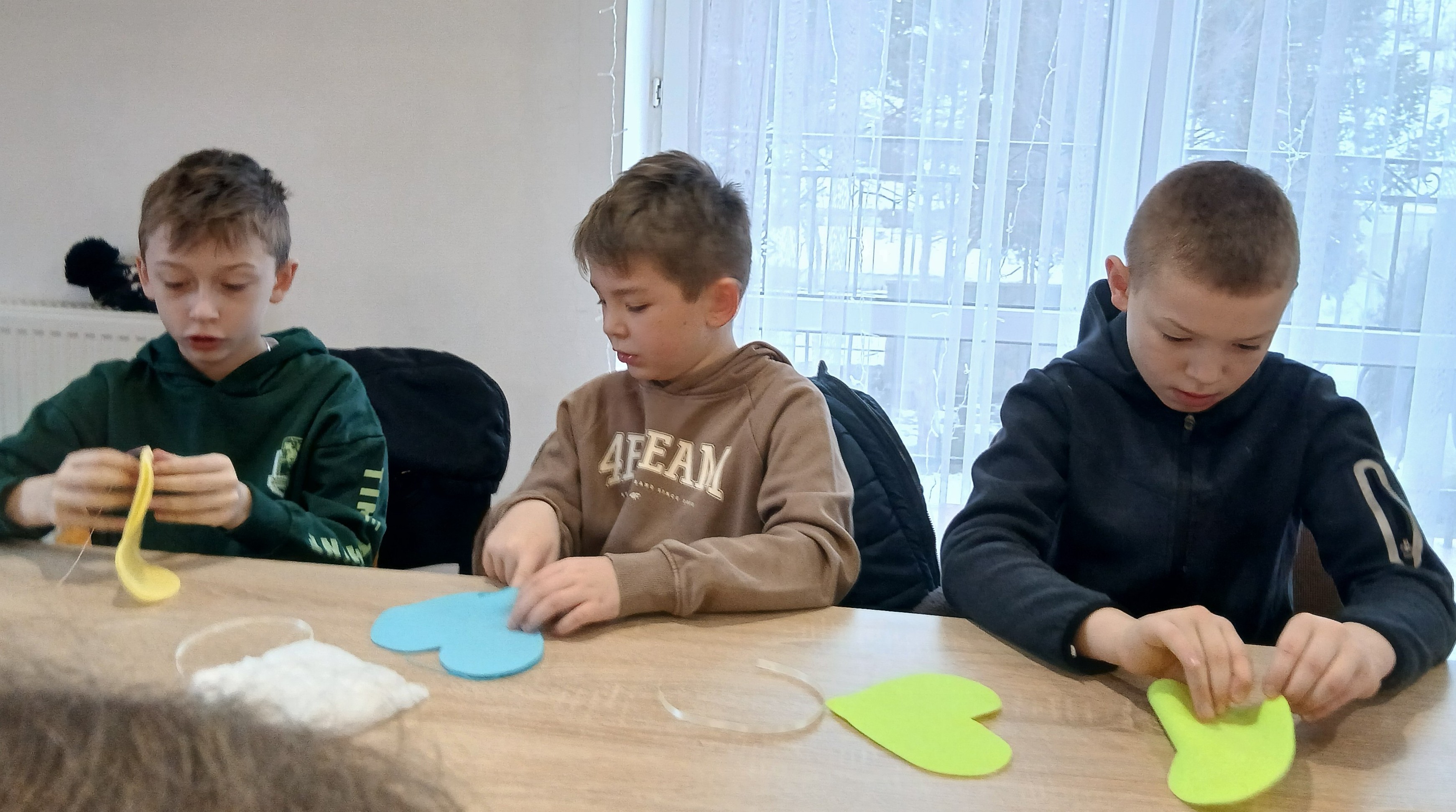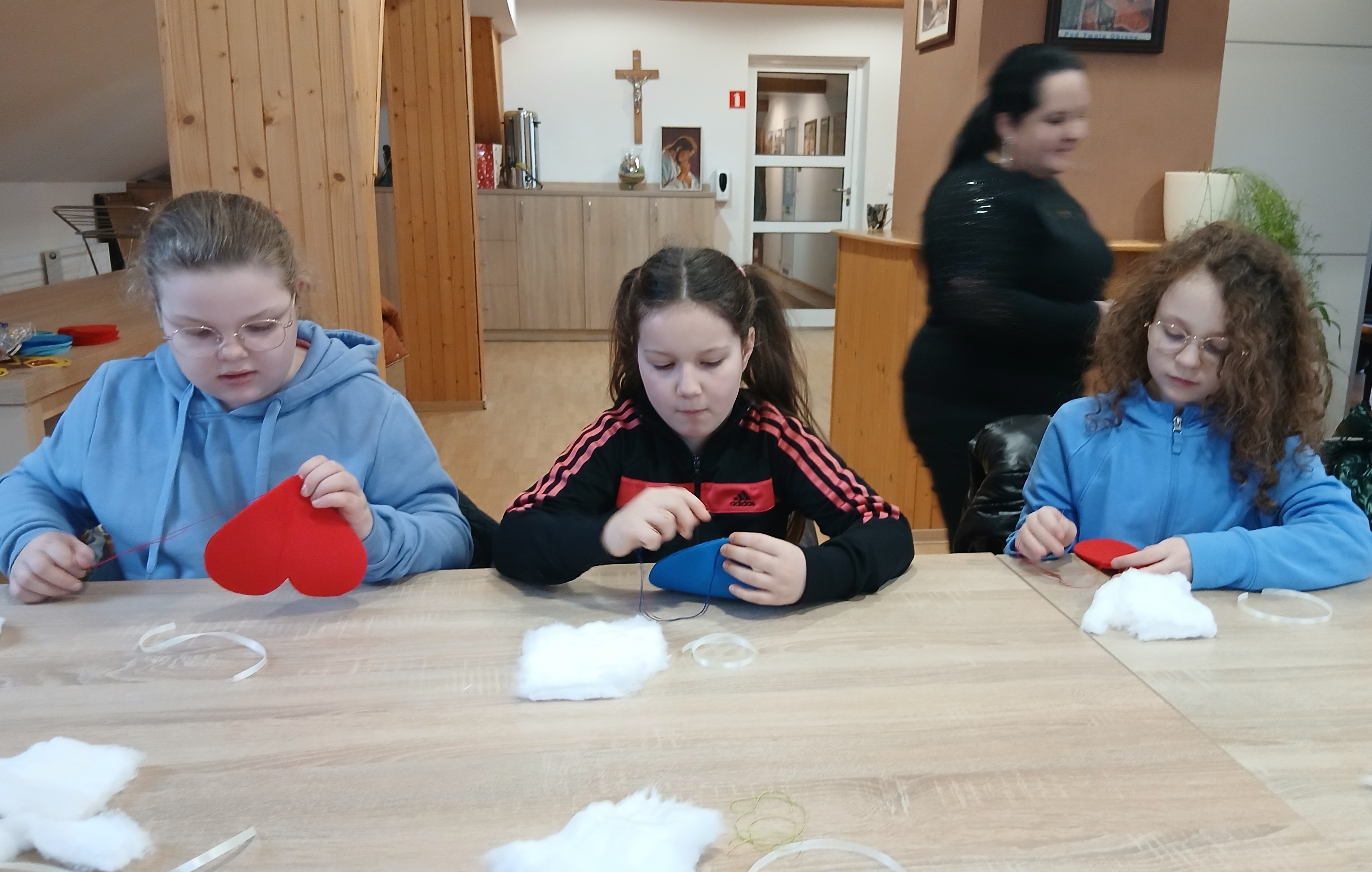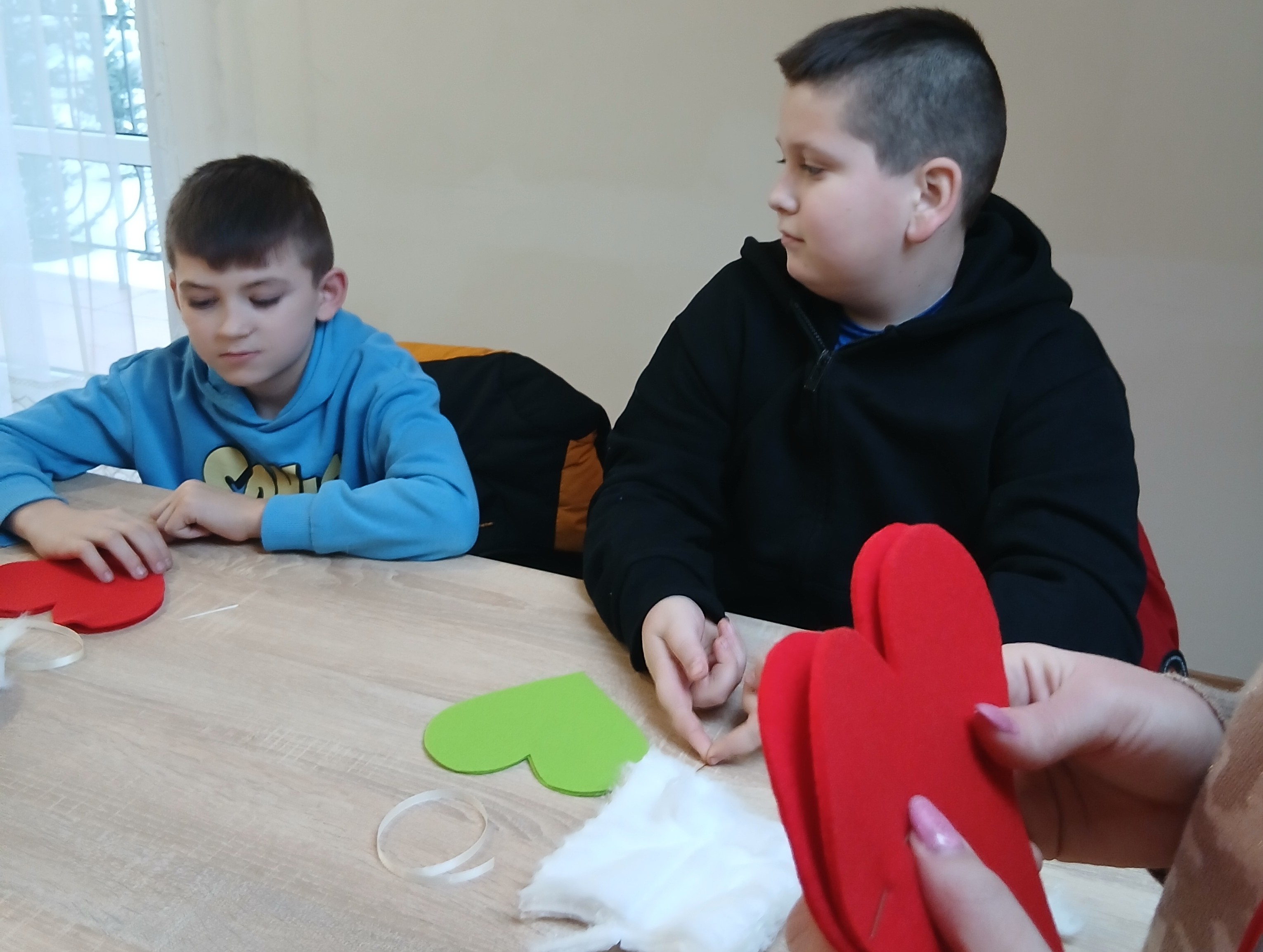 Wyprawa od samego początku owiana była mgiełką tajemnicy. Dzieci, a nawet wychowawcy klas, nie wiedzieli, co dokładnie będzie tematem zajęć! Kiedy na stołach pojawiły się igły, nici i kolorowe materiały, na twarzach wszystkich odmalowało się wielkie zaskoczenie. Szycie? Dla większości była to absolutna nowość i nie lada wyzwanie. Choć na początku w oczach niektórych widać było lekką niepewność – w końcu nawlekanie nitki i operowanie igłą to sztuka – strach szybko ustąpił miejsca pasji tworzenia. Pod czujnym okiem cierpliwych instruktorów z WTZ, dzieci krok po kroku zgłębiały tajniki krawiectwa. Uczniowie musieli wykazać się dużą cierpliwością i precyzją, aby starannie połączyć ze sobą dwa kawałki kolorowego filcu w kształt walentynkowego serca. Najbardziej emocjonującym etapem dla większości z nich była pierwsza w życiu dzieci nauka nawlekania nitki na igłę, robienia supełka, a następnie szycia. Pod okiem instruktorów trzecioklasiści skupiali się na każdym ruchu igły, tworząc ściegi łączące brzegi materiału. Na koniec, aby nadać pracom puszystości, dzieci wypełniły wnętrza serc miękką watą, dzięki czemu płaskie skrawki filcu zamieniły się w piękne, wypukłe upominki. Największym zaskoczeniem dla samych uczniów, a także dorosłych opiekunów, był fakt, że każdy bez wyjątku poradził sobie z zadaniem. Mimo że był to ich pierwszy kontakt z igłą, sala szybko wypełniła się pięknymi, kolorowymi serduszkami. Praca w skupieniu przeplatała się z radosnymi okrzykami sukcesu, gdy kolejne dzieło było gotowe.