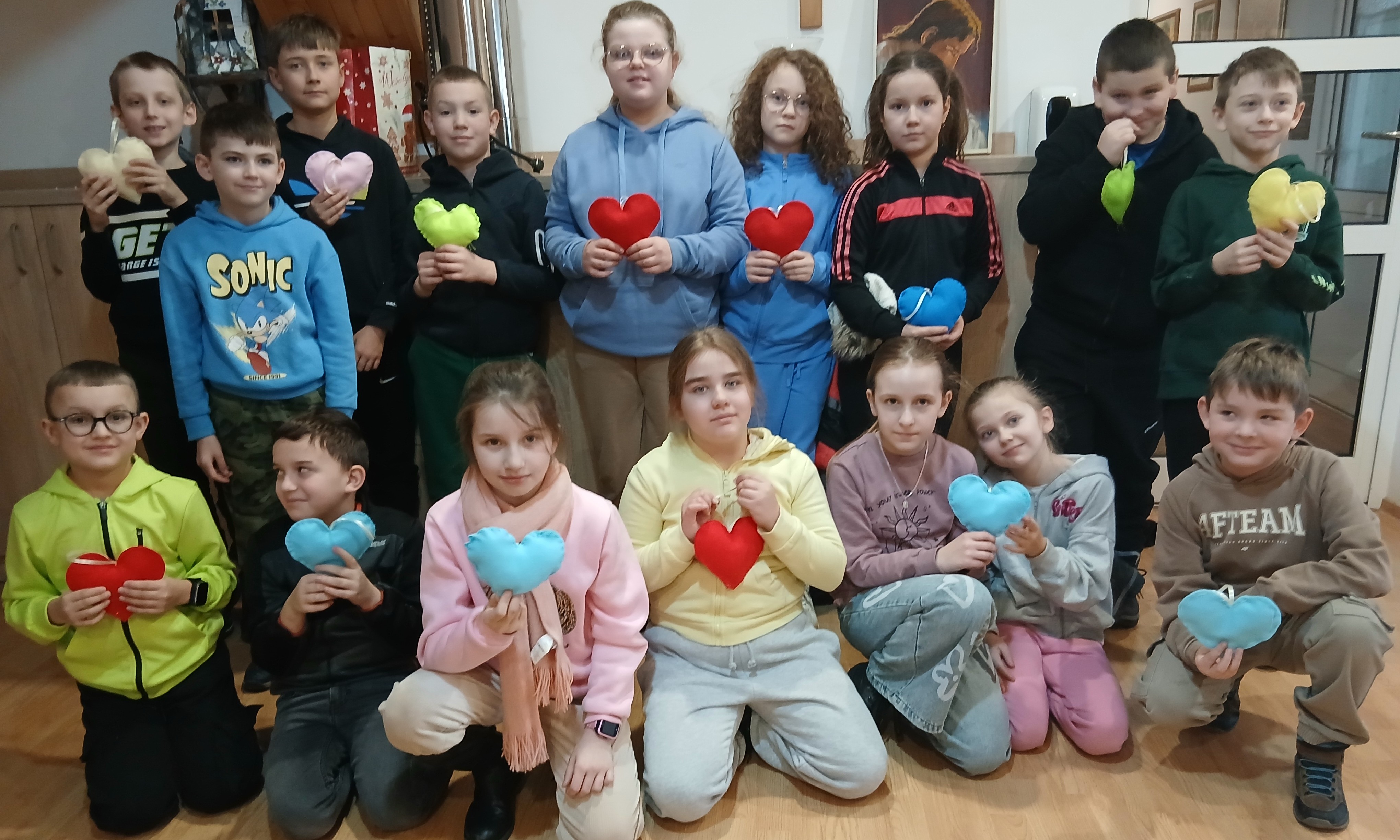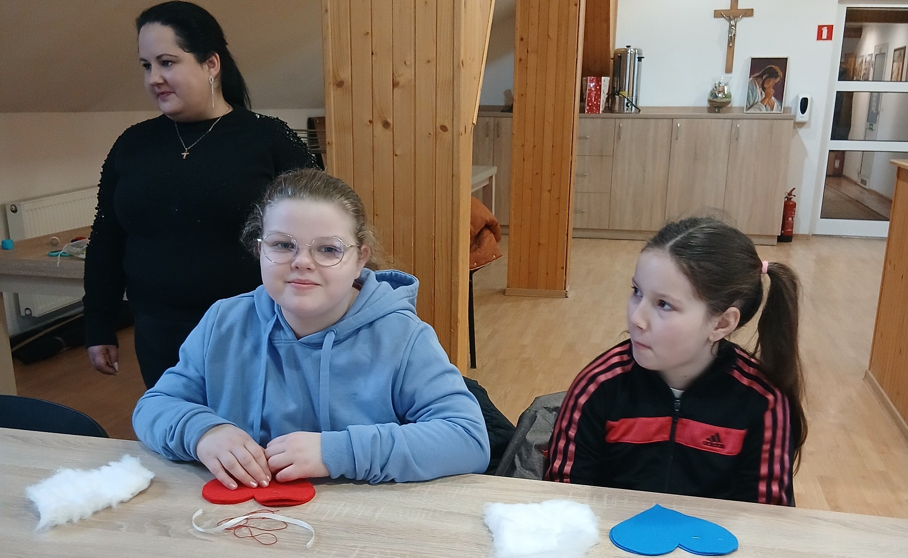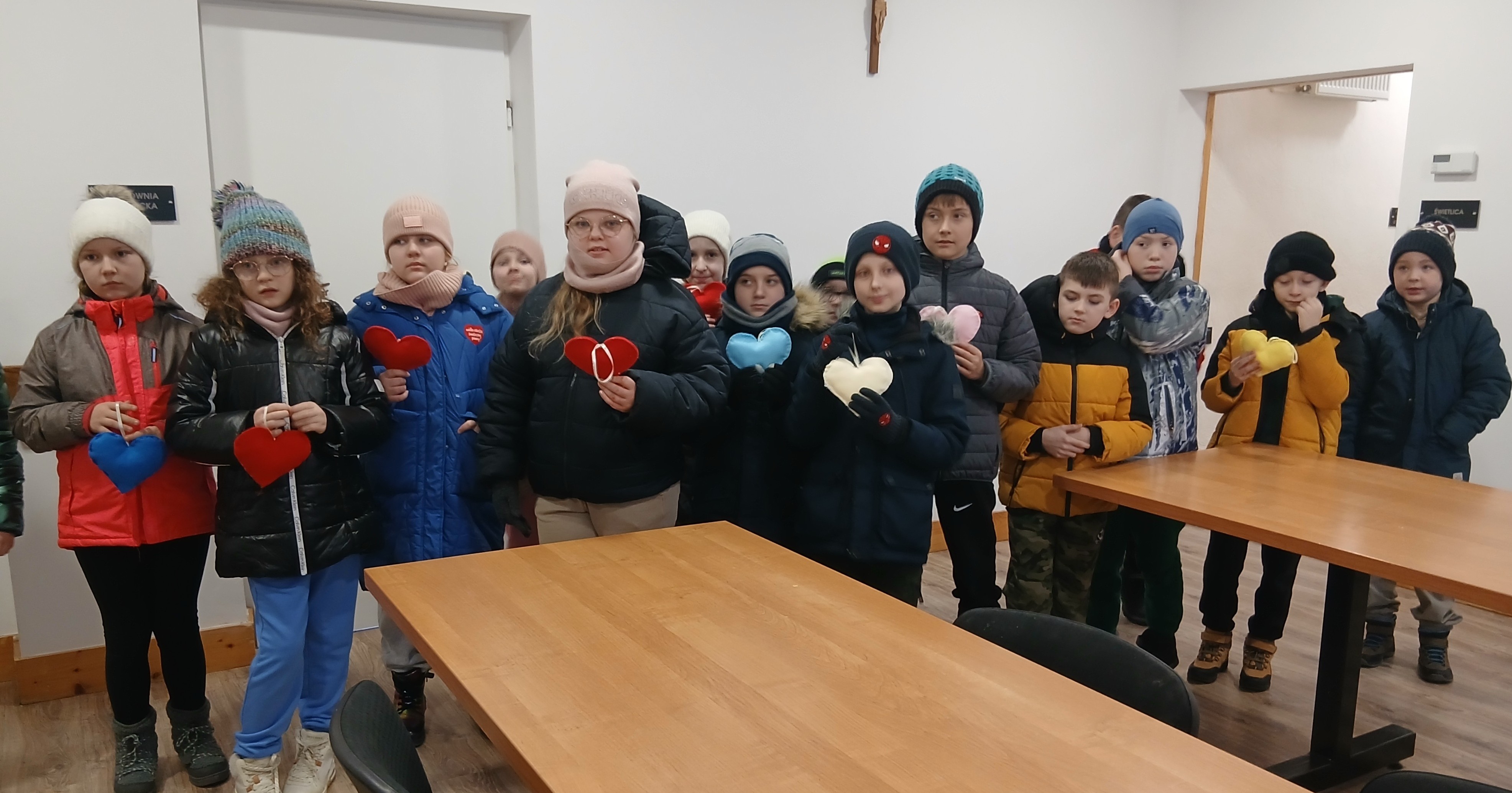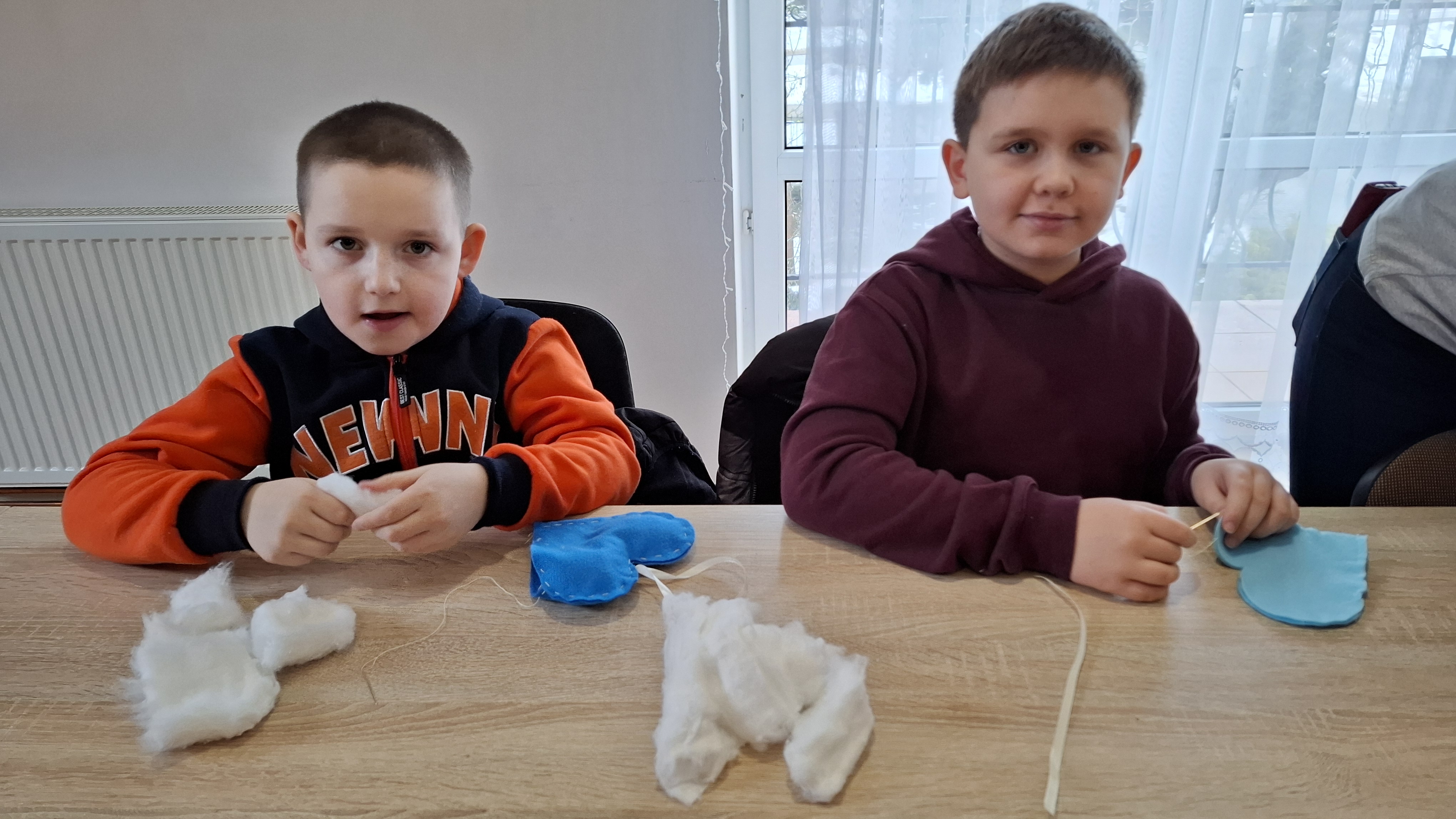 Wyprawa od samego początku owiana była mgiełką tajemnicy. Dzieci, a nawet wychowawcy klas, nie wiedzieli, co dokładnie będzie tematem zajęć! Kiedy na stołach pojawiły się igły, nici i kolorowe materiały, na twarzach wszystkich odmalowało się wielkie zaskoczenie. Szycie? Dla większości była to absolutna nowość i nie lada wyzwanie. Choć na początku w oczach niektórych widać było lekką niepewność – w końcu nawlekanie nitki i operowanie igłą to sztuka – strach szybko ustąpił miejsca pasji tworzenia. Pod czujnym okiem cierpliwych instruktorów z WTZ, dzieci krok po kroku zgłębiały tajniki krawiectwa. Uczniowie musieli wykazać się dużą cierpliwością i precyzją, aby starannie połączyć ze sobą dwa kawałki kolorowego filcu w kształt walentynkowego serca. Najbardziej emocjonującym etapem dla większości z nich była pierwsza w życiu dzieci nauka nawlekania nitki na igłę, robienia supełka, a następnie szycia. Pod okiem instruktorów trzecioklasiści skupiali się na każdym ruchu igły, tworząc ściegi łączące brzegi materiału. Na koniec, aby nadać pracom puszystości, dzieci wypełniły wnętrza serc miękką watą, dzięki czemu płaskie skrawki filcu zamieniły się w piękne, wypukłe upominki. Największym zaskoczeniem dla samych uczniów, a także dorosłych opiekunów, był fakt, że każdy bez wyjątku poradził sobie z zadaniem. Mimo że był to ich pierwszy kontakt z igłą, sala szybko wypełniła się pięknymi, kolorowymi serduszkami. Praca w skupieniu przeplatała się z radosnymi okrzykami sukcesu, gdy kolejne dzieło było gotowe.