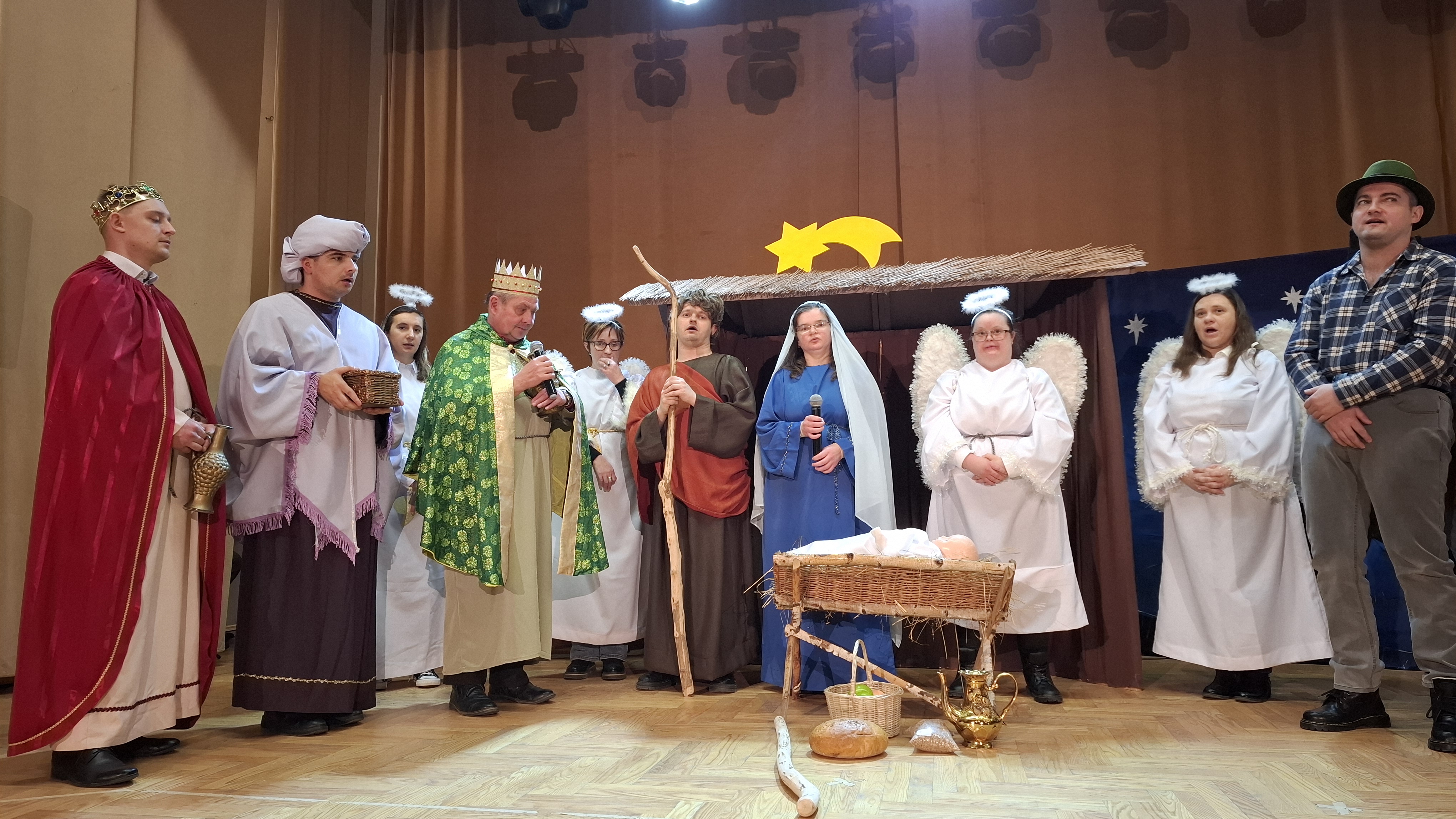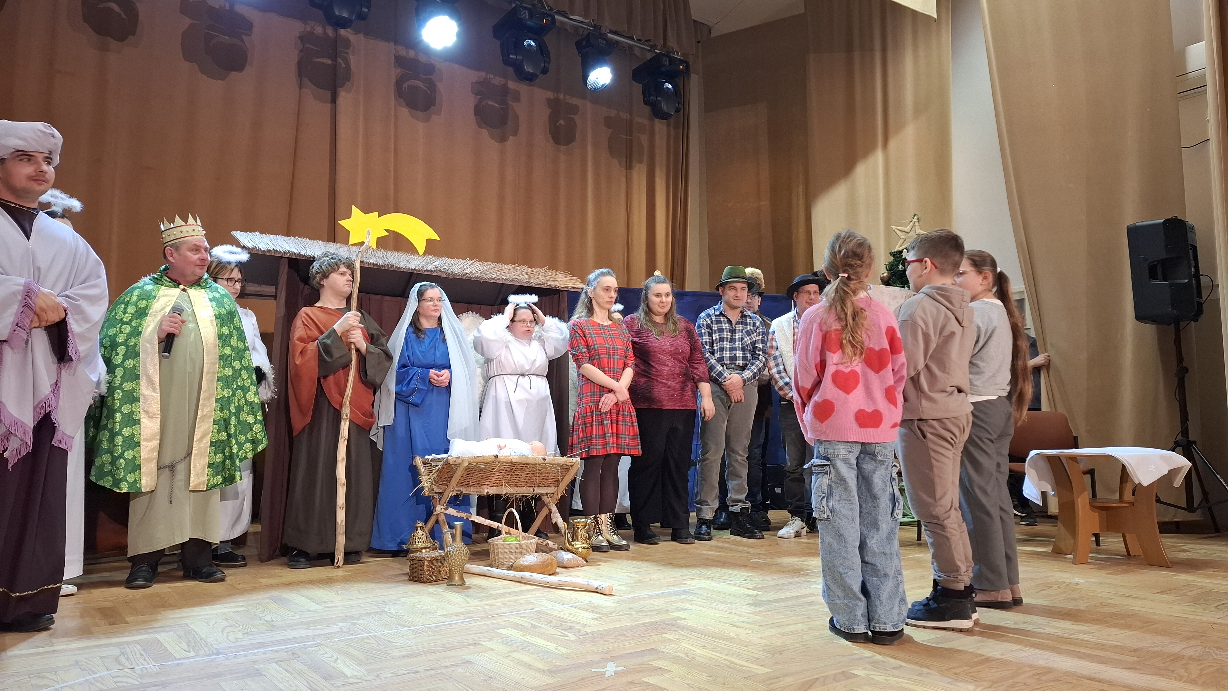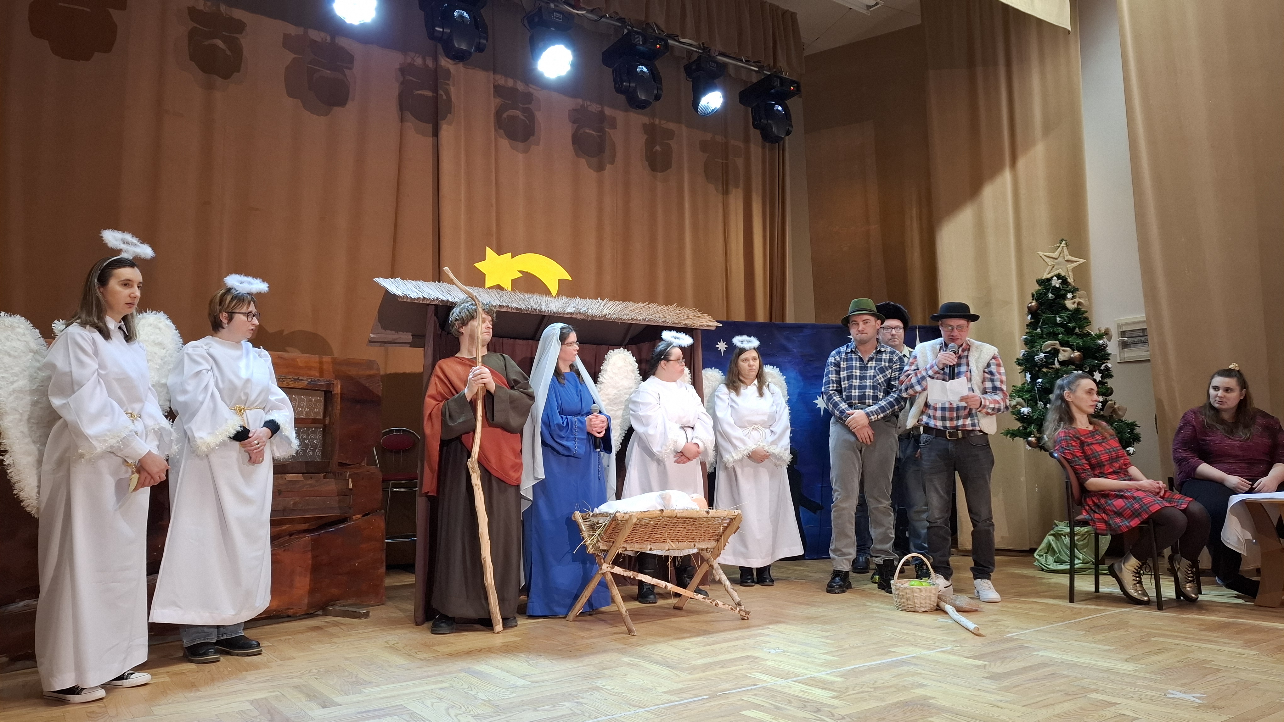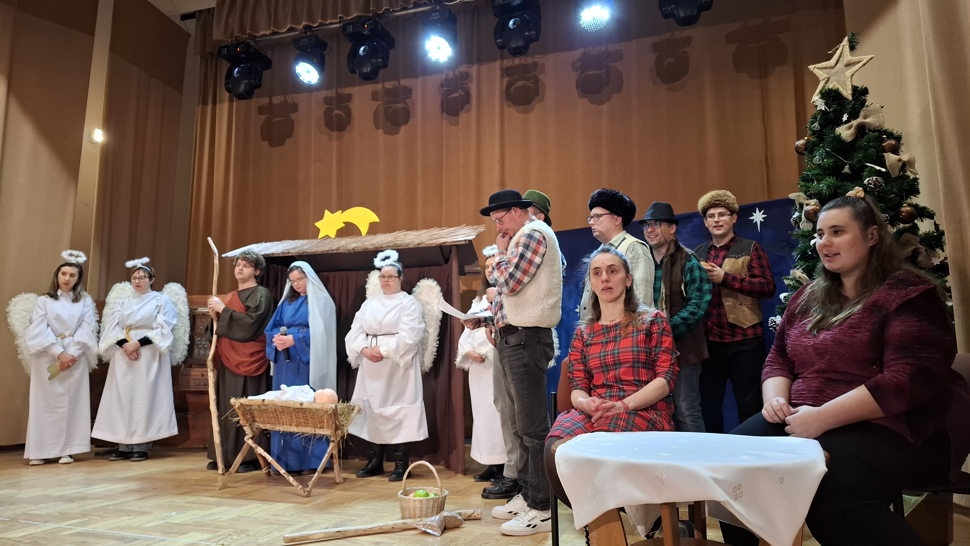 Na scenie wystąpili dorośli podopieczni WTZ, prezentując z dużym zaangażowaniem tradycyjną historię Bożego Narodzenia w formie inscenizacji teatralno-muzycznej. Aktorzy recytowali wiersze, wykonywali kolędy i pastorałki, tworząc refleksyjną atmosferę i przypominając widzom miniony świąteczny nastrój. Szczególnym momentem przedstawienia była scena rozmowy mamy z córką o istocie świąt, oczekiwaniu na pierwszą gwiazdkę oraz radości płynącej z bycia razem. W przedstawieniu pojawiły się charakterystyczne postacie jasełkowe, takie jak Józef, Maryja z Dzieciątkiem, pastuszkowie oraz Trzej Królowie, którzy w symboliczny sposób oddali hołd nowonarodzonemu Jezusowi. Spójna i pełna emocji inscenizacja została nagrodzona gromkimi brawami publiczności.