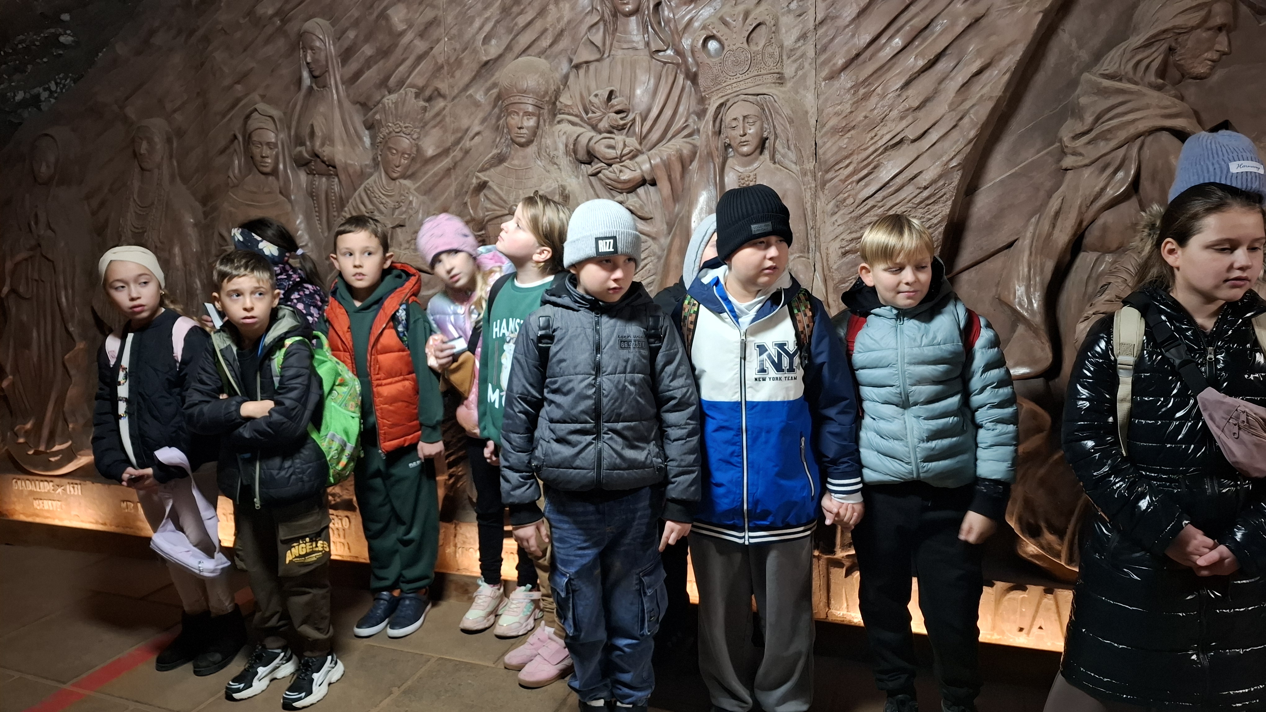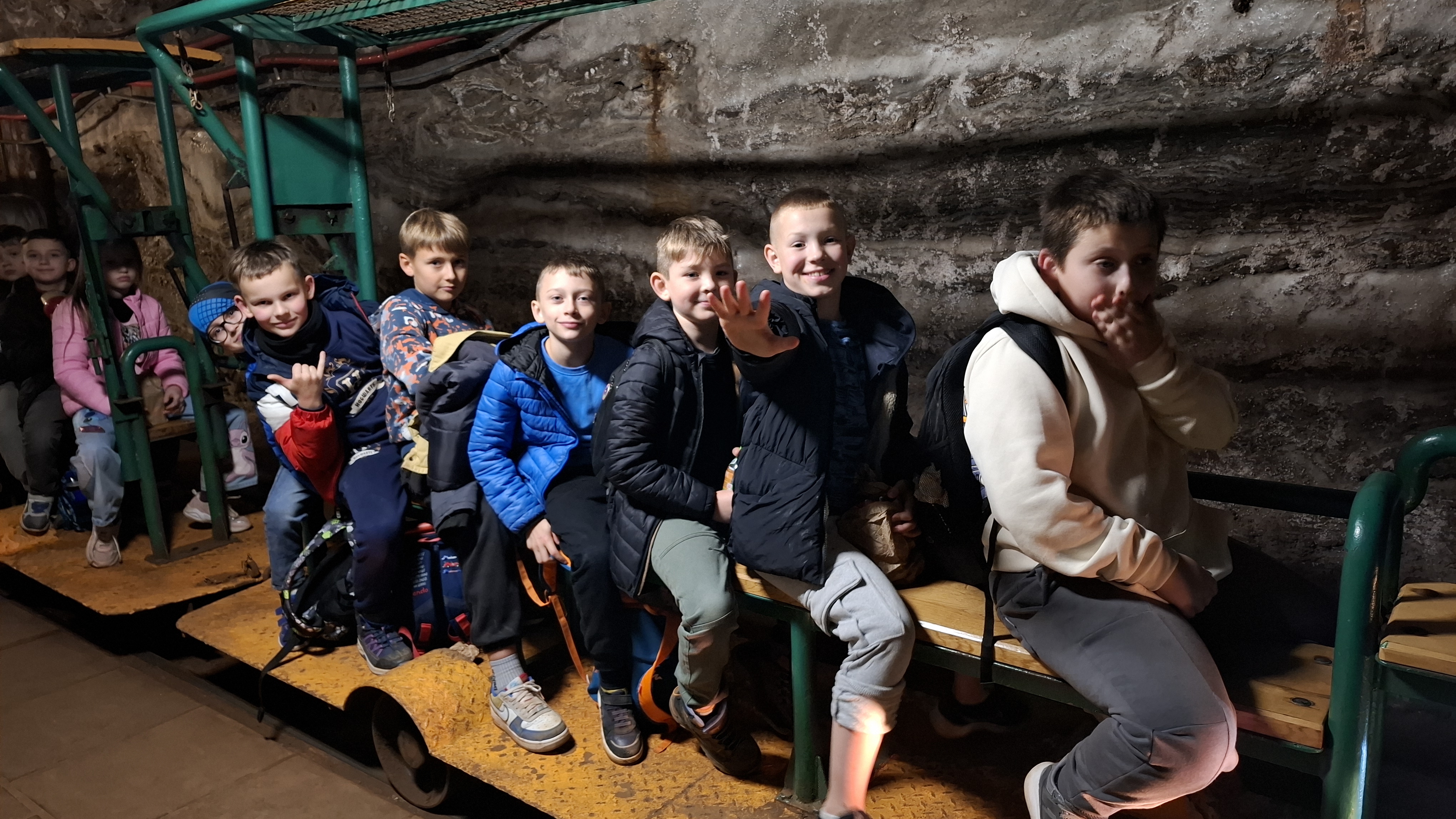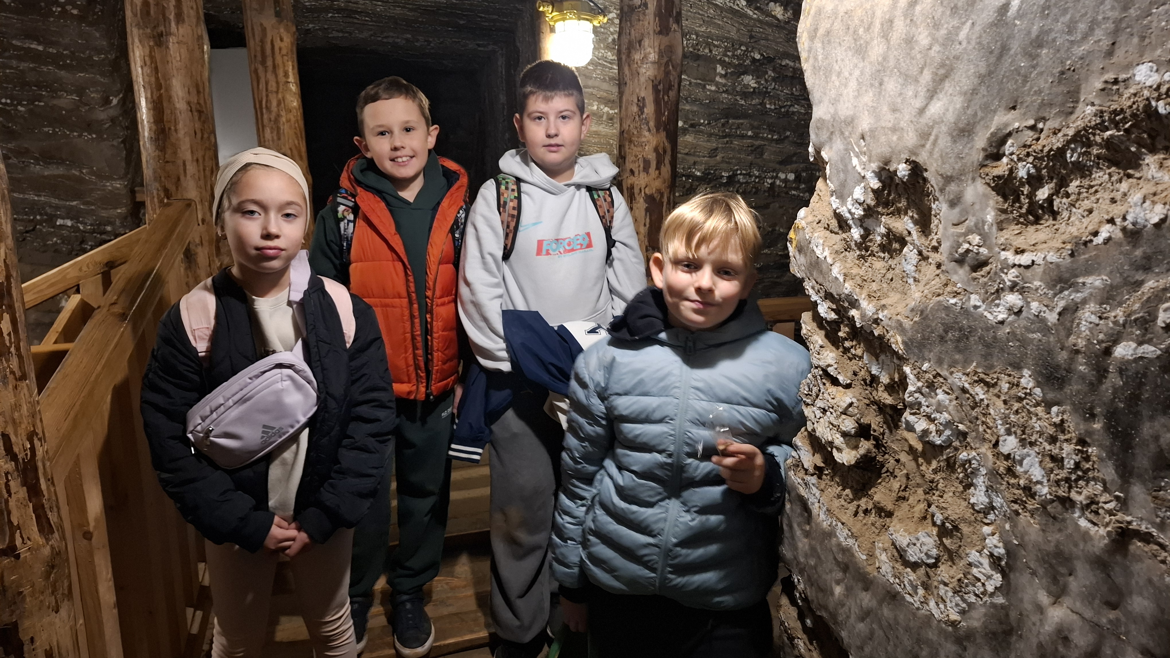 Prawdziwa przygoda rozpoczęła się po krótkim powitaniu przez przewodników – Doriana oraz Wojciecha. Już sam zjazd windą kilkadziesiąt metrów pod ziemię wywołał wiele emocji. Gdy drzwi się otworzyły, wszyscy znaleźli się w zupełnie innym świecie – chłodnym, tajemniczym i pełnym solnych korytarzy. Zwiedzanie rozpoczęło się od Podziemnej Ekspozycji Multimedialnej, która w nowoczesny i interaktywny sposób przeniosła wszystkich w przeszłość. Dzięki efektom świetlnym, dźwiękowym i animacjom uczniowie mogli poznać historię kopalni oraz dowiedzieć się, jak sól wpływała na rozwój Polski na przestrzeni wieków. Spotkali postacie historyczne, takie jak król Kazimierz Wielki czy żupnicy bocheńscy, którzy „opowiadali” o swojej pracy i „białym złocie – cennym surowcu, który przez wieki decydował o bogactwie królów i miast. W trakcie wędrówki podziemnymi korytarzami uczestnicy pokonali ponad 700 schodów, podziwiając po drodze piękne komory solne, rzeźby i dawne narzędzia pracy. Ogromną atrakcją okazała się podziemna przeprawa łodzią – jedyna taka w Europie! Płynąc solnym korytarzem, uczniowie mogli podziwiać niesamowite odbicia świateł na powierzchni wody i poczuć niezwykły klimat tego miejsca. Wielkie wrażenie zrobił przejazd podziemną kolejką oraz wizyta w kaplicy św. Kingi – patronki górników solnych – całkowicie wykutej w soli. W ciszy i półmroku można było podziwiać solne ołtarze i rzeźby, które powstały z ogromnym kunsztem i cierpliwością. Na zakończenie wycieczki każdy mógł kupić pamiątkę i spróbować solnego powietrza, które – jak mówili przewodnicy – ma właściwości zdrowotne.