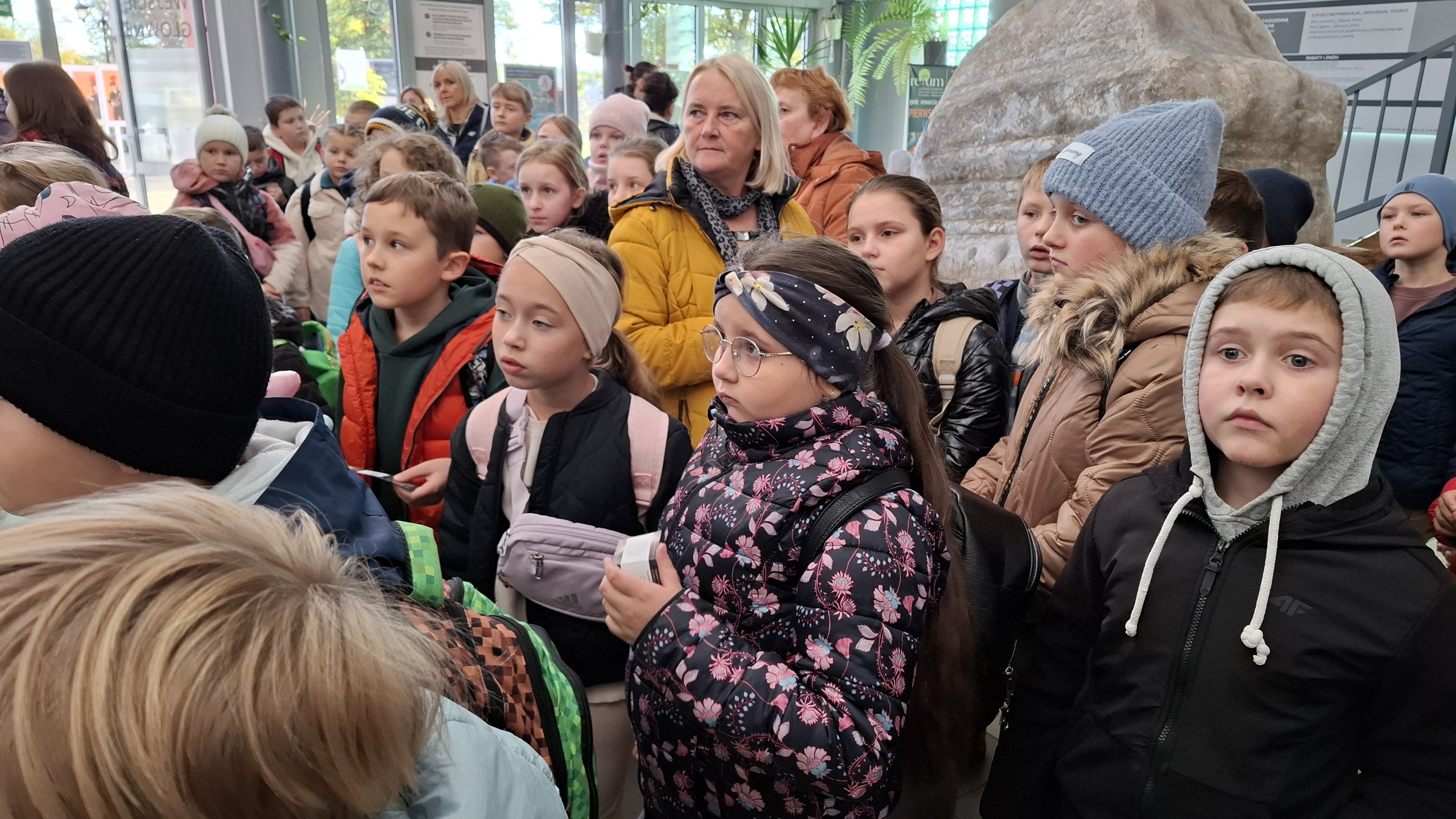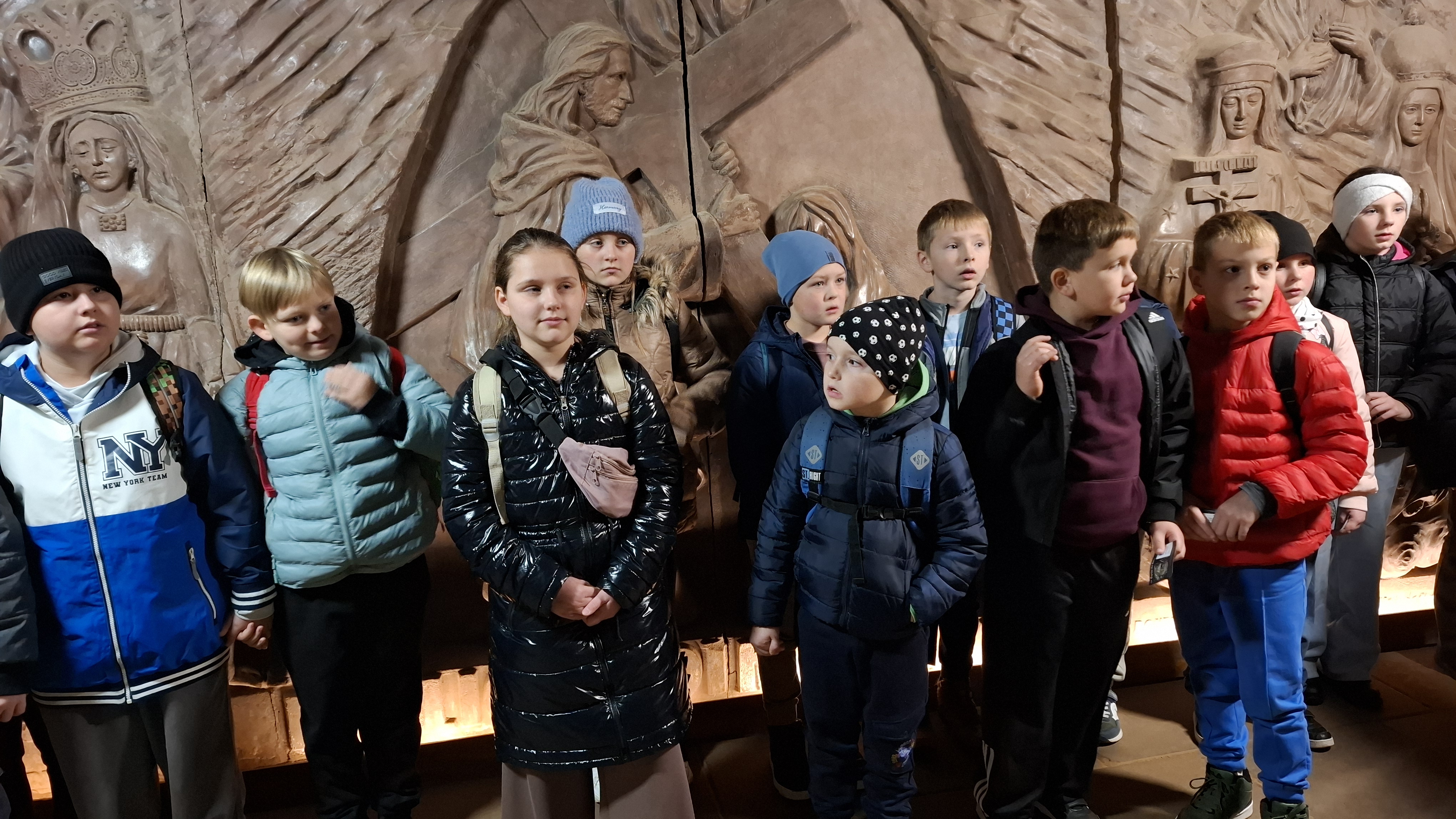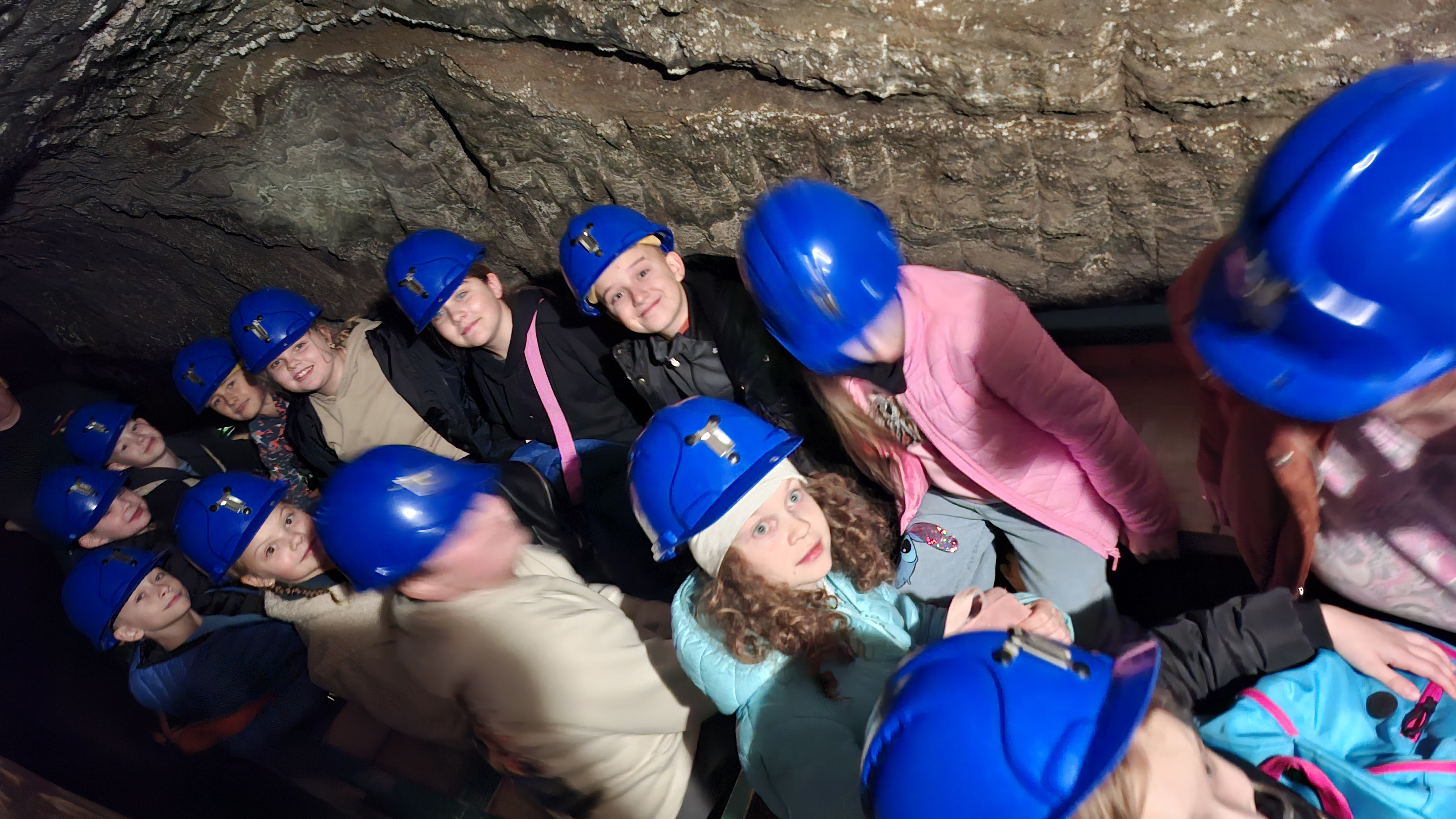 Prawdziwa przygoda rozpoczęła się po krótkim powitaniu przez przewodników – Doriana oraz Wojciecha. Już sam zjazd windą kilkadziesiąt metrów pod ziemię wywołał wiele emocji. Gdy drzwi się otworzyły, wszyscy znaleźli się w zupełnie innym świecie – chłodnym, tajemniczym i pełnym solnych korytarzy. Zwiedzanie rozpoczęło się od Podziemnej Ekspozycji Multimedialnej, która w nowoczesny i interaktywny sposób przeniosła wszystkich w przeszłość. Dzięki efektom świetlnym, dźwiękowym i animacjom uczniowie mogli poznać historię kopalni oraz dowiedzieć się, jak sól wpływała na rozwój Polski na przestrzeni wieków. Spotkali postacie historyczne, takie jak król Kazimierz Wielki czy żupnicy bocheńscy, którzy „opowiadali” o swojej pracy i „białym złocie – cennym surowcu, który przez wieki decydował o bogactwie królów i miast. W trakcie wędrówki podziemnymi korytarzami uczestnicy pokonali ponad 700 schodów, podziwiając po drodze piękne komory solne, rzeźby i dawne narzędzia pracy. Ogromną atrakcją okazała się podziemna przeprawa łodzią – jedyna taka w Europie! Płynąc solnym korytarzem, uczniowie mogli podziwiać niesamowite odbicia świateł na powierzchni wody i poczuć niezwykły klimat tego miejsca. Wielkie wrażenie zrobił przejazd podziemną kolejką oraz wizyta w kaplicy św. Kingi – patronki górników solnych – całkowicie wykutej w soli. W ciszy i półmroku można było podziwiać solne ołtarze i rzeźby, które powstały z ogromnym kunsztem i cierpliwością. Na zakończenie wycieczki każdy mógł kupić pamiątkę i spróbować solnego powietrza, które – jak mówili przewodnicy – ma właściwości zdrowotne.