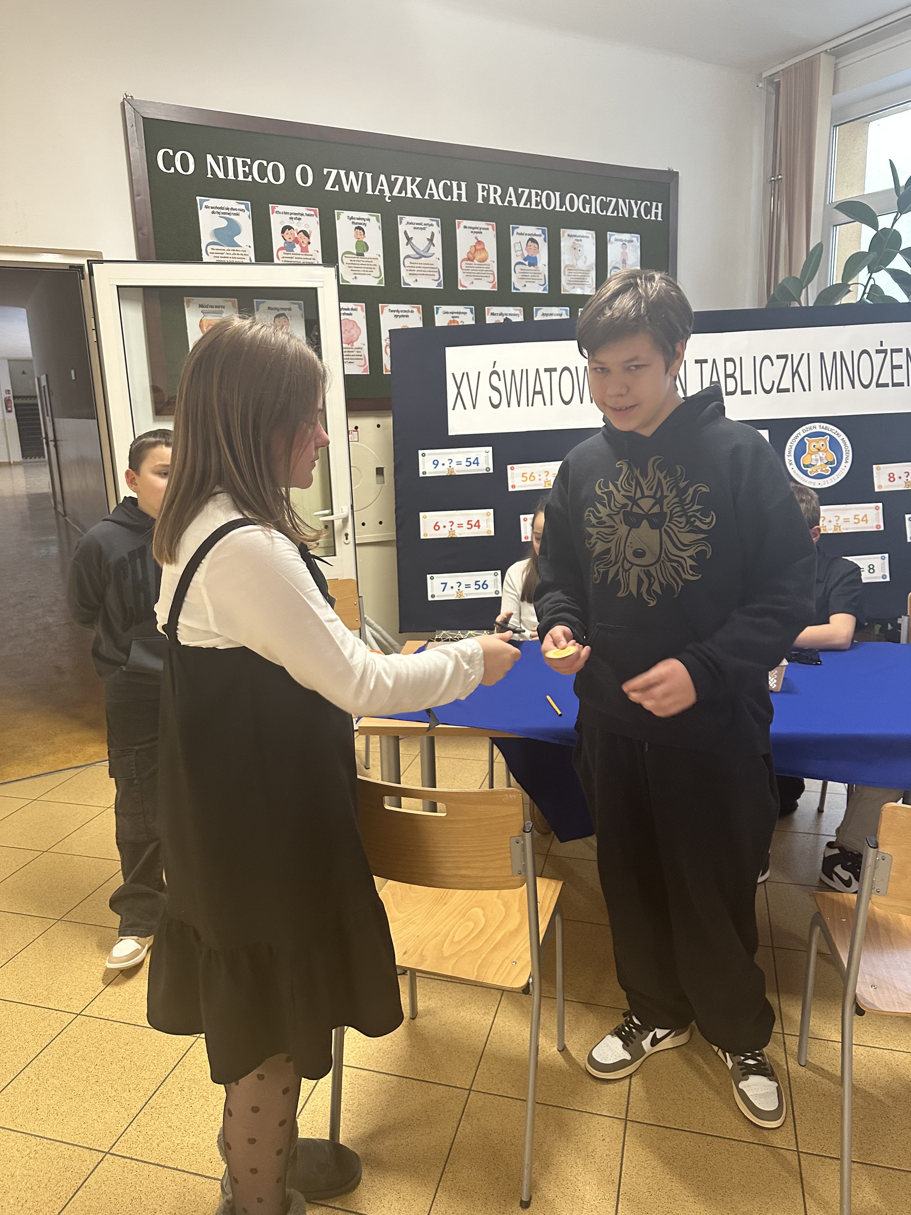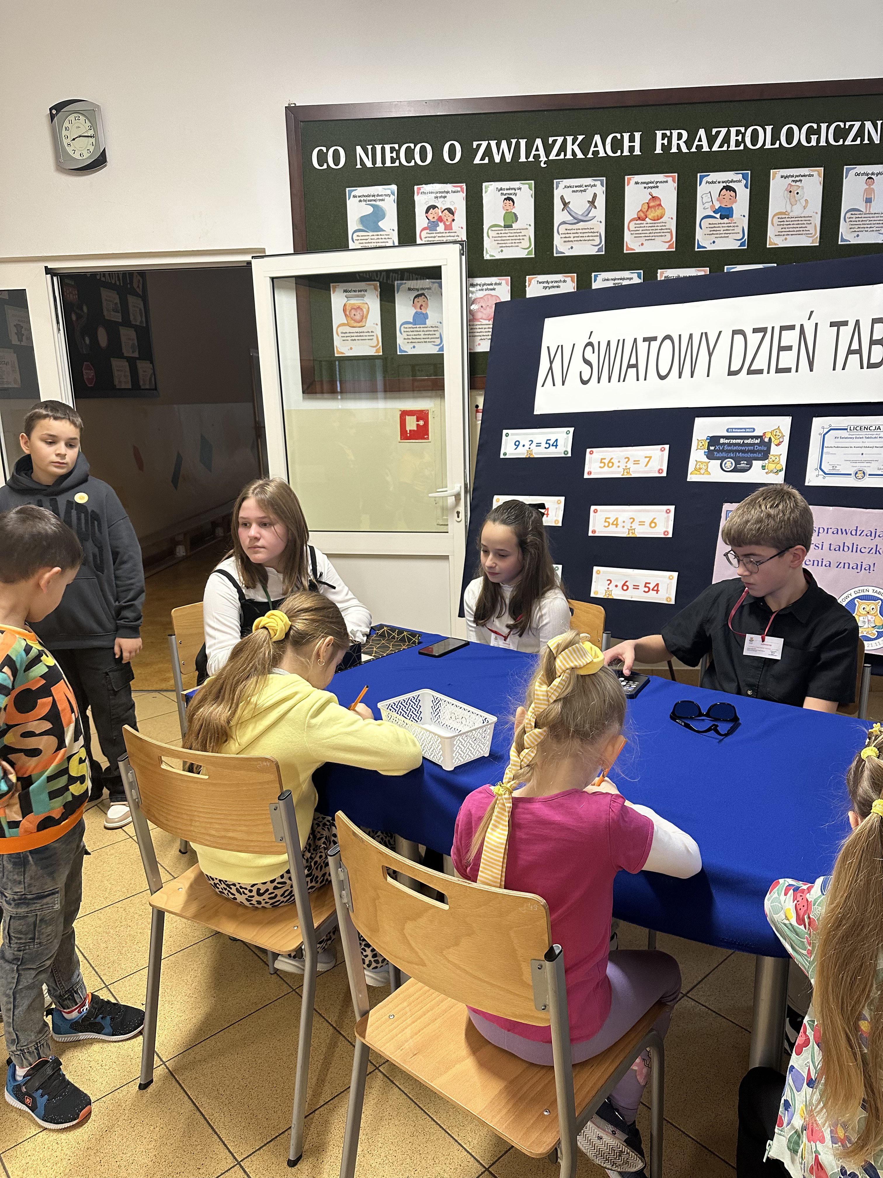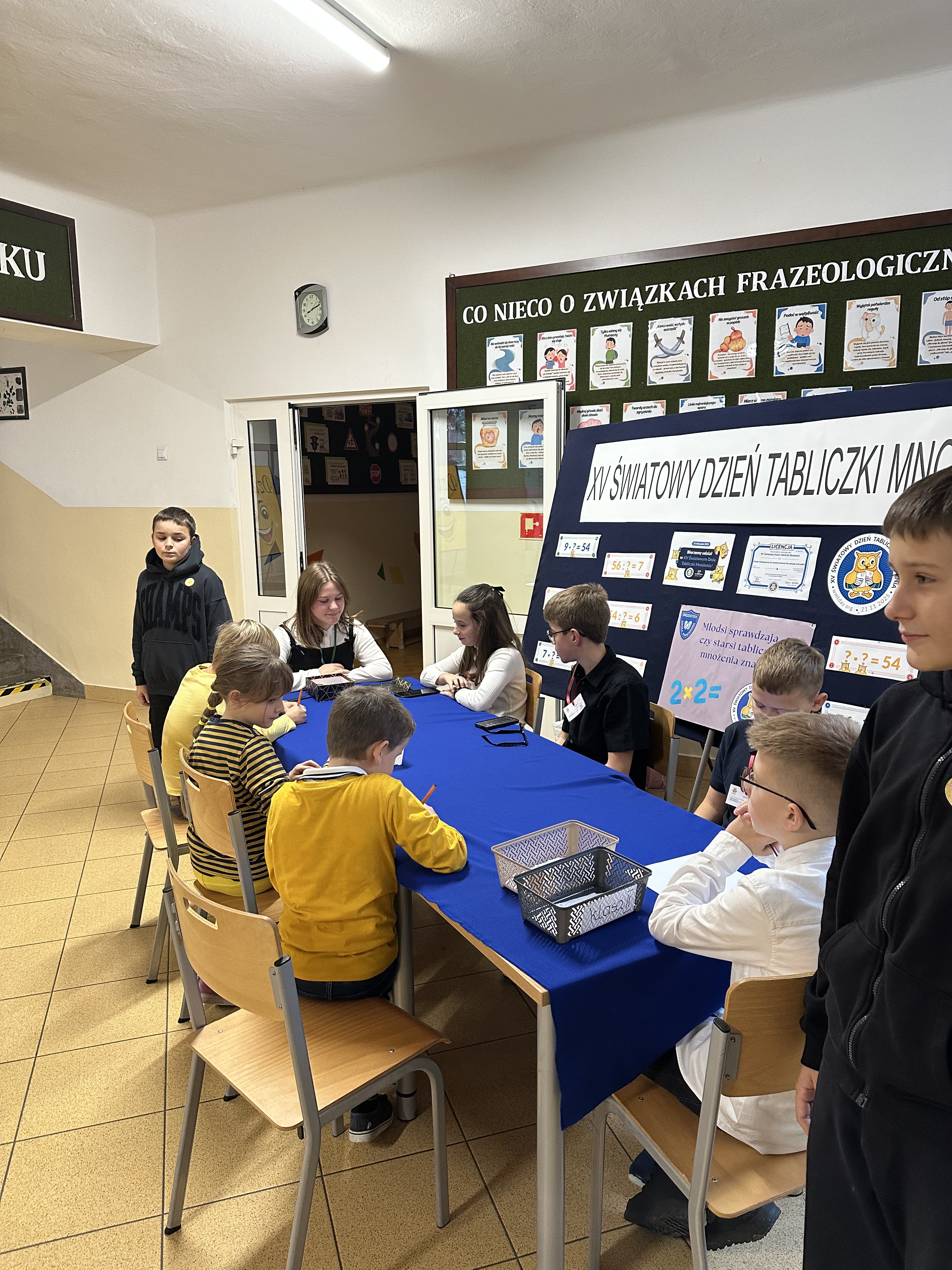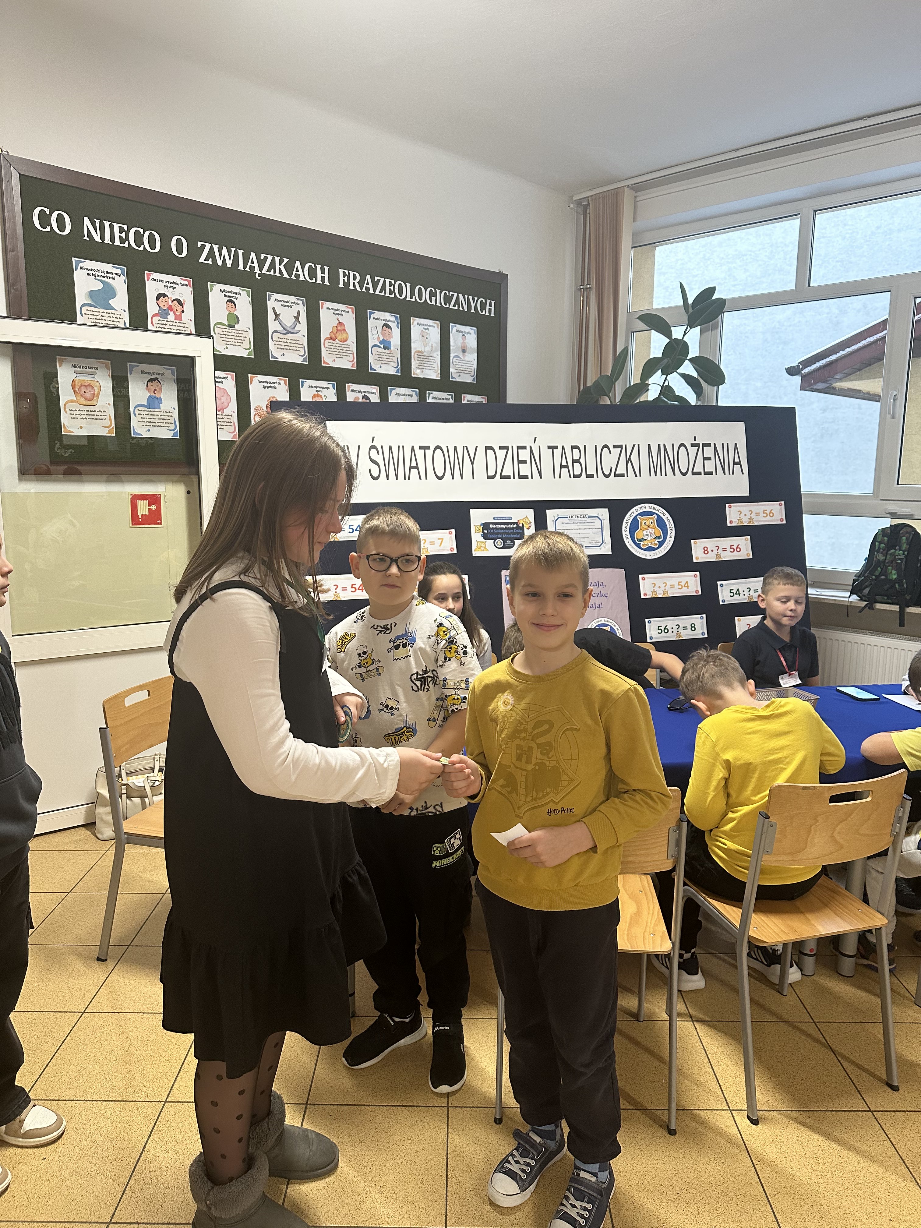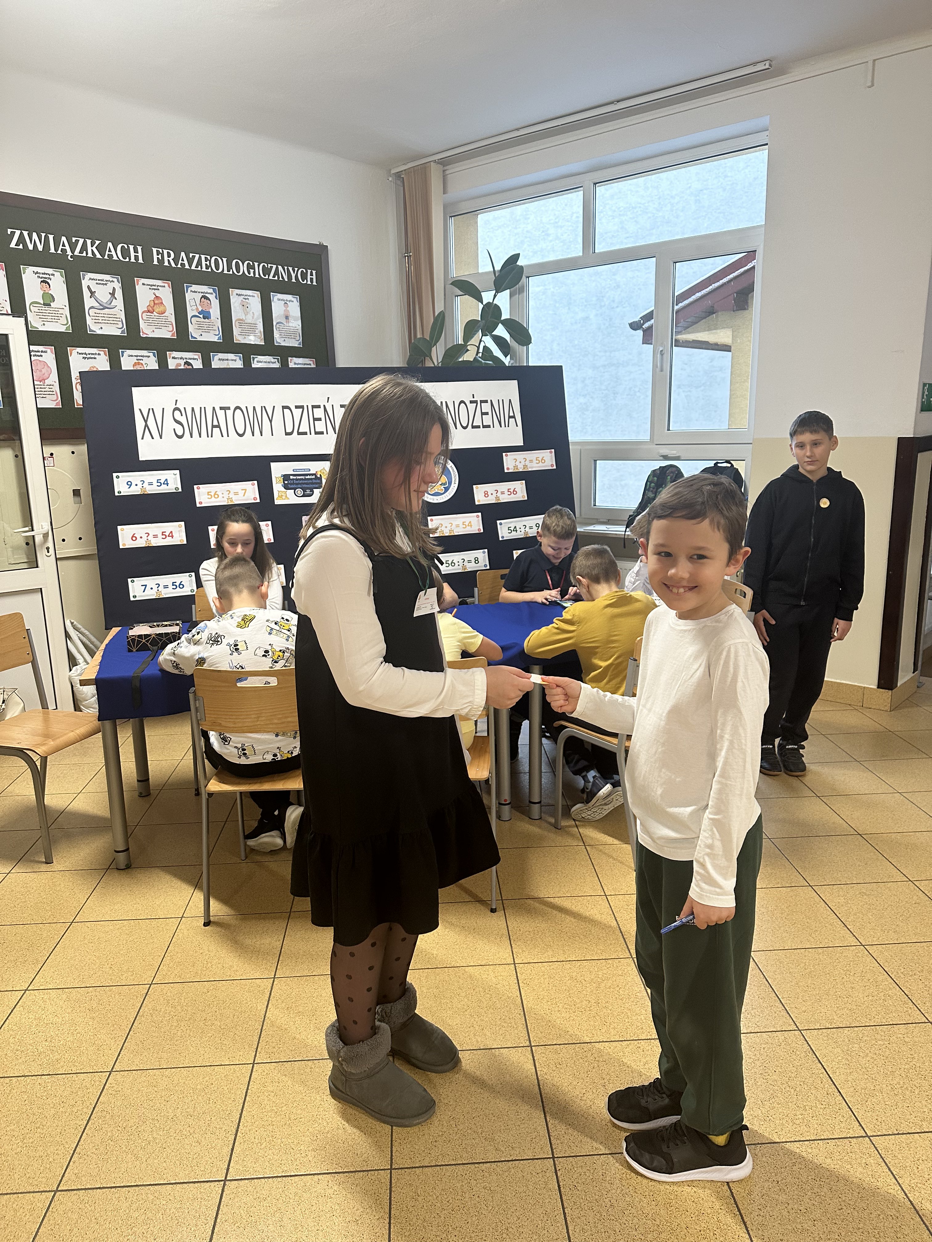 21 listopada w naszej szkole obchodziliśmy XV Światowy Dzień Tabliczki Mnożenia – wydarzenie, które od lat zachęca uczniów na całym świecie do przypomnienia sobie podstawowych faktów matematycznych w przyjemny i niecodzienny sposób. Hasłem akcji jest „Młodsi sprawdzają, czy starsi tabliczkę mnożenia znają”, dlatego tego dnia w nasze szkole na korytarzu szkolnym można było spotkać wyjątkowych egzaminatorów. Wyposażeni w losy z przykładami tabliczki mnożenia, egzaminowali nauczycieli, pracowników szkoły oraz uczniów klas starszych i młodszych. Każdy chętny mógł wziąć udział w krótkim, kilkuminutowym teście. Po prawidłowym rozwiązaniu pięciu przykładów uczestnicy otrzymywali naklejki Eksperta Tabliczki Mnożenia, co było dla nich dużą satysfakcją i powodem do dumy.