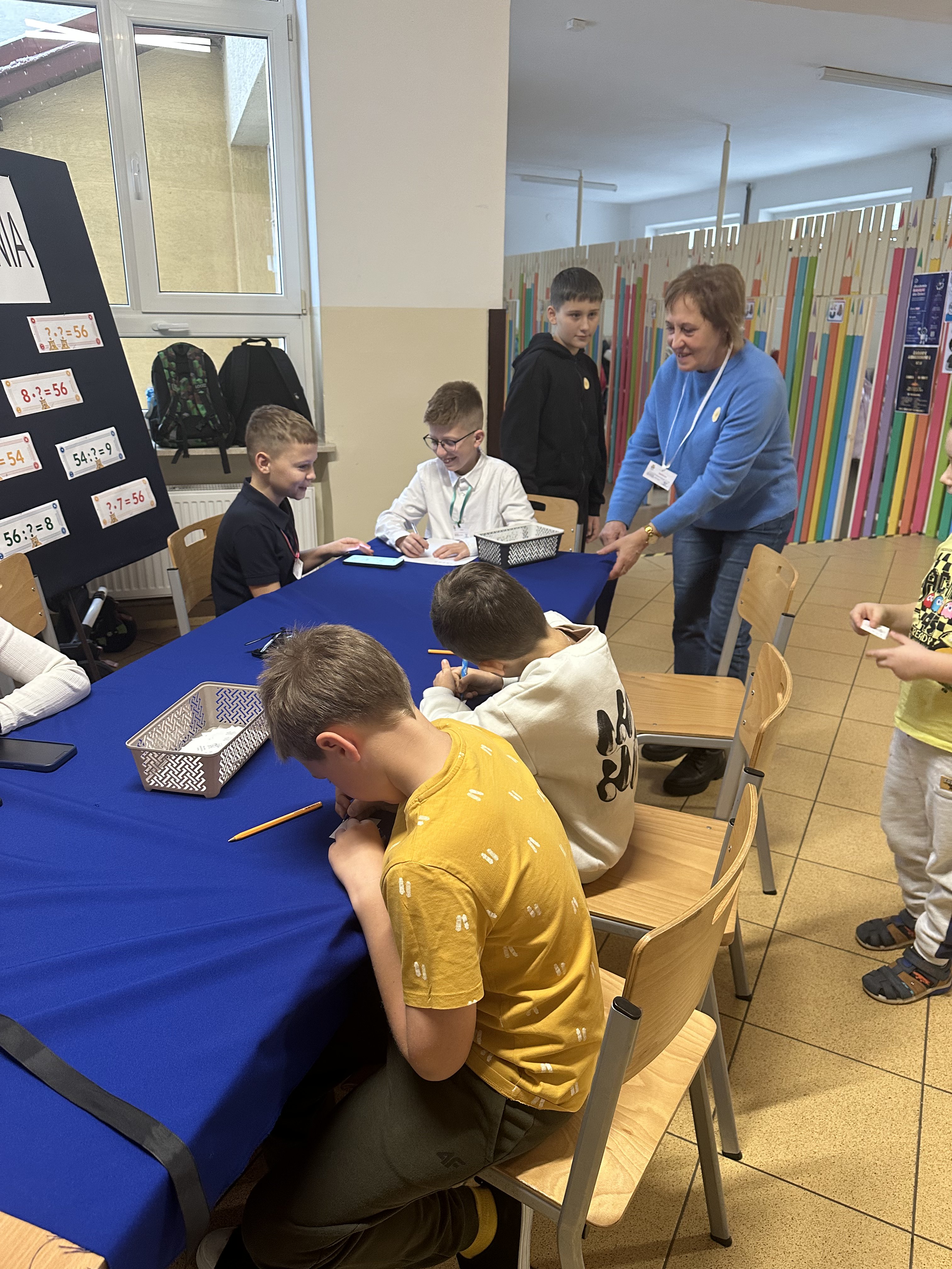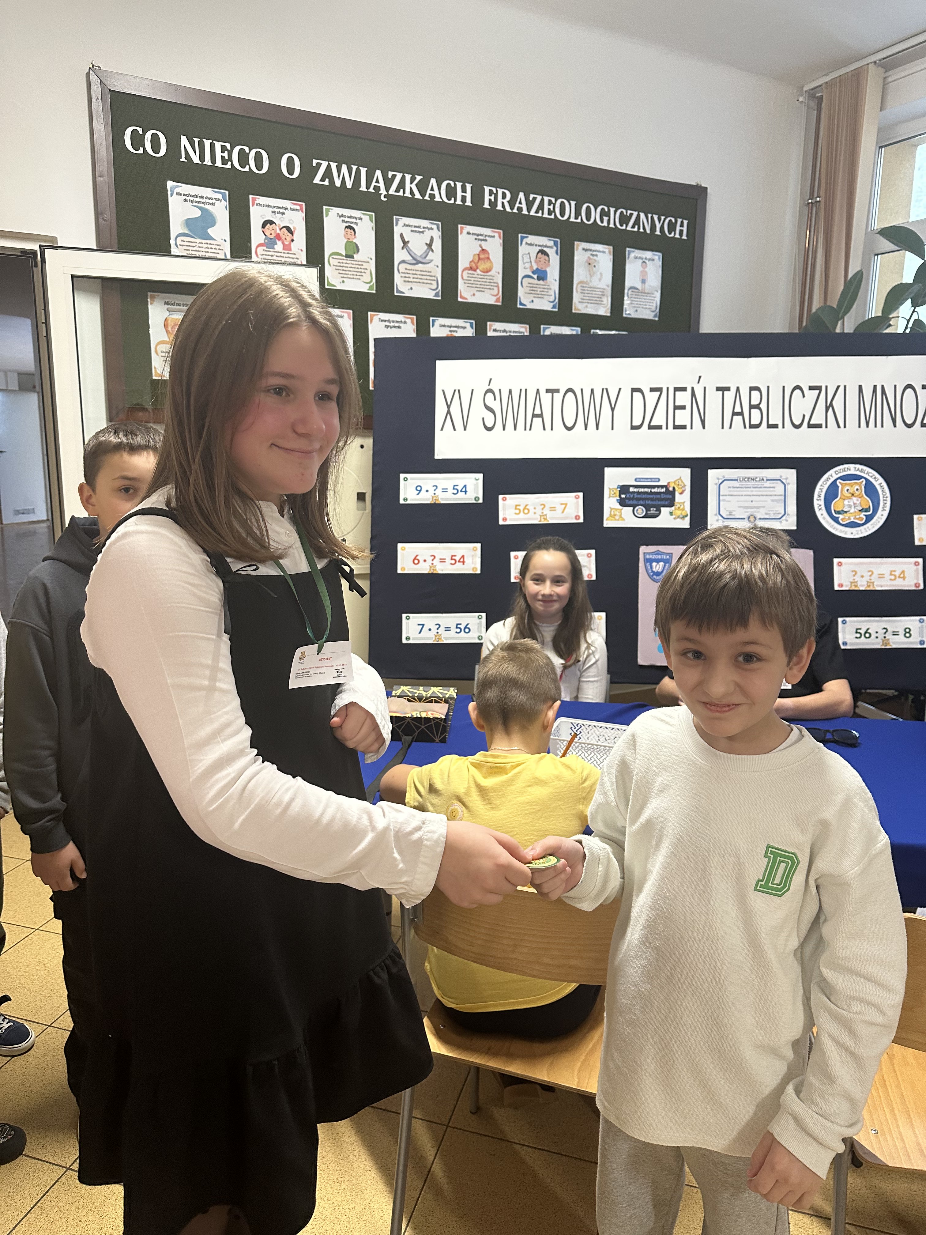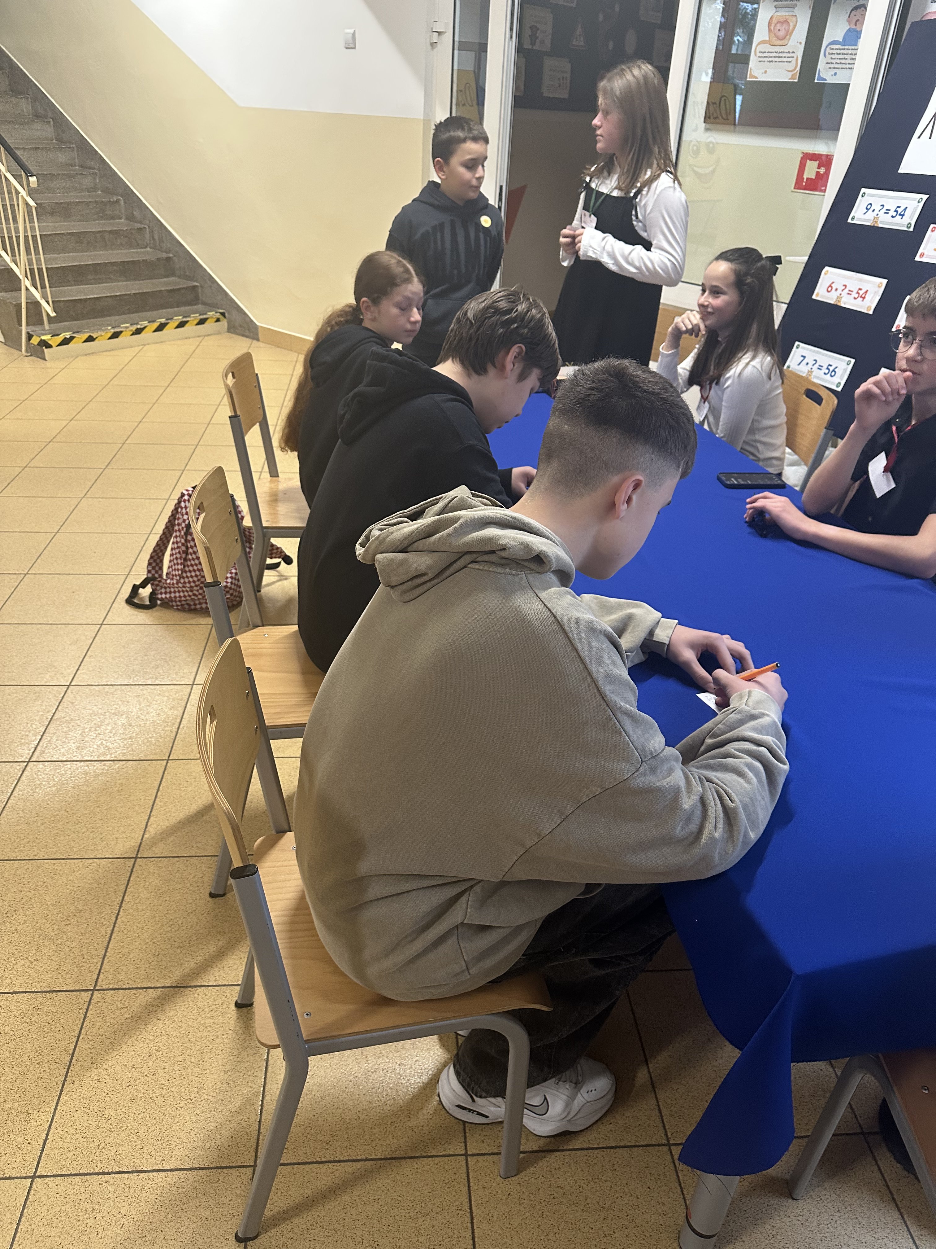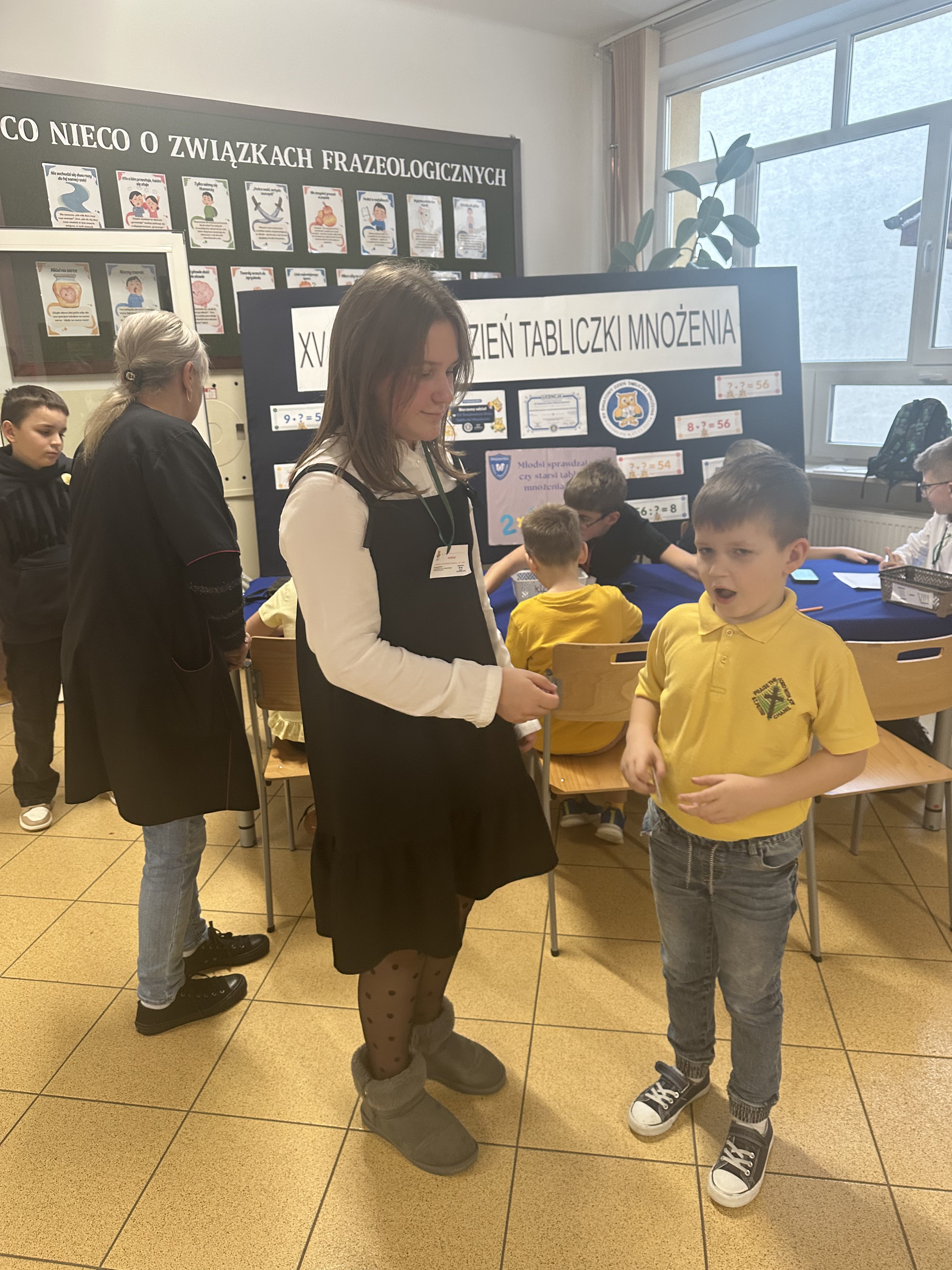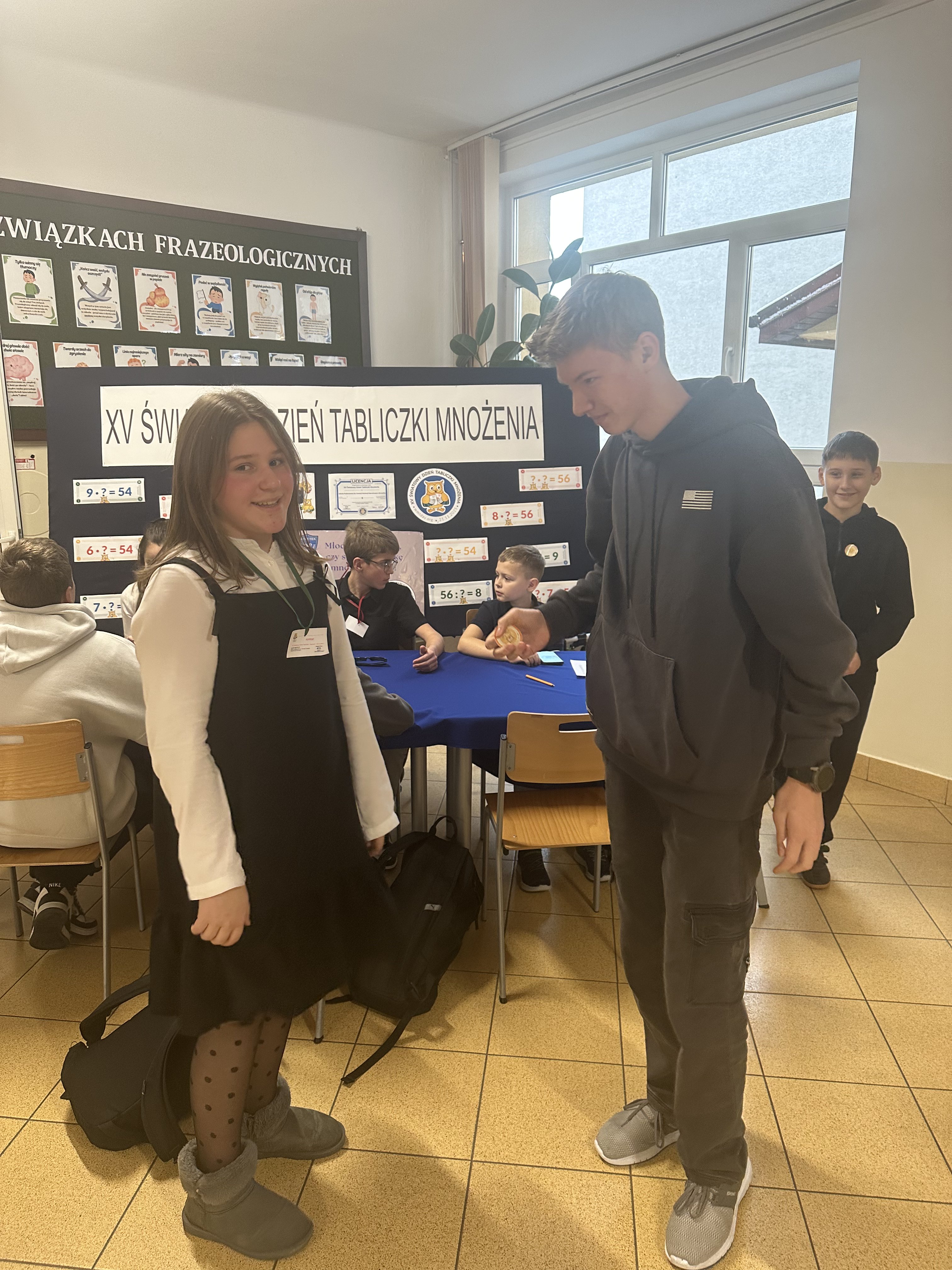 21 listopada w naszej szkole obchodziliśmy XV Światowy Dzień Tabliczki Mnożenia – wydarzenie, które od lat zachęca uczniów na całym świecie do przypomnienia sobie podstawowych faktów matematycznych w przyjemny i niecodzienny sposób. Hasłem akcji jest „Młodsi sprawdzają, czy starsi tabliczkę mnożenia znają”, dlatego tego dnia w nasze szkole na korytarzu szkolnym można było spotkać wyjątkowych egzaminatorów. Wyposażeni w losy z przykładami tabliczki mnożenia, egzaminowali nauczycieli, pracowników szkoły oraz uczniów klas starszych i młodszych. Każdy chętny mógł wziąć udział w krótkim, kilkuminutowym teście. Po prawidłowym rozwiązaniu pięciu przykładów uczestnicy otrzymywali naklejki Eksperta Tabliczki Mnożenia, co było dla nich dużą satysfakcją i powodem do dumy.
