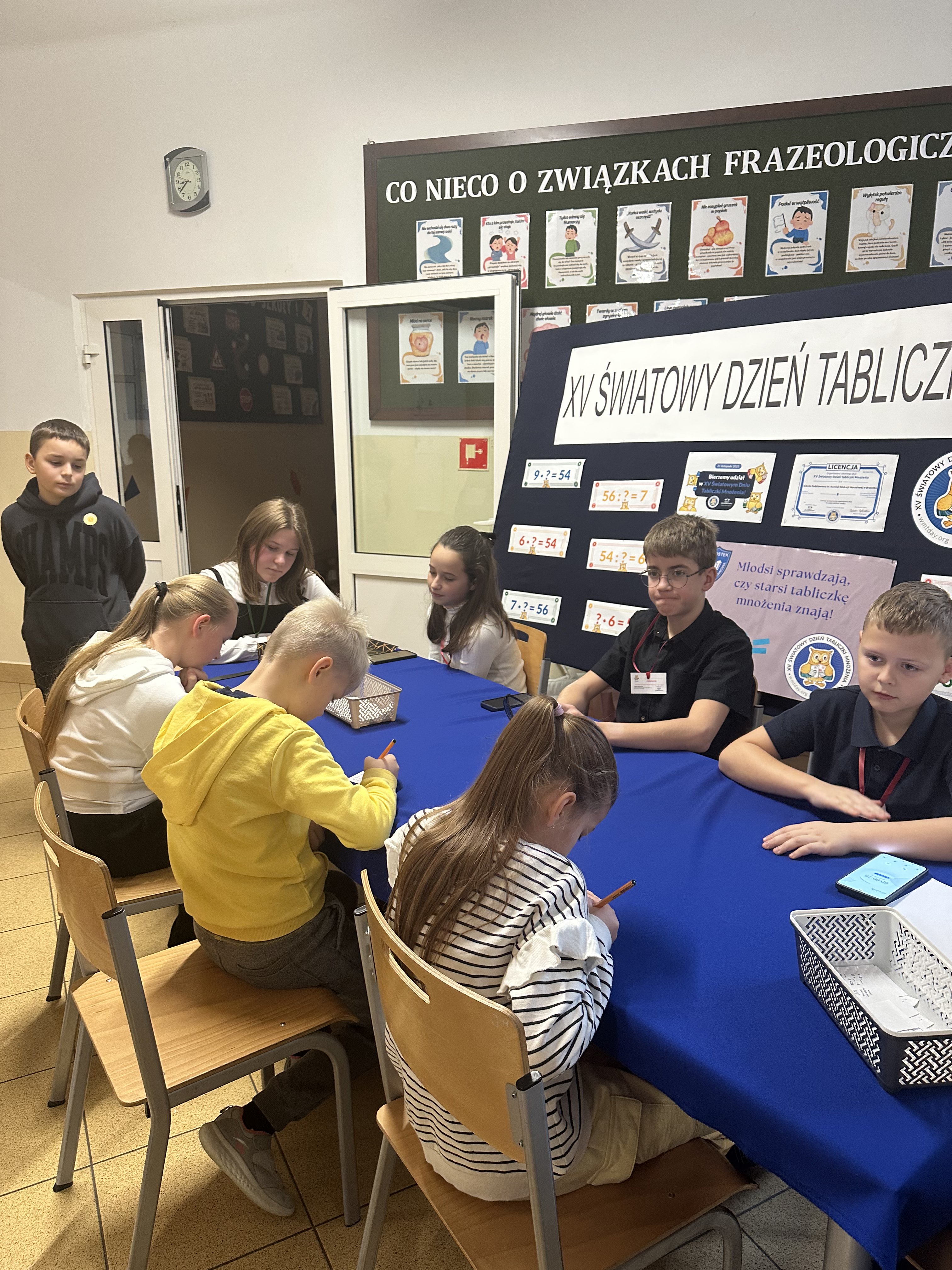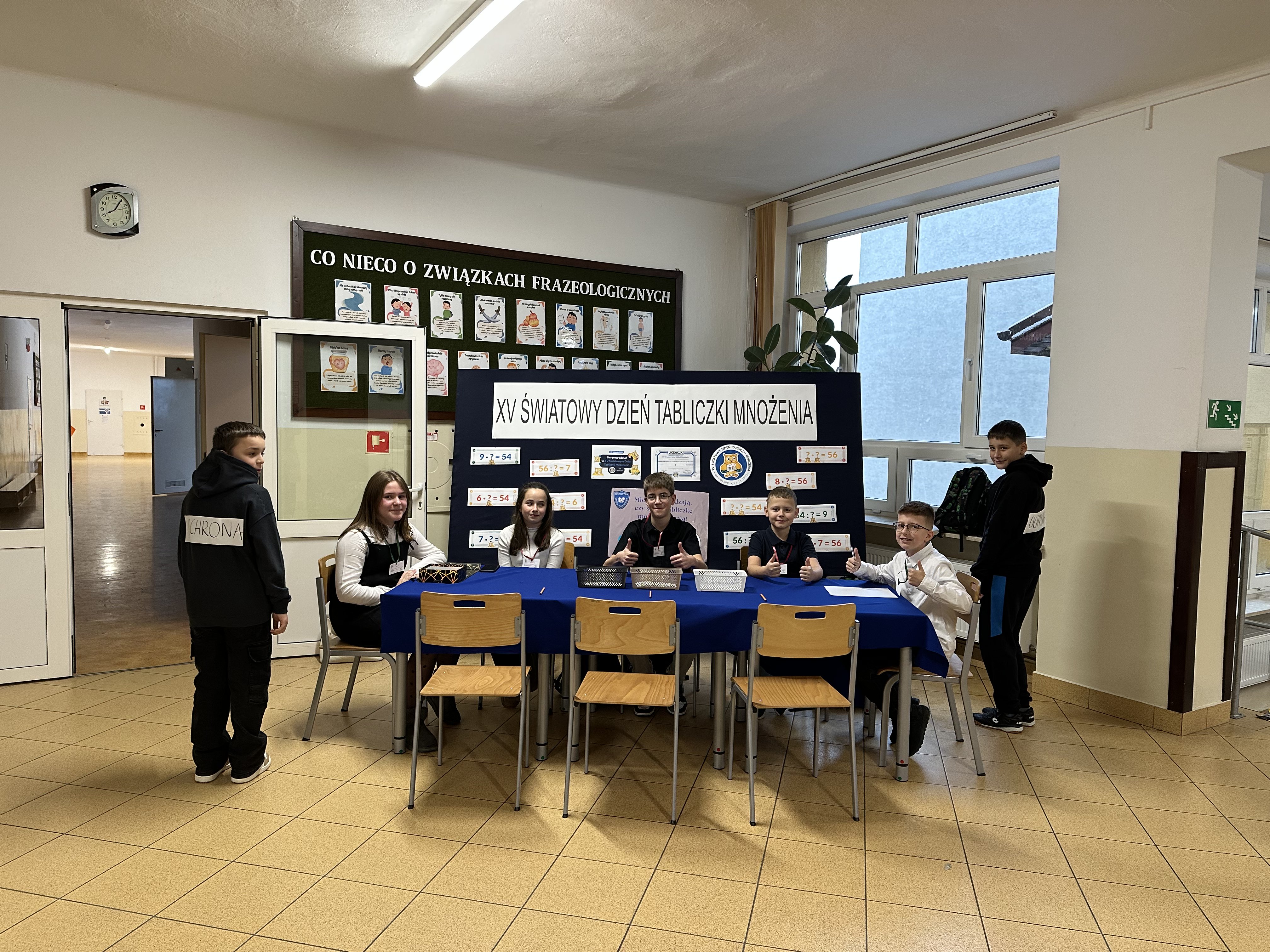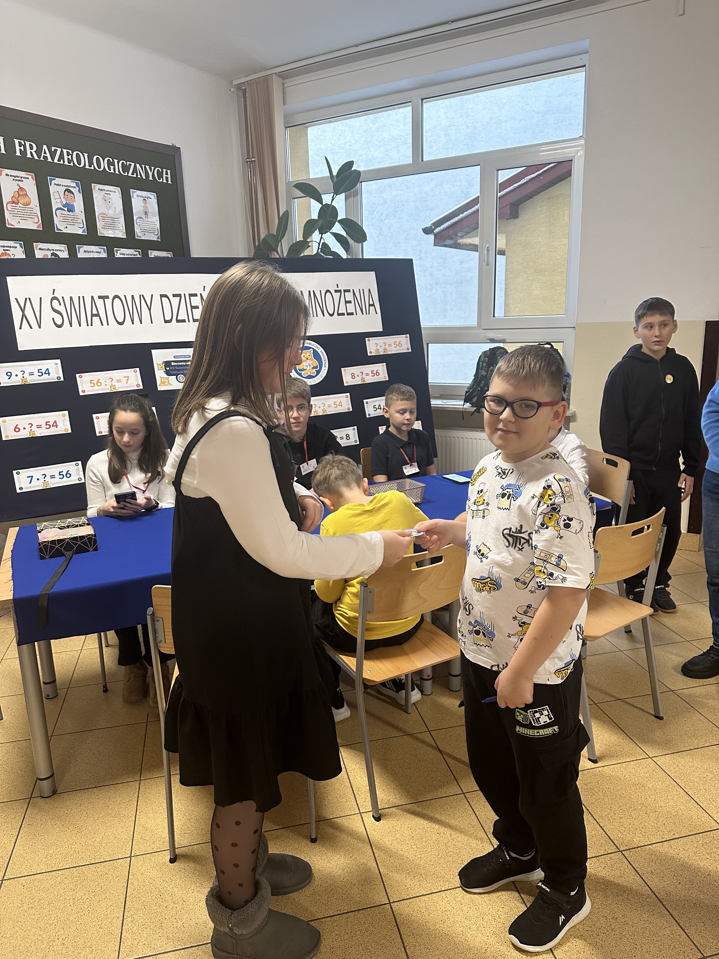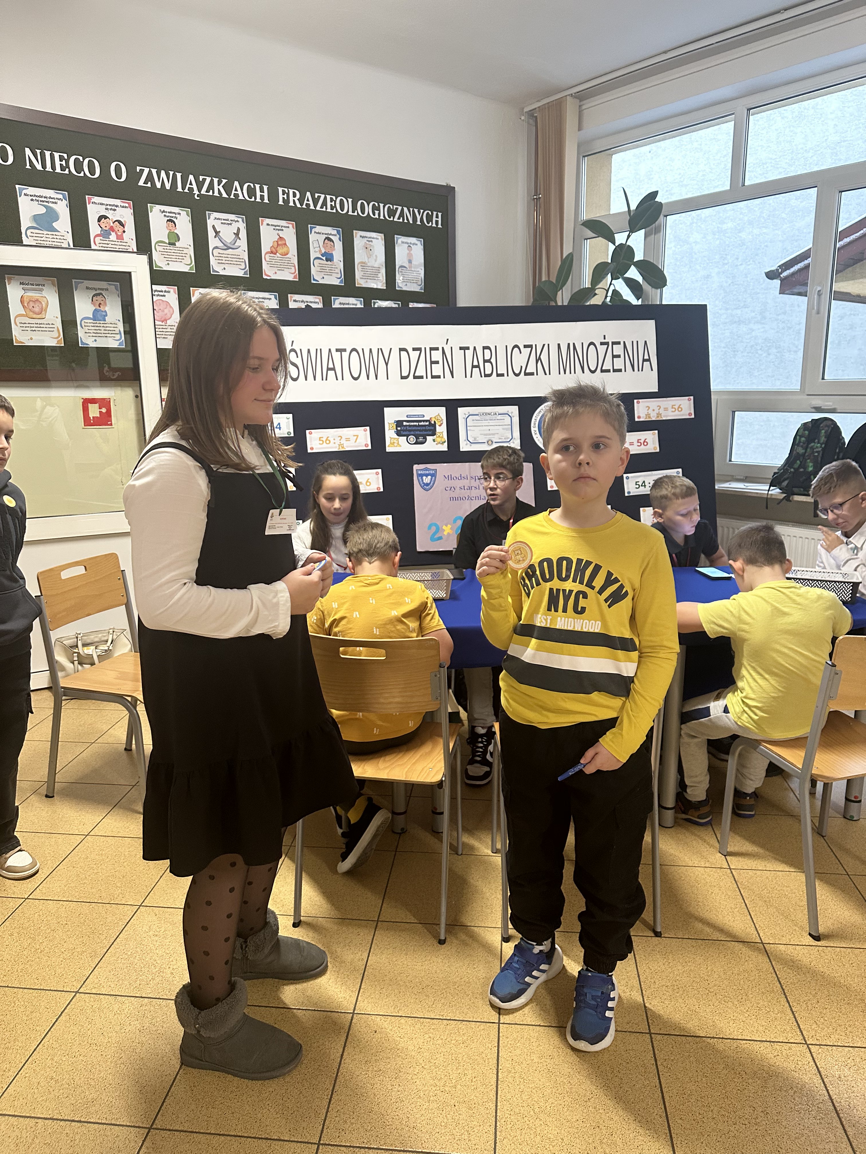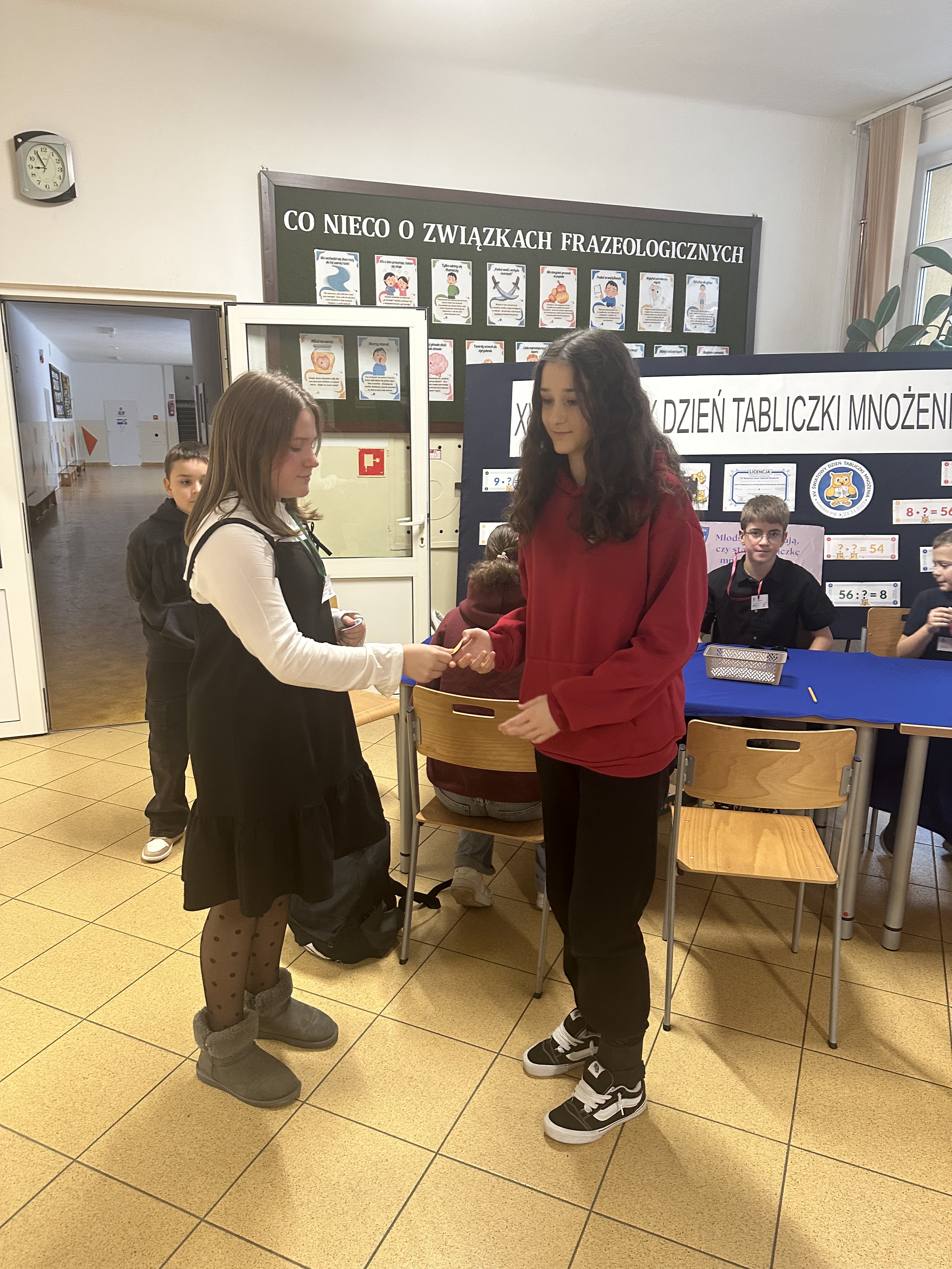 21 listopada w naszej szkole obchodziliśmy XV Światowy Dzień Tabliczki Mnożenia – wydarzenie, które od lat zachęca uczniów na całym świecie do przypomnienia sobie podstawowych faktów matematycznych w przyjemny i niecodzienny sposób. Hasłem akcji jest „Młodsi sprawdzają, czy starsi tabliczkę mnożenia znają”, dlatego tego dnia w nasze szkole na korytarzu szkolnym można było spotkać wyjątkowych egzaminatorów. Wyposażeni w losy z przykładami tabliczki mnożenia, egzaminowali nauczycieli, pracowników szkoły oraz uczniów klas starszych i młodszych. Każdy chętny mógł wziąć udział w krótkim, kilkuminutowym teście. Po prawidłowym rozwiązaniu pięciu przykładów uczestnicy otrzymywali naklejki Eksperta Tabliczki Mnożenia, co było dla nich dużą satysfakcją i powodem do dumy.
