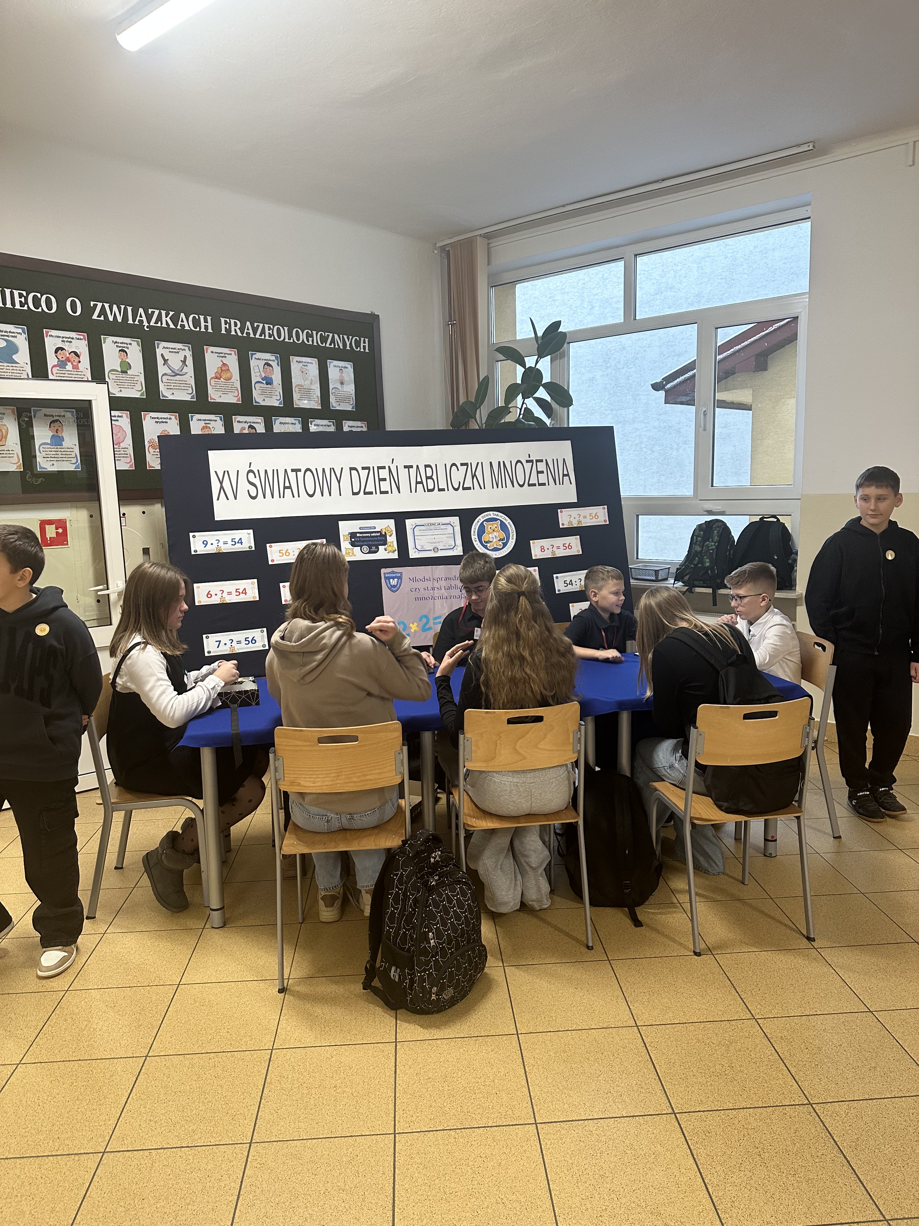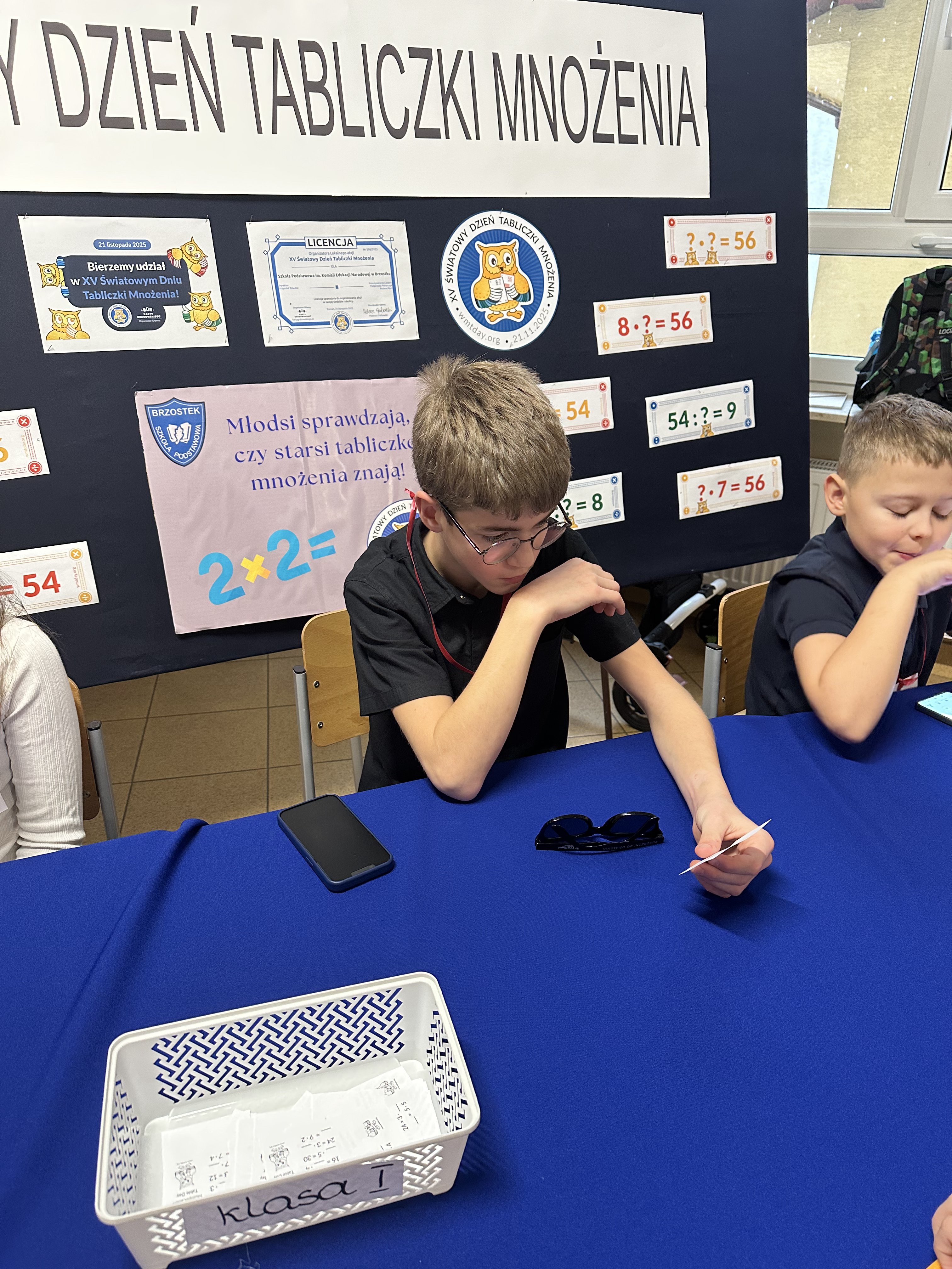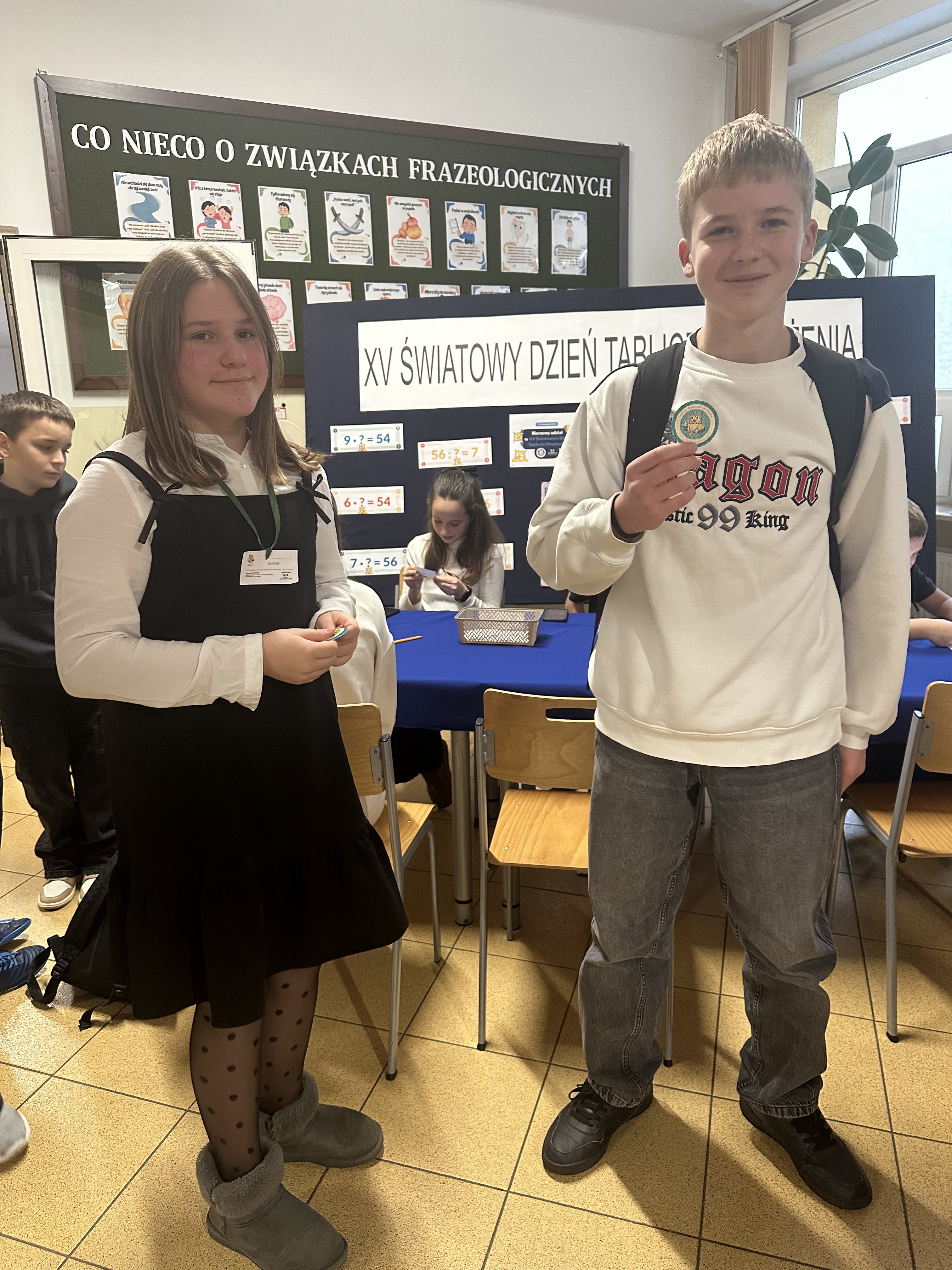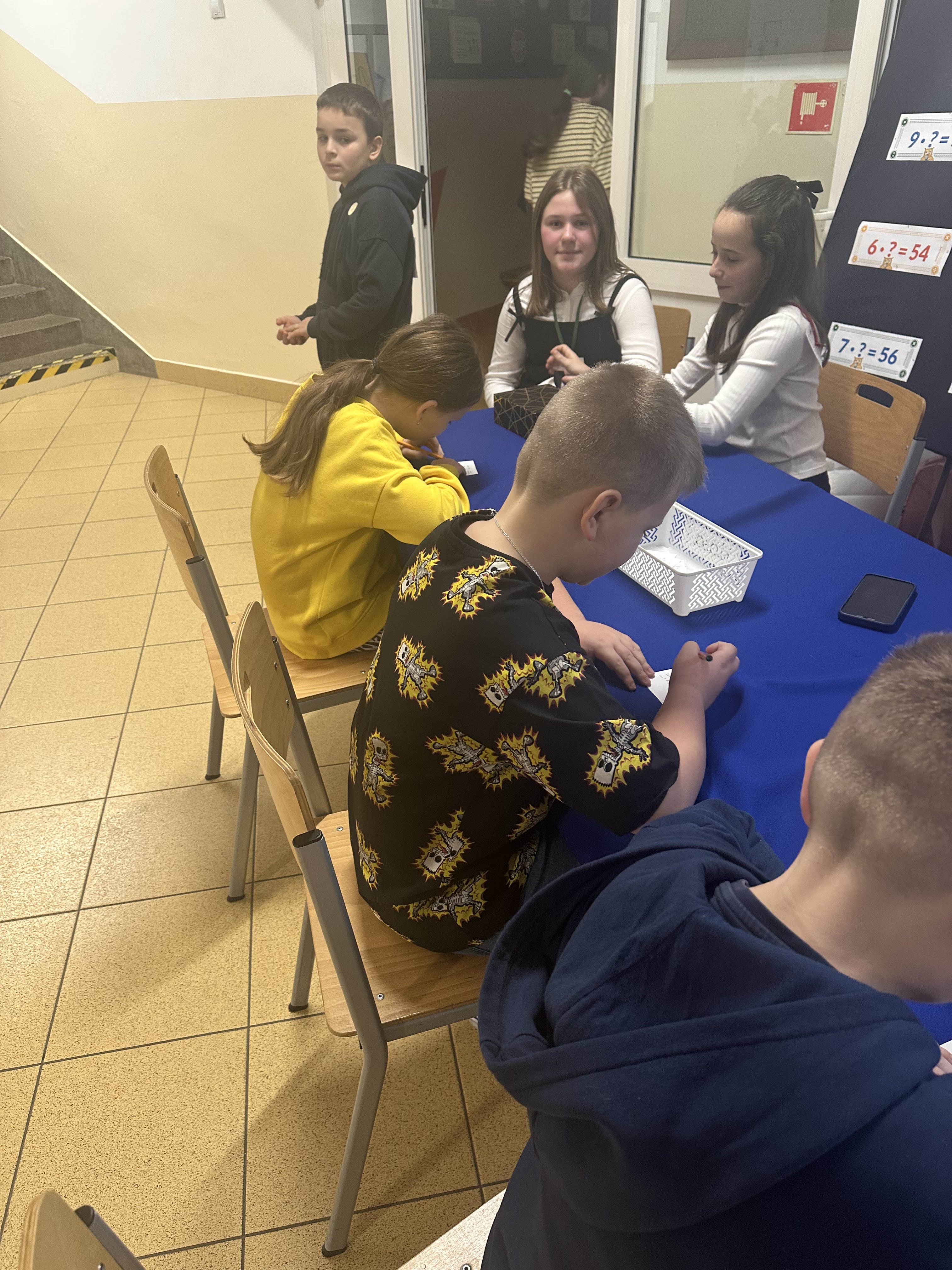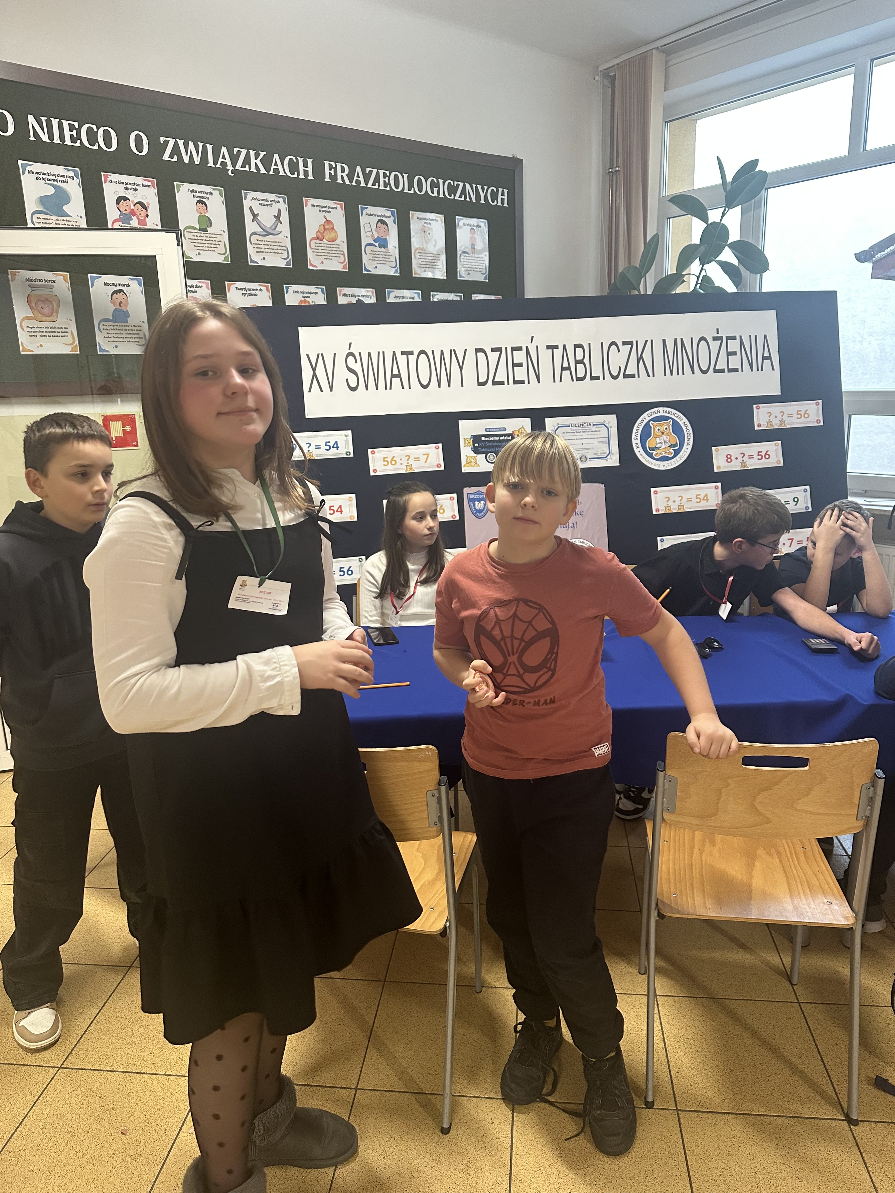 21 listopada w naszej szkole obchodziliśmy XV Światowy Dzień Tabliczki Mnożenia – wydarzenie, które od lat zachęca uczniów na całym świecie do przypomnienia sobie podstawowych faktów matematycznych w przyjemny i niecodzienny sposób. Hasłem akcji jest „Młodsi sprawdzają, czy starsi tabliczkę mnożenia znają”, dlatego tego dnia w nasze szkole na korytarzu szkolnym można było spotkać wyjątkowych egzaminatorów. Wyposażeni w losy z przykładami tabliczki mnożenia, egzaminowali nauczycieli, pracowników szkoły oraz uczniów klas starszych i młodszych. Każdy chętny mógł wziąć udział w krótkim, kilkuminutowym teście. Po prawidłowym rozwiązaniu pięciu przykładów uczestnicy otrzymywali naklejki Eksperta Tabliczki Mnożenia, co było dla nich dużą satysfakcją i powodem do dumy.