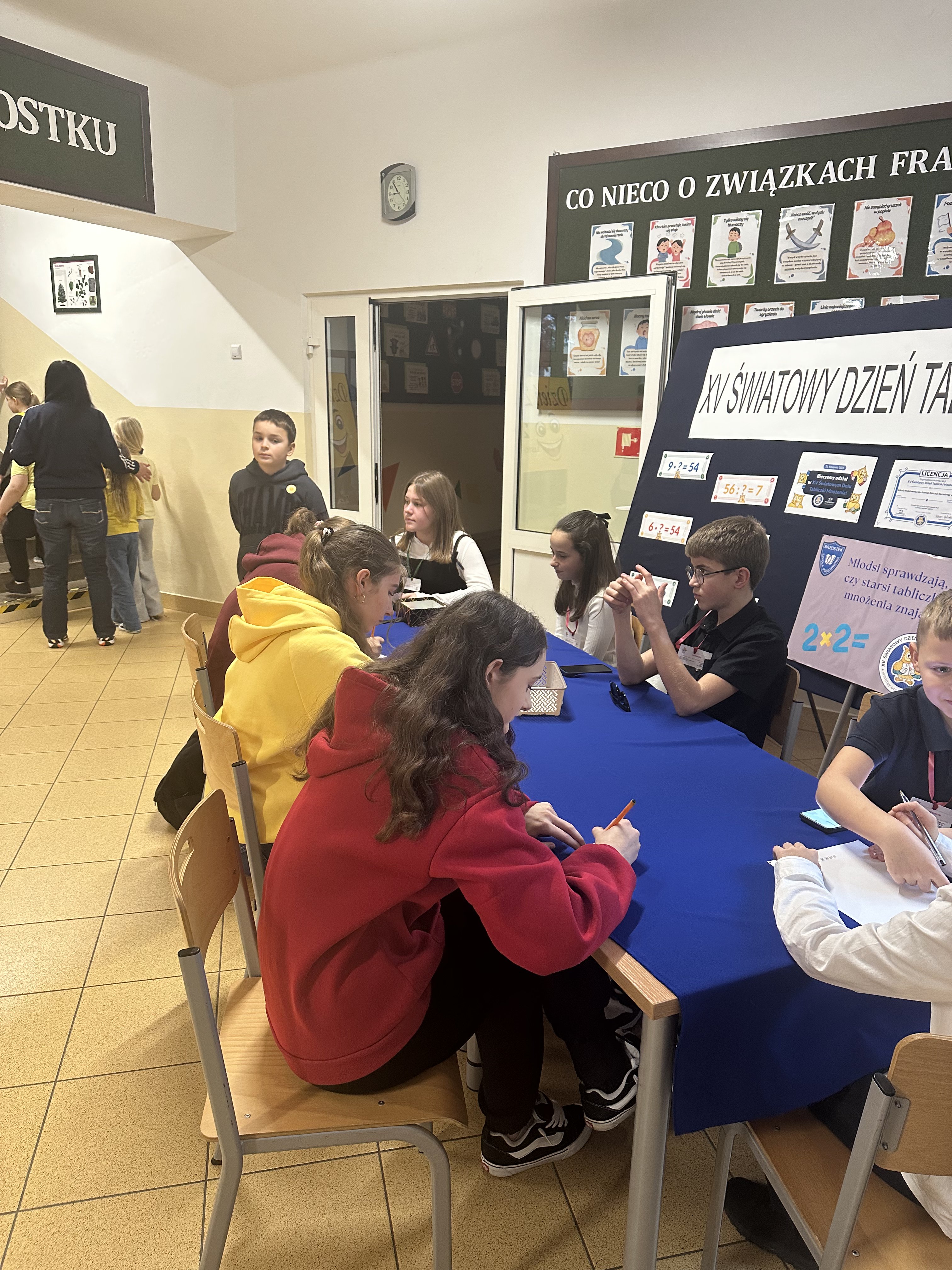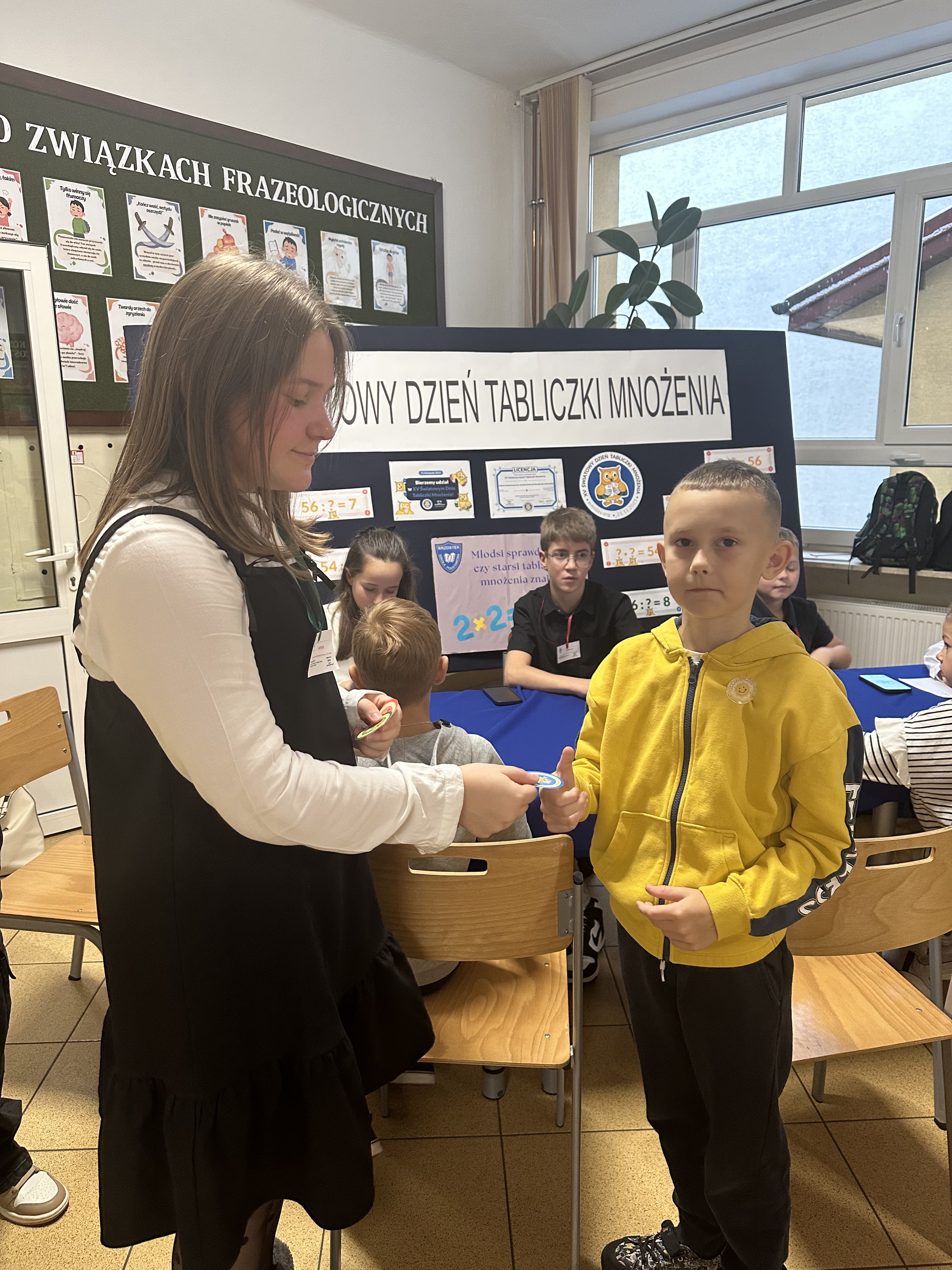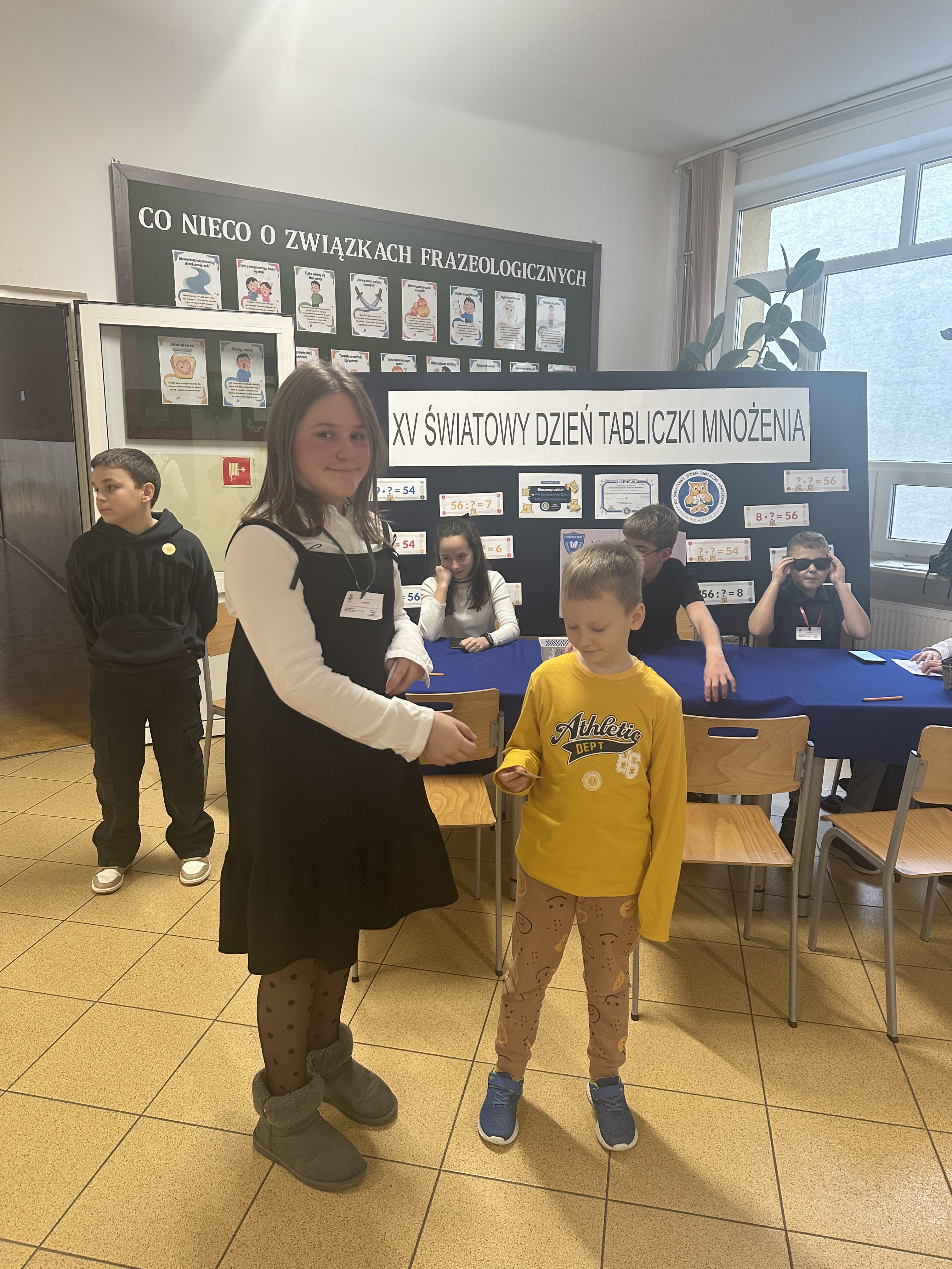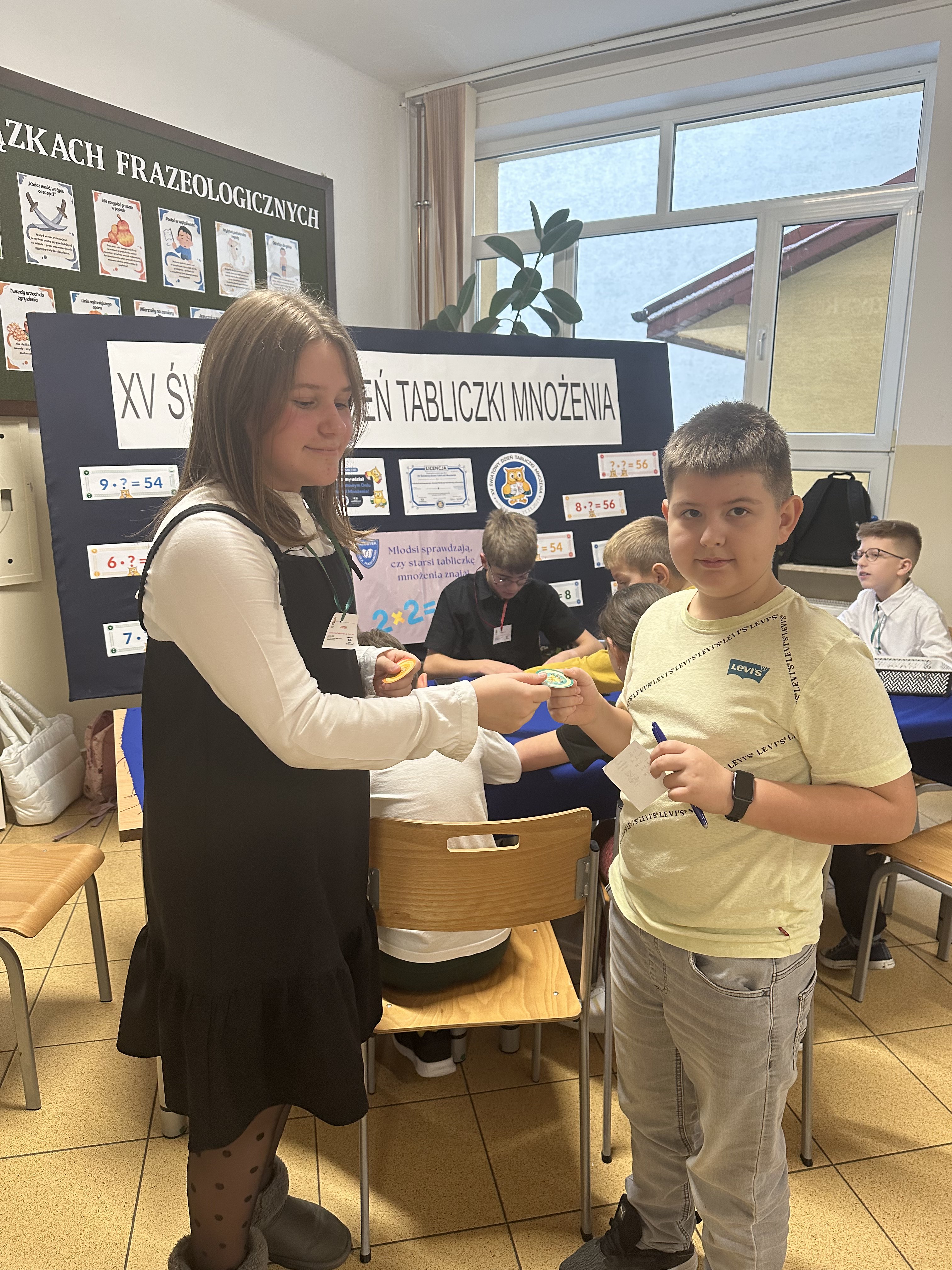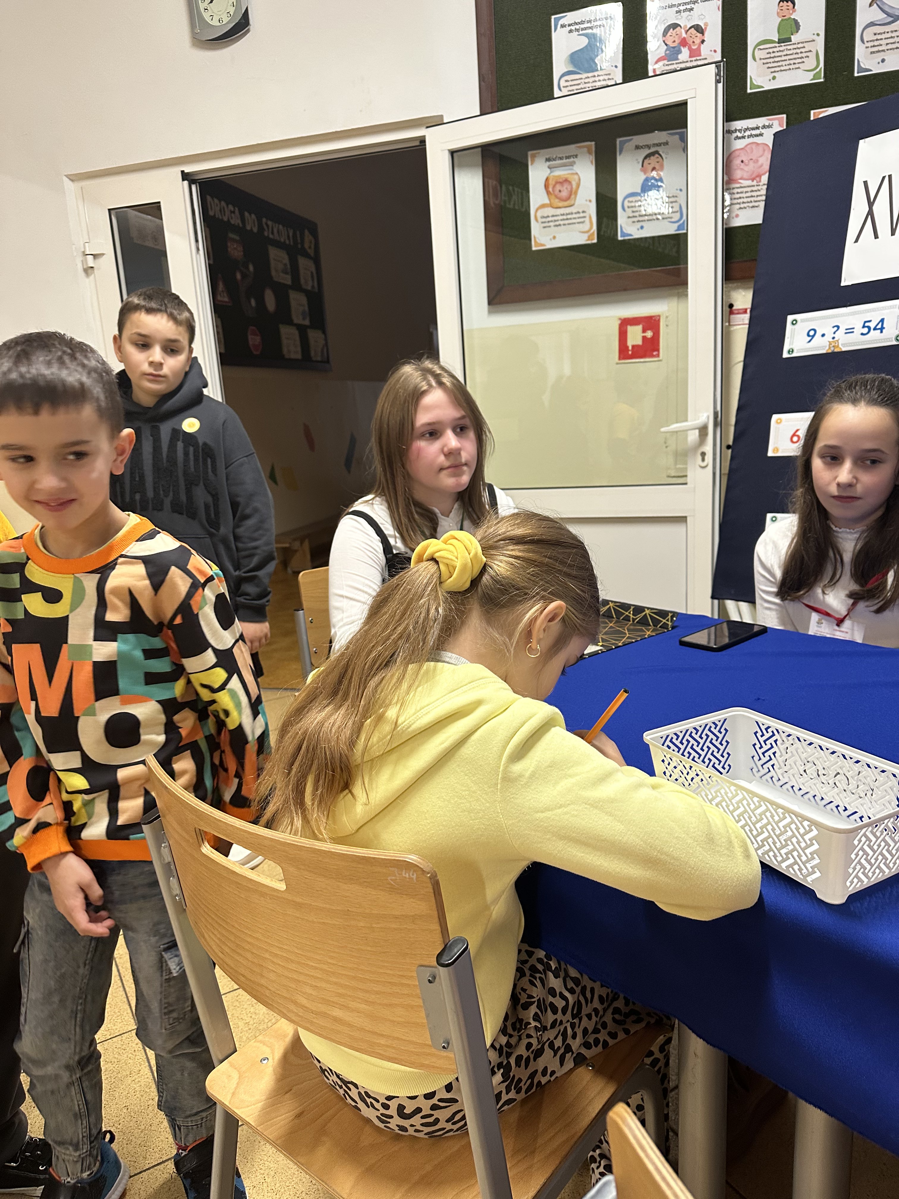 21 listopada w naszej szkole obchodziliśmy XV Światowy Dzień Tabliczki Mnożenia – wydarzenie, które od lat zachęca uczniów na całym świecie do przypomnienia sobie podstawowych faktów matematycznych w przyjemny i niecodzienny sposób. Hasłem akcji jest „Młodsi sprawdzają, czy starsi tabliczkę mnożenia znają”, dlatego tego dnia w nasze szkole na korytarzu szkolnym można było spotkać wyjątkowych egzaminatorów. Wyposażeni w losy z przykładami tabliczki mnożenia, egzaminowali nauczycieli, pracowników szkoły oraz uczniów klas starszych i młodszych. Każdy chętny mógł wziąć udział w krótkim, kilkuminutowym teście. Po prawidłowym rozwiązaniu pięciu przykładów uczestnicy otrzymywali naklejki Eksperta Tabliczki Mnożenia, co było dla nich dużą satysfakcją i powodem do dumy.
