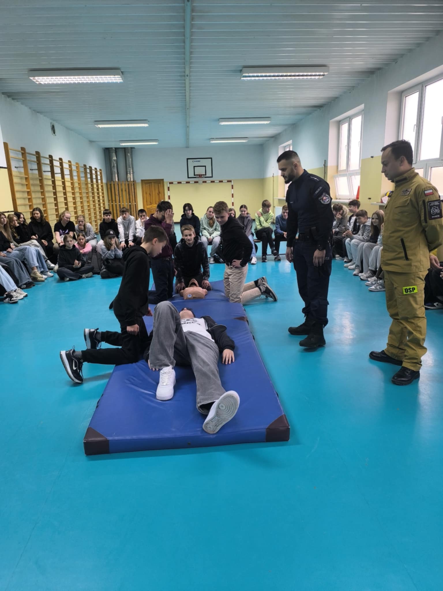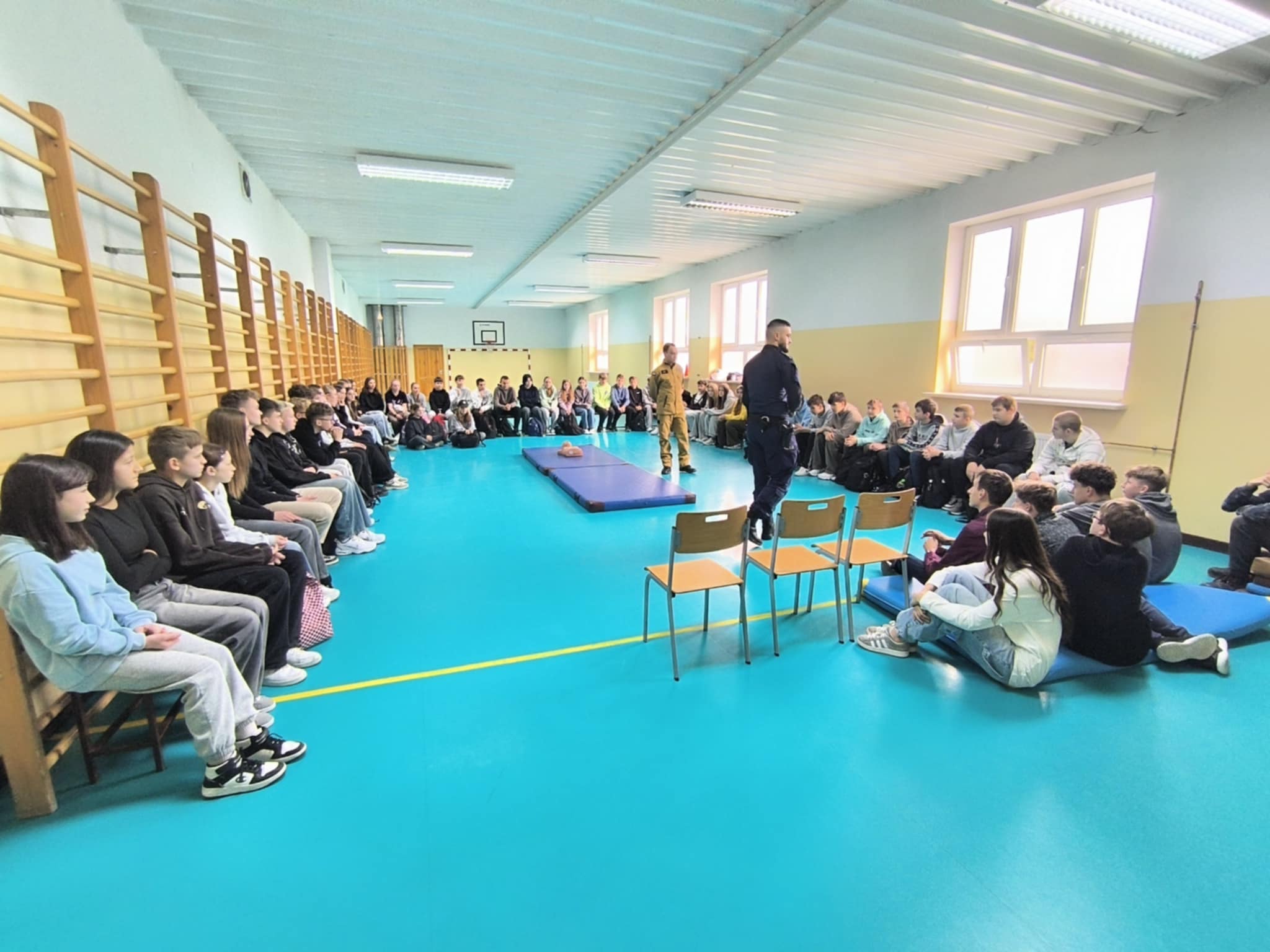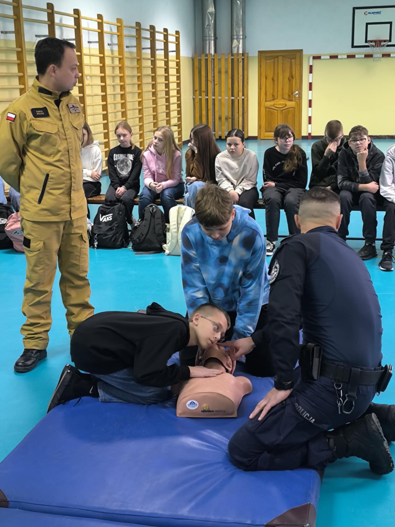 Podczas spotkania uczniowie klas szóstych, siódmych i ósmych dowiedzieli się, jak rozpoznawać różne sytuacje zagrożenia, np. wypadki na drodze, zadławienia czy omdlenia. Policjant i strażak pokazali, jak prawidłowo udzielić pierwszej pomocy, w tym jak wykonać resuscytację krążeniowo-oddechową, jak zatamować krwotok czy jak pomóc osobie nieprzytomnej. Dzieci z dużym zainteresowaniem słuchały instrukcji, a na koniec miały okazję przećwiczyć nabyte umiejętności na specjalnym fantomie.