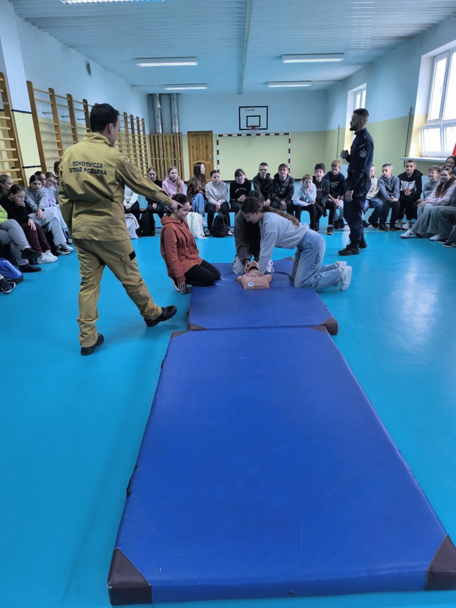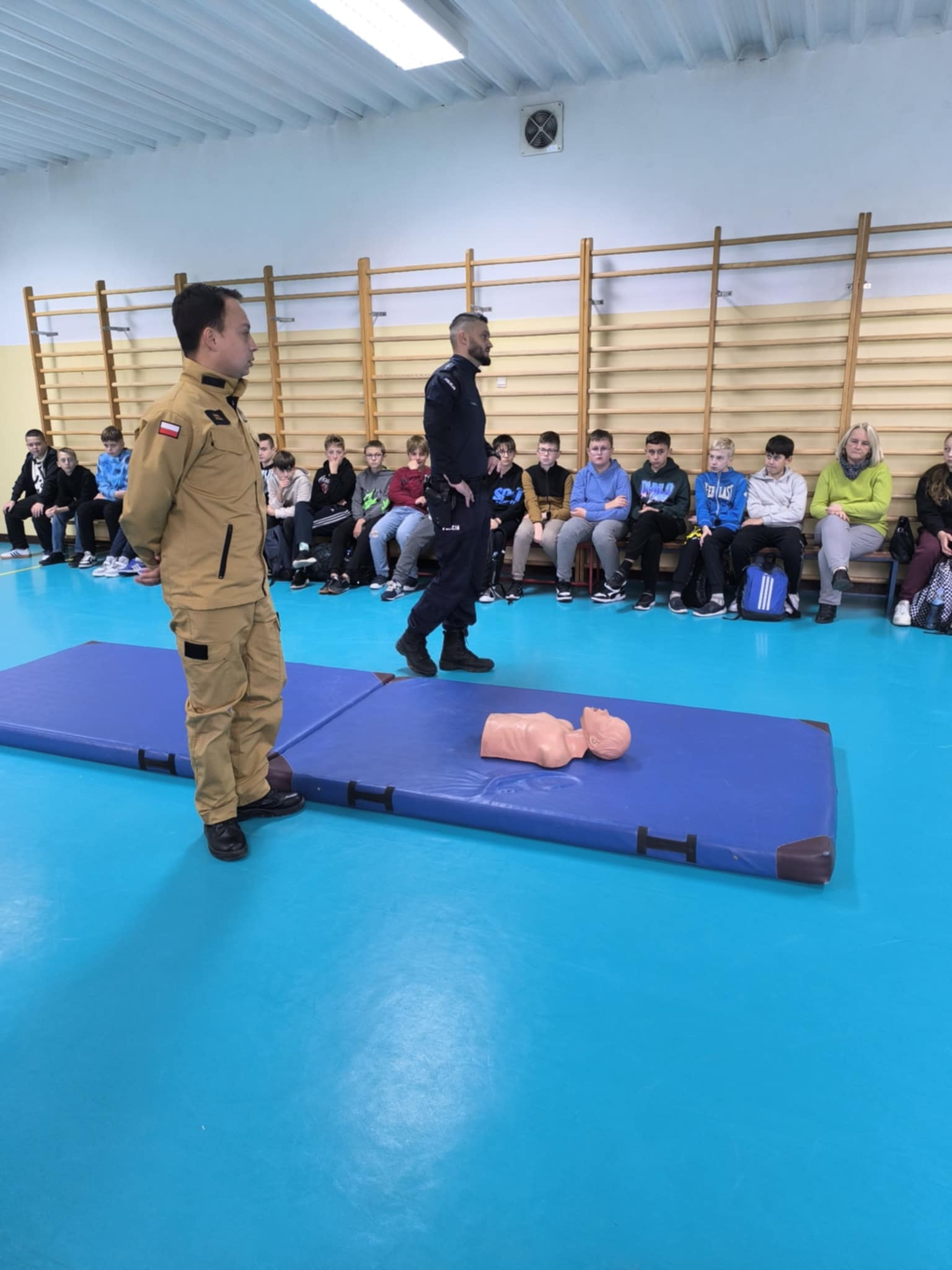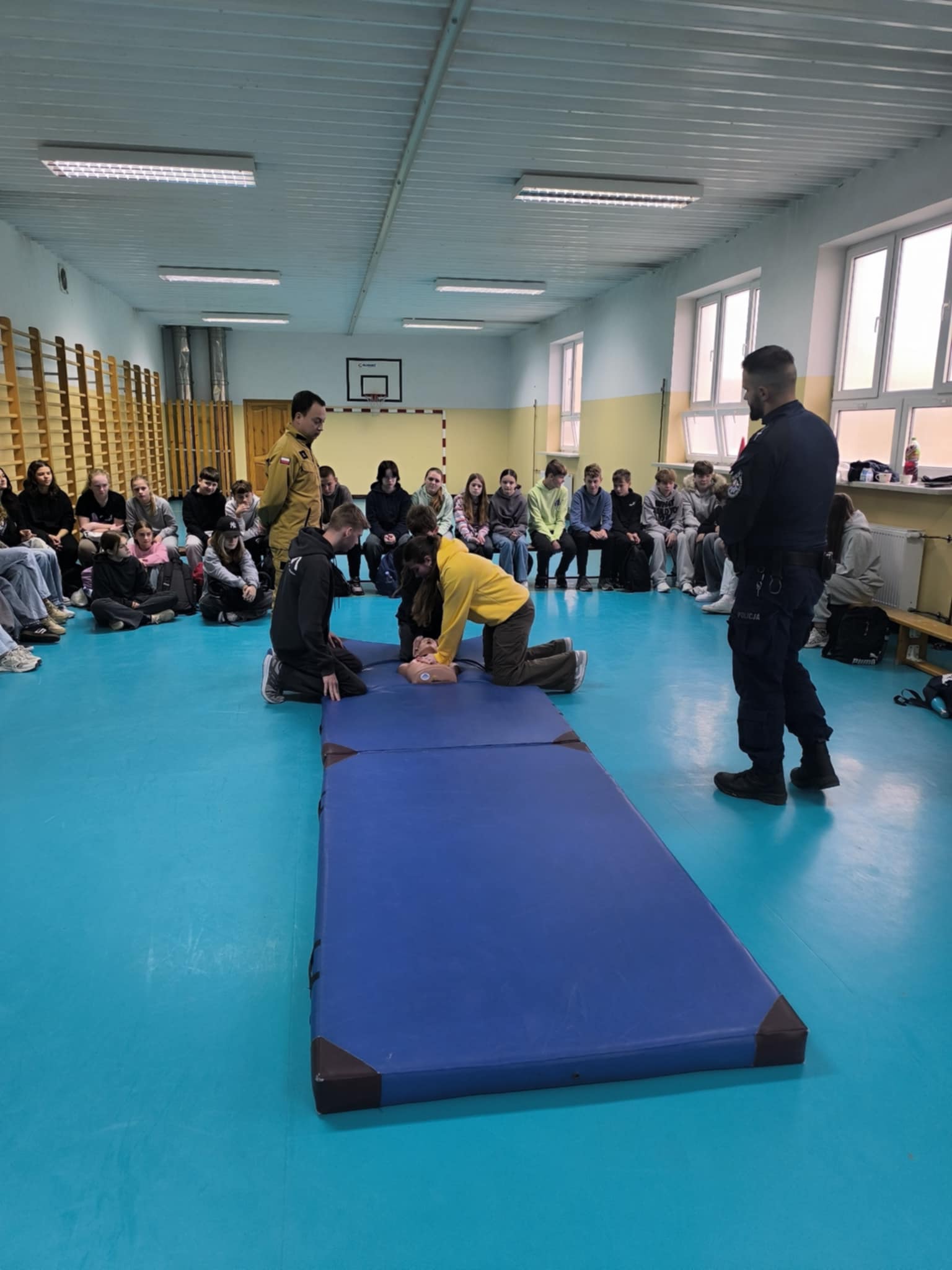 Podczas spotkania uczniowie klas szóstych, siódmych i ósmych dowiedzieli się, jak rozpoznawać różne sytuacje zagrożenia, np. wypadki na drodze, zadławienia czy omdlenia. Policjant i strażak pokazali, jak prawidłowo udzielić pierwszej pomocy, w tym jak wykonać resuscytację krążeniowo-oddechową, jak zatamować krwotok czy jak pomóc osobie nieprzytomnej. Dzieci z dużym zainteresowaniem słuchały instrukcji, a na koniec miały okazję przećwiczyć nabyte umiejętności na specjalnym fantomie.