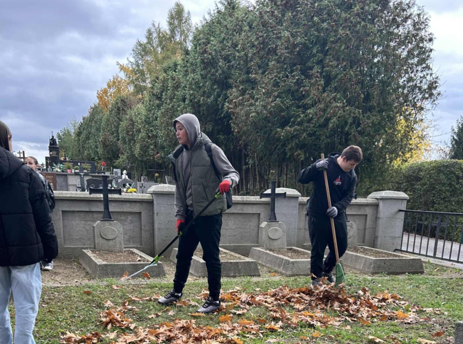 Uczniowie sprzątają cmentarz żołnierski przed Świętem Zmarłych