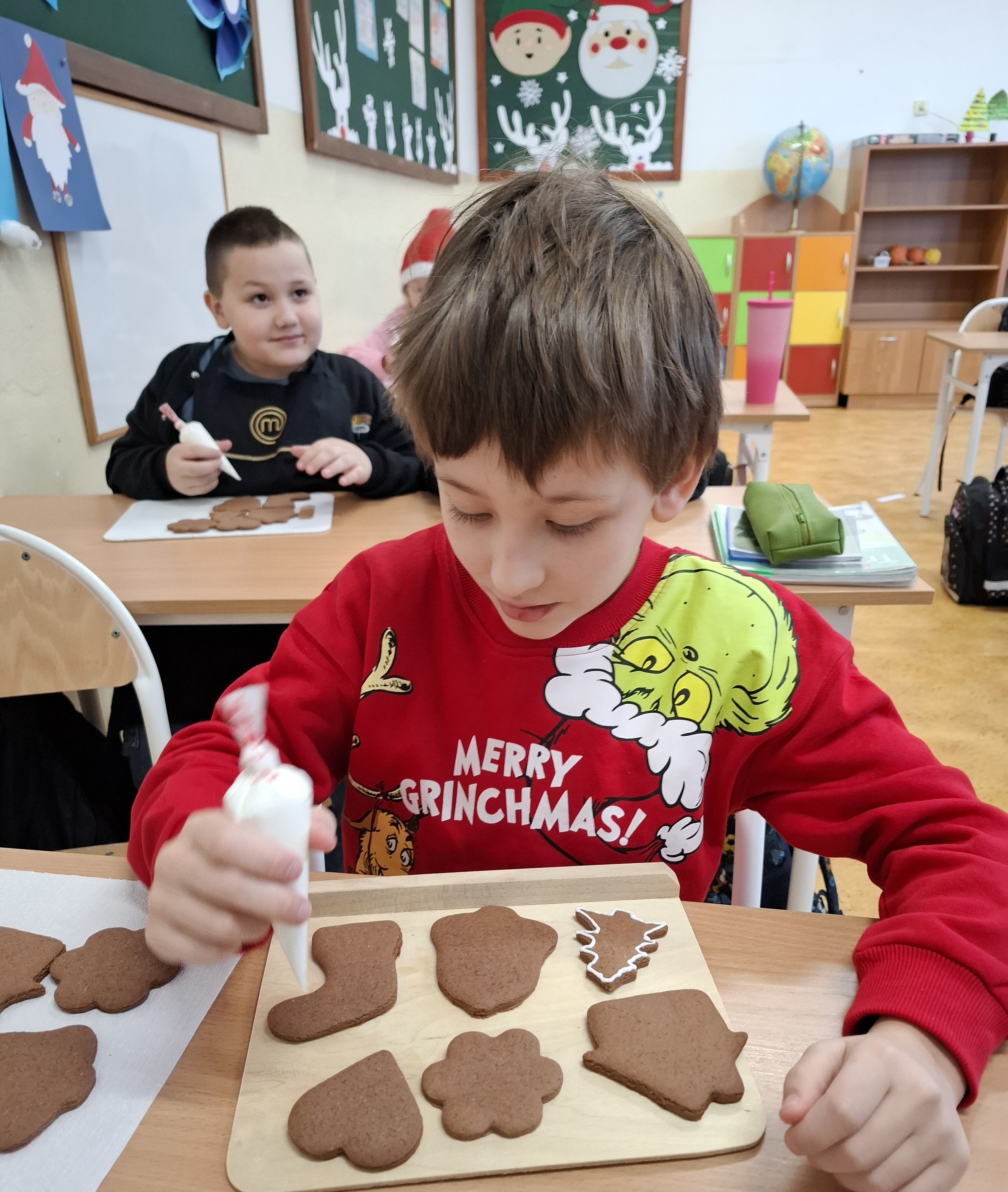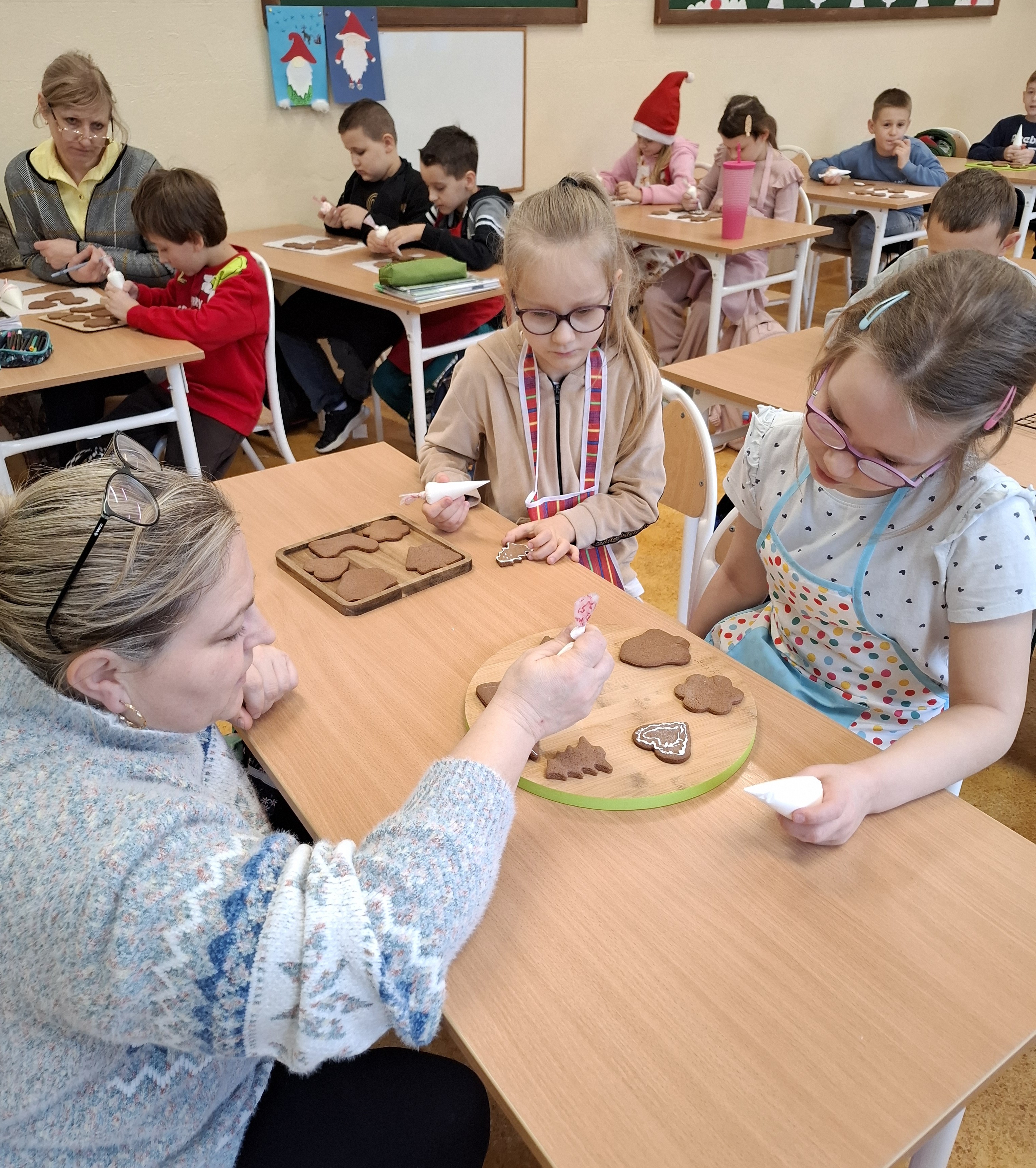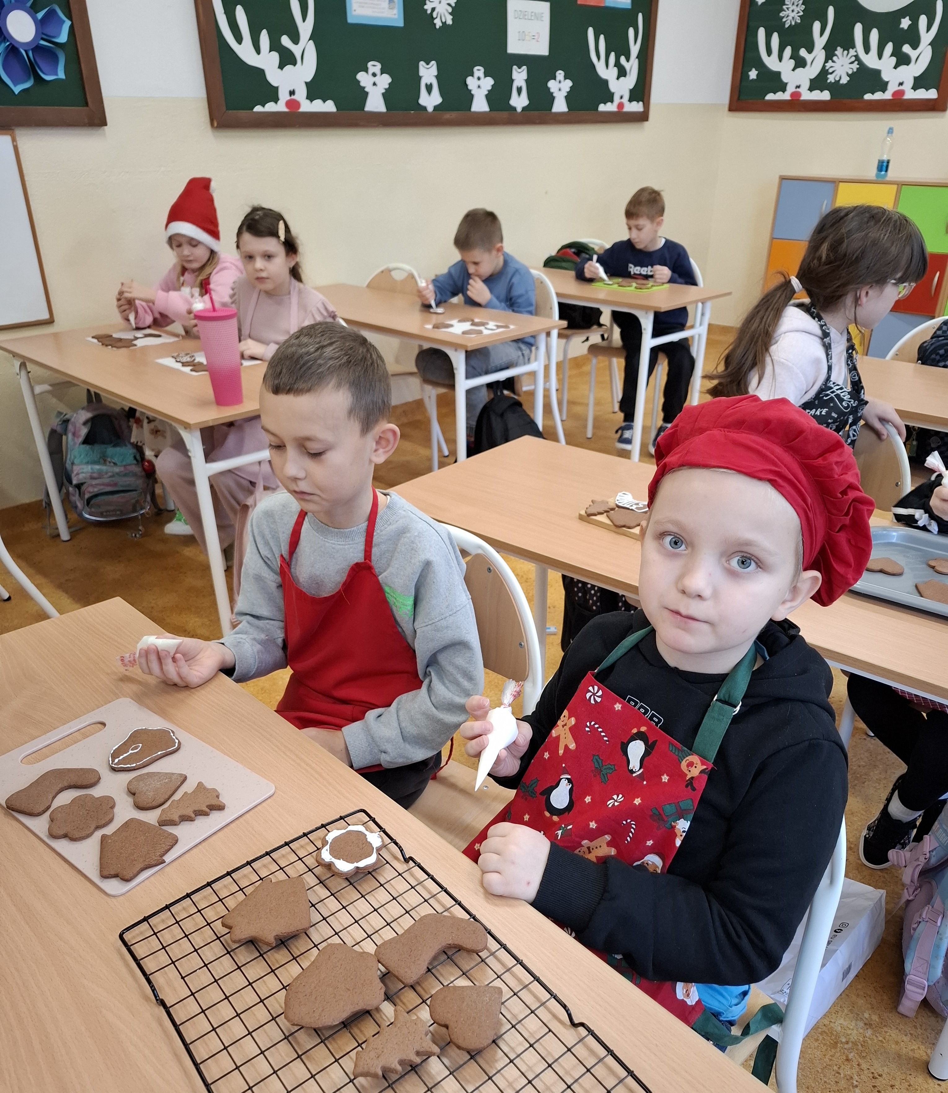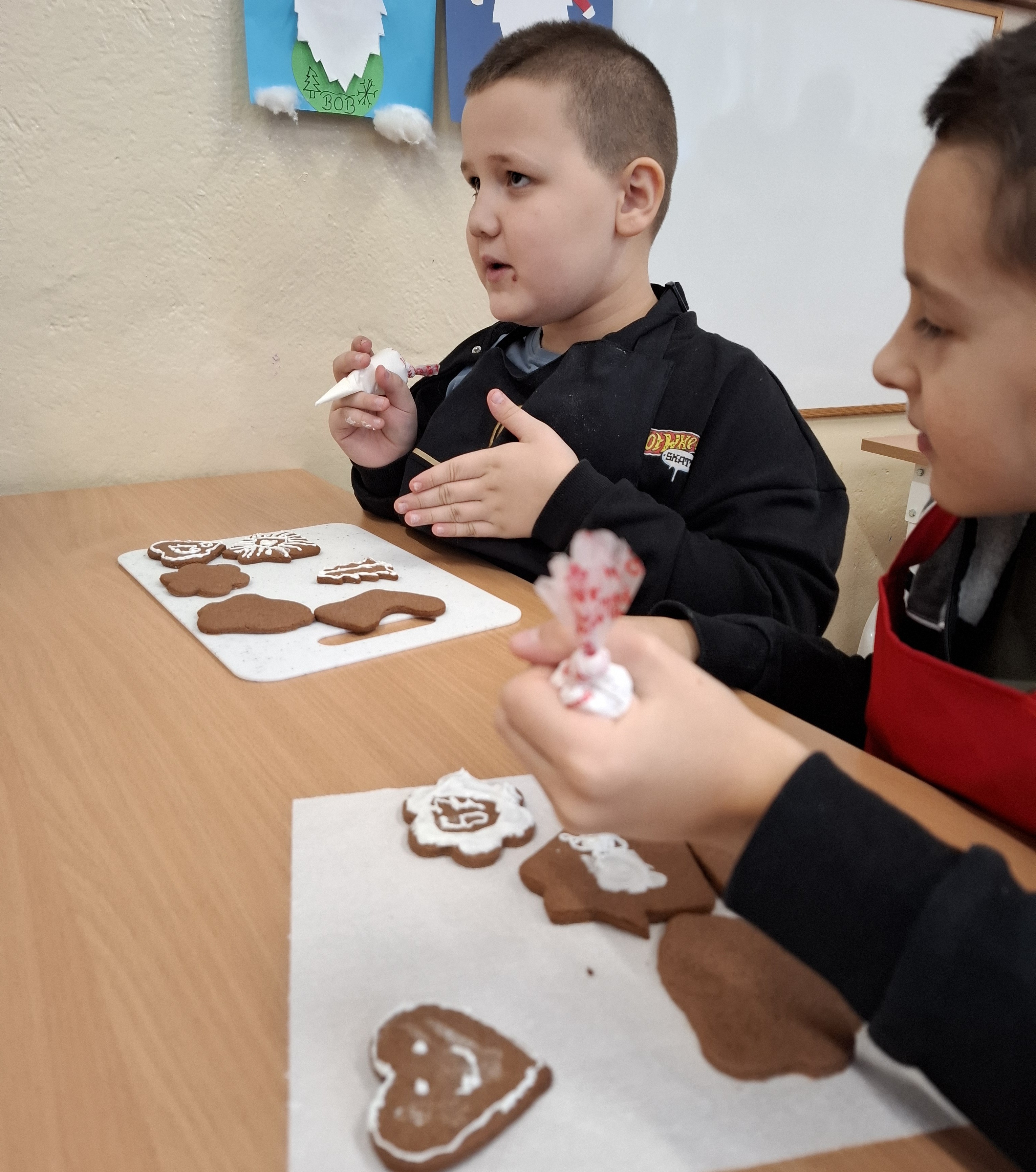 W Polsce już w XII wieku wyrabiano ciasto z miodem. 200 lat później przyprawiono je ostrymi, wonnymi korzeniami: pieprzem, goździkami, imbirem i cynamonem. To były już prawdziwe pierniki. Pieczono je na szczególne uroczystości, także dla zdrowia. W XV wieku spopularyzowano produkcję piernika, a takie miasta jak Gdańsk, Toruń i Kraków zasłynęły z ich wybornego smaku. Ciasto zarabiano 20 lat wcześniej, aby długo leżakowało i przeszło aromatem. W XVII i XVIII wieku pierniki zdobyły najwyższe uznanie. Pieczono nie tylko dla smaku i zdrowia, lecz także dla zabawy. Dla przybliżenia niezwykłej piernikowej tajemnicy przyrządzania średniowiecznych piernikowych delicji, zaprosiliśmy do naszej klasy mamę jednego z chłopców, panią Marię, która zapoznała uczniów z recepturą piernikowego ciasta, jak również wyczarowała aromatyczne pierniki o przeróżnych kształtach. Drugoklasiści własnoręcznie je udekorowali wyjątkowymi wzorami z błyszczącego lukru. Wykazali się ogromnym zaangażowaniem i kreatywnością. Było przy tym dużo śmiechu i zabawy. W czasie zajęć wszyscy degustowali korzenne ciasteczka. Warsztaty dekorowania pierników to doskonała okazja, by poczuć magię nadchodzących świąt i stworzyć własne, słodkie ozdoby świąteczne. Każdy uczestnik opuścił lekcję z piękną i smaczną pamiątką w dłoniach! Szczególne podziękowania, kierujemy do naszego gościa – pani Marii.