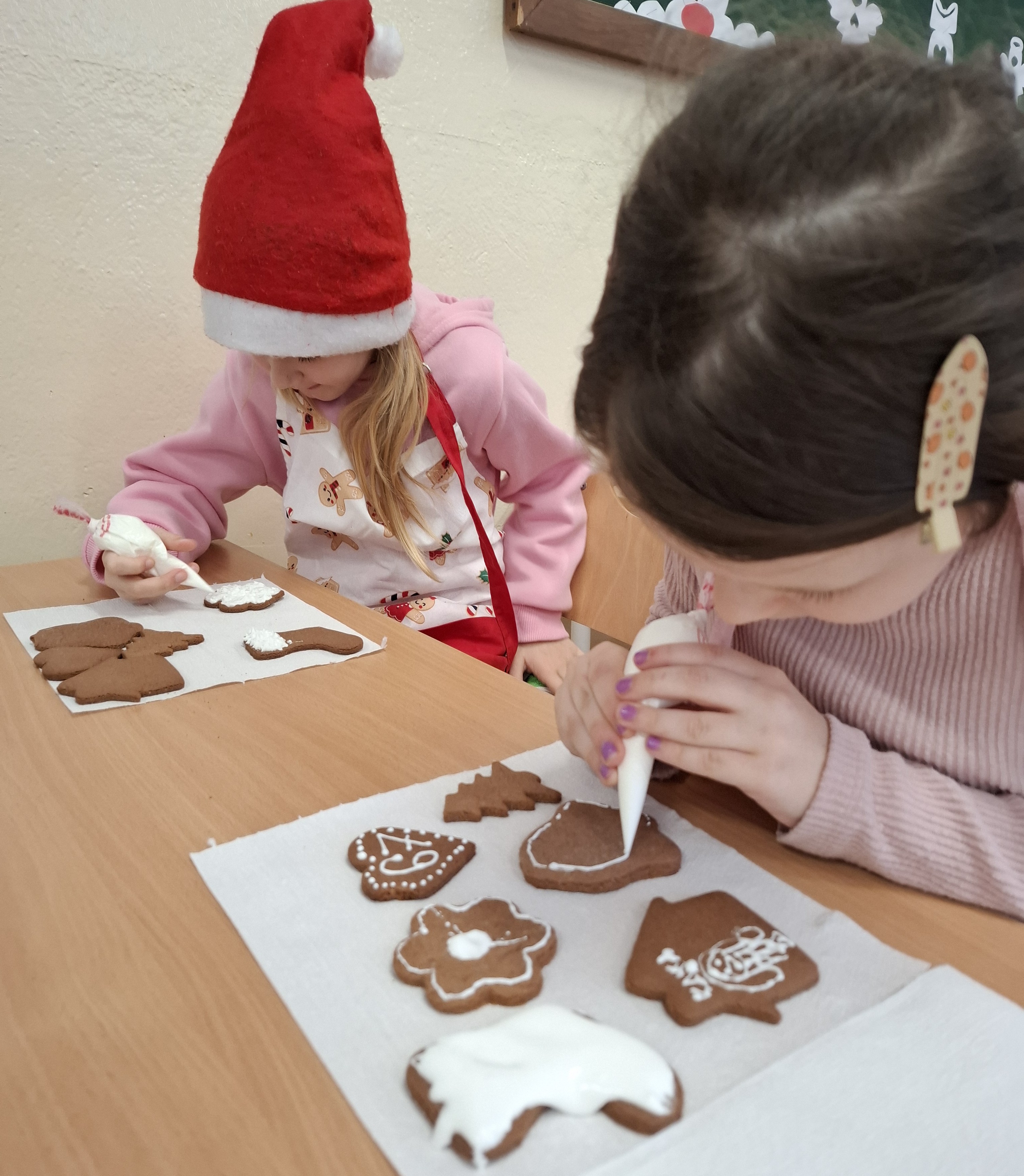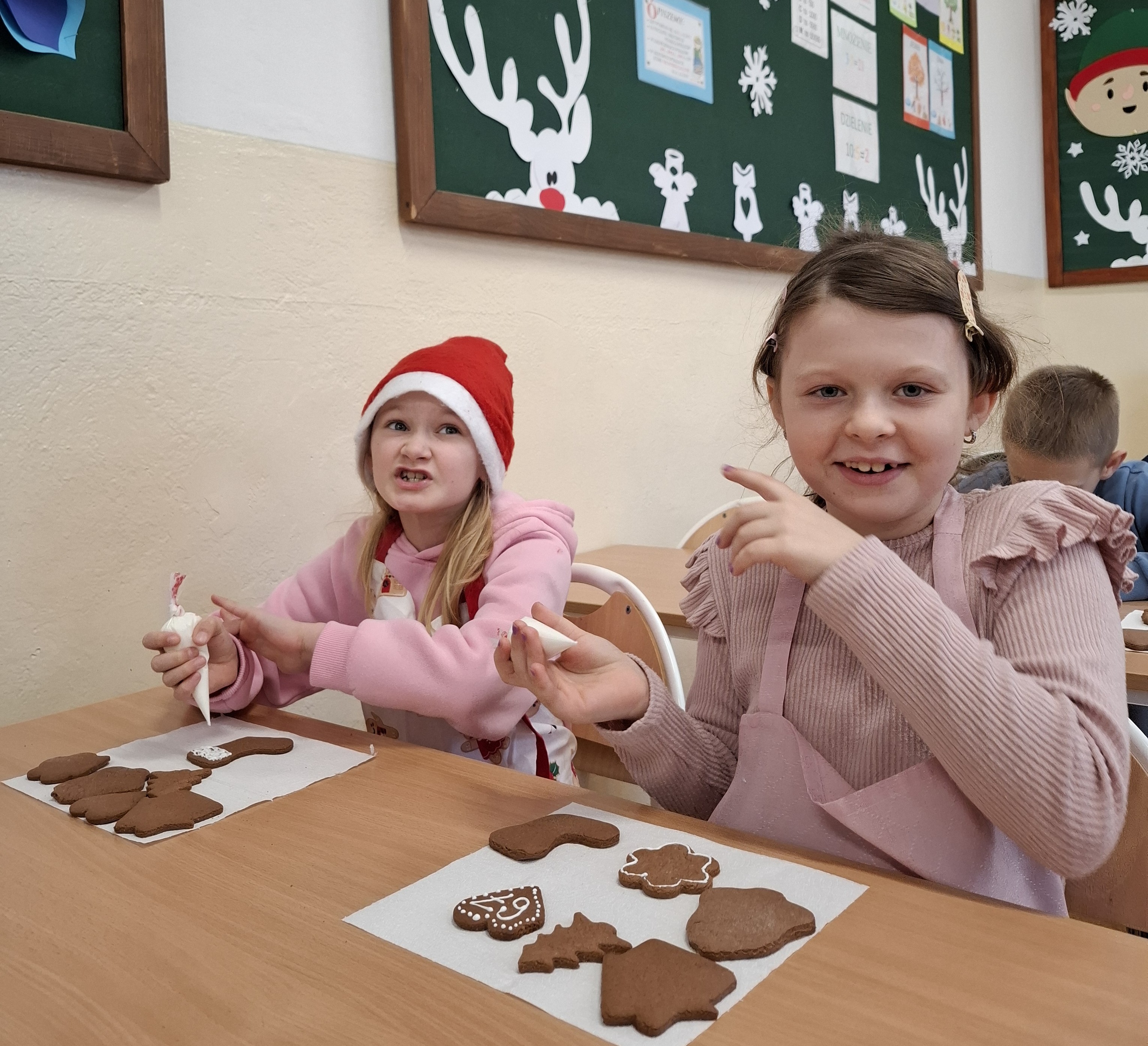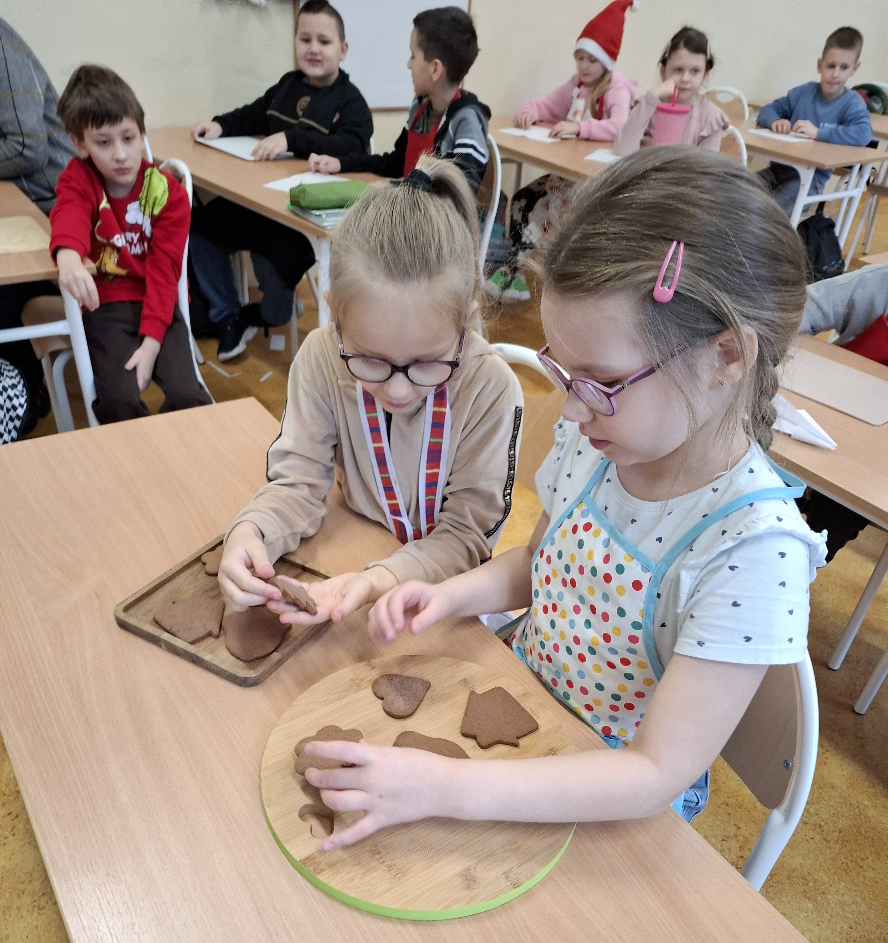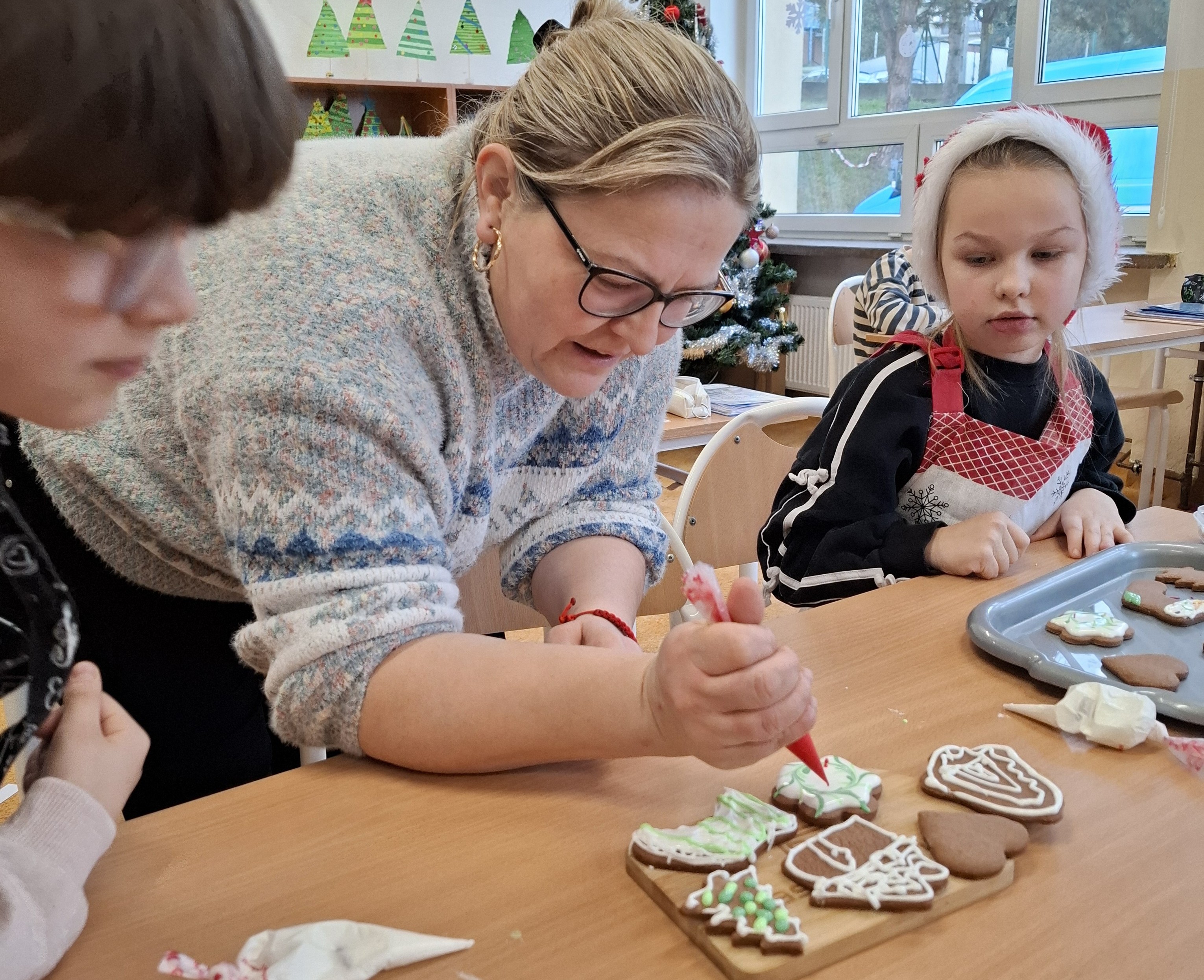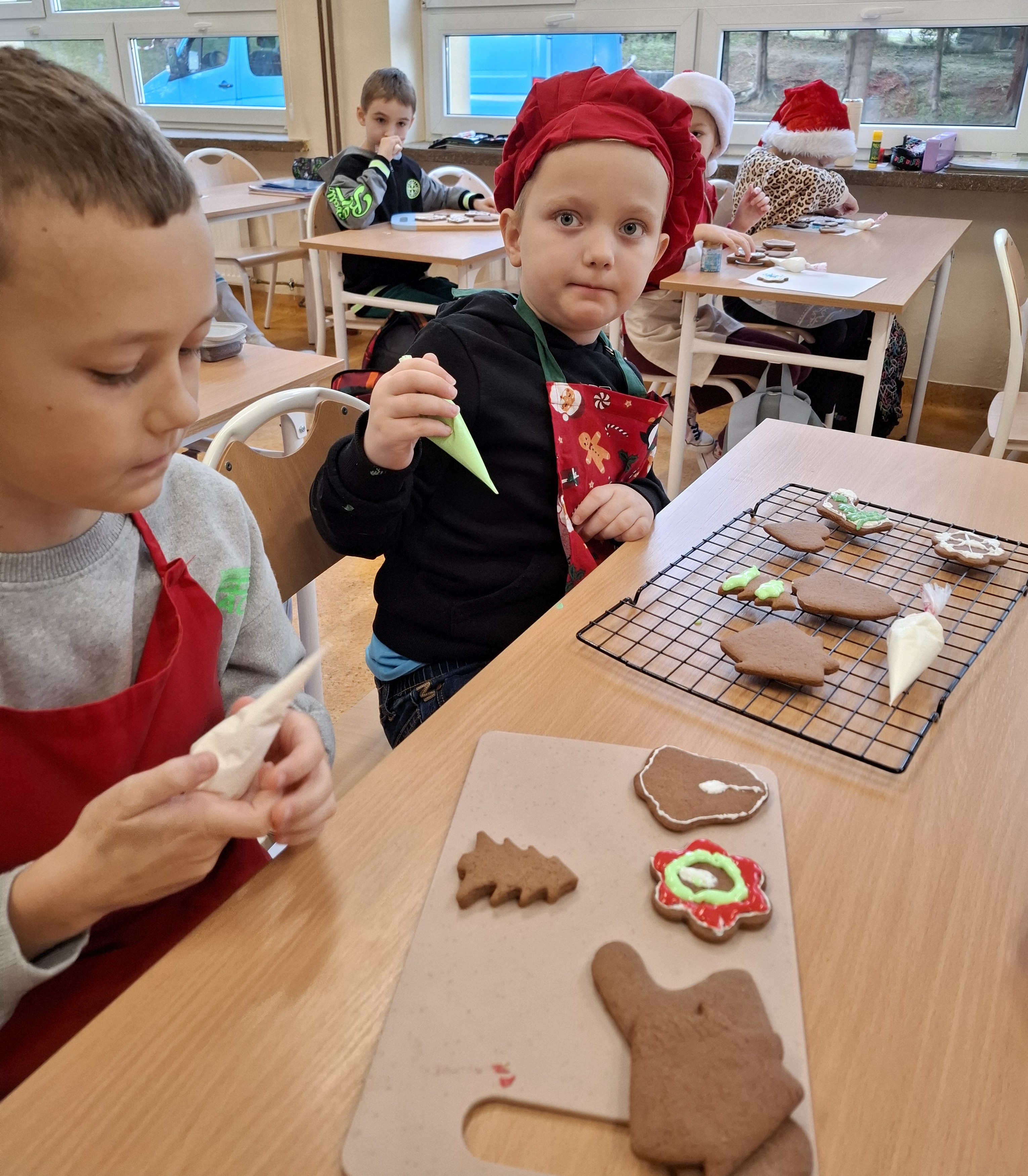 W Polsce już w XII wieku wyrabiano ciasto z miodem. 200 lat później przyprawiono je ostrymi, wonnymi korzeniami: pieprzem, goździkami, imbirem i cynamonem. To były już prawdziwe pierniki. Pieczono je na szczególne uroczystości, także dla zdrowia. W XV wieku spopularyzowano produkcję piernika, a takie miasta jak Gdańsk, Toruń i Kraków zasłynęły z ich wybornego smaku. Ciasto zarabiano 20 lat wcześniej, aby długo leżakowało i przeszło aromatem. W XVII i XVIII wieku pierniki zdobyły najwyższe uznanie. Pieczono nie tylko dla smaku i zdrowia, lecz także dla zabawy. Dla przybliżenia niezwykłej piernikowej tajemnicy przyrządzania średniowiecznych piernikowych delicji, zaprosiliśmy do naszej klasy mamę jednego z chłopców, panią Marię, która zapoznała uczniów z recepturą piernikowego ciasta, jak również wyczarowała aromatyczne pierniki o przeróżnych kształtach. Drugoklasiści własnoręcznie je udekorowali wyjątkowymi wzorami z błyszczącego lukru. Wykazali się ogromnym zaangażowaniem i kreatywnością. Było przy tym dużo śmiechu i zabawy. W czasie zajęć wszyscy degustowali korzenne ciasteczka. Warsztaty dekorowania pierników to doskonała okazja, by poczuć magię nadchodzących świąt i stworzyć własne, słodkie ozdoby świąteczne. Każdy uczestnik opuścił lekcję z piękną i smaczną pamiątką w dłoniach! Szczególne podziękowania, kierujemy do naszego gościa – pani Marii.