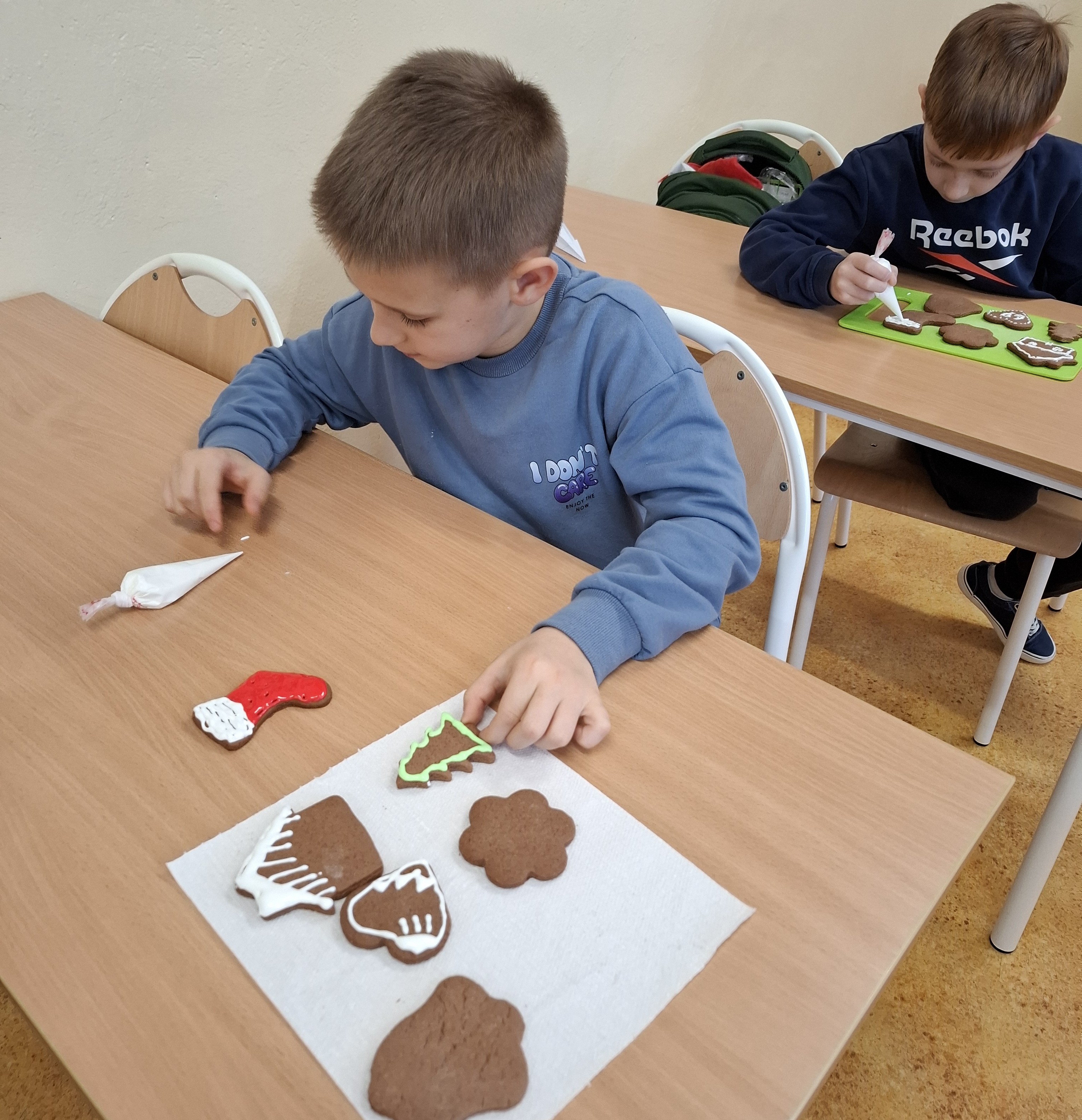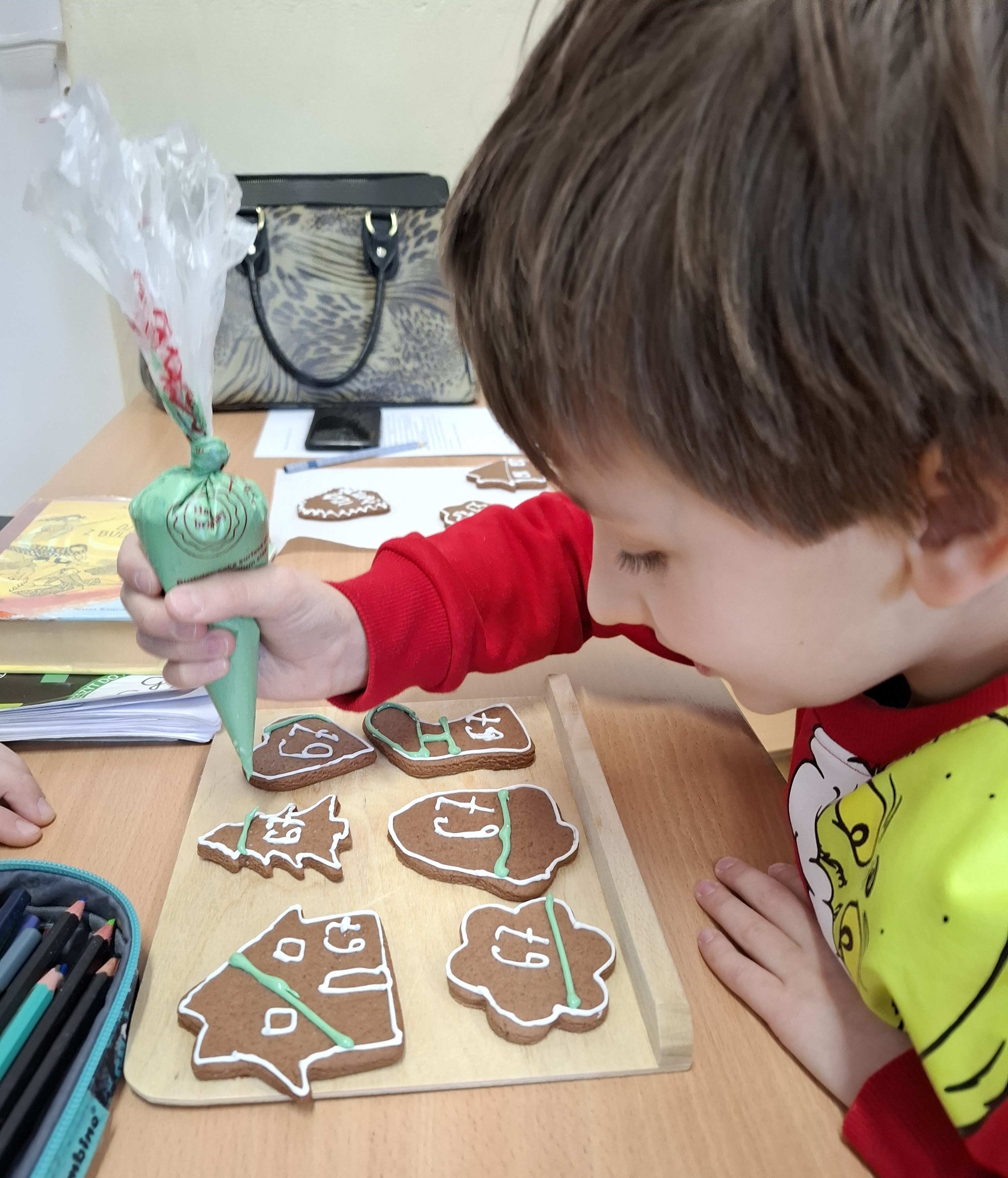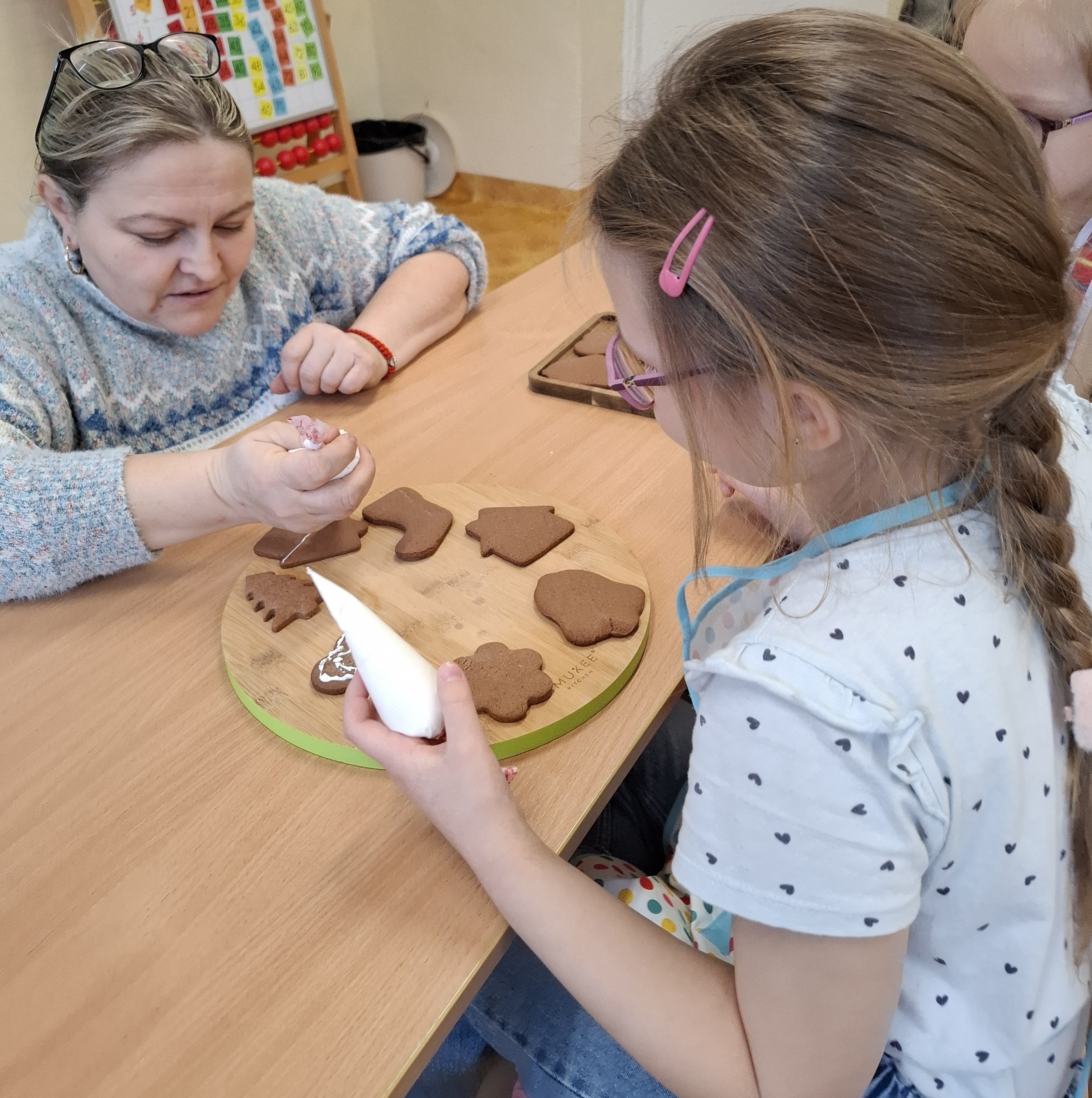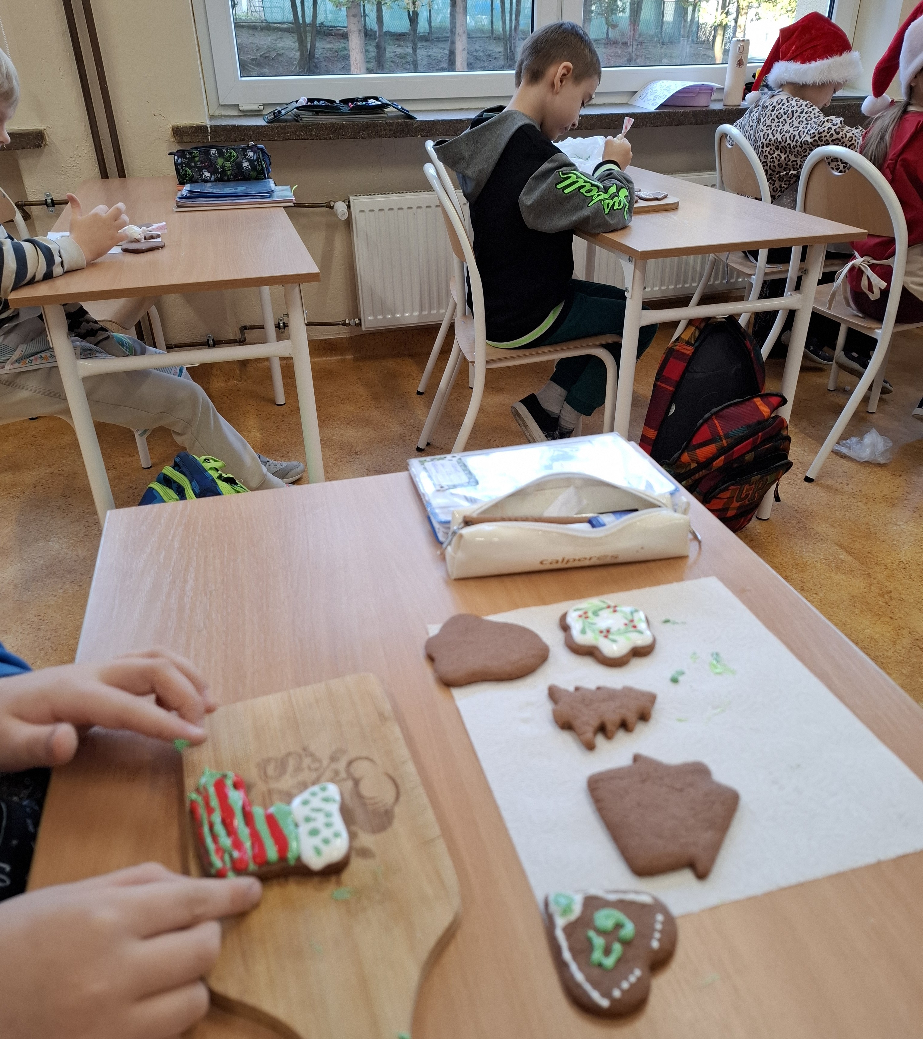W Polsce już w XII wieku wyrabiano ciasto z miodem. 200 lat później przyprawiono je ostrymi, wonnymi korzeniami: pieprzem, goździkami, imbirem i cynamonem. To były już prawdziwe pierniki. Pieczono je na szczególne uroczystości, także dla zdrowia. W XV wieku spopularyzowano produkcję piernika, a takie miasta jak Gdańsk, Toruń i Kraków zasłynęły z ich wybornego smaku. Ciasto zarabiano 20 lat wcześniej, aby długo leżakowało i przeszło aromatem. W XVII i XVIII wieku pierniki zdobyły najwyższe uznanie. Pieczono nie tylko dla smaku i zdrowia, lecz także dla zabawy. Dla przybliżenia niezwykłej piernikowej tajemnicy przyrządzania średniowiecznych piernikowych delicji, zaprosiliśmy do naszej klasy mamę jednego z chłopców, panią Marię, która zapoznała uczniów z recepturą piernikowego ciasta, jak również wyczarowała aromatyczne pierniki o przeróżnych kształtach. Drugoklasiści własnoręcznie je udekorowali wyjątkowymi wzorami z błyszczącego lukru. Wykazali się ogromnym zaangażowaniem i kreatywnością. Było przy tym dużo śmiechu i zabawy. W czasie zajęć wszyscy degustowali korzenne ciasteczka. Warsztaty dekorowania pierników to doskonała okazja, by poczuć magię nadchodzących świąt i stworzyć własne, słodkie ozdoby świąteczne. Każdy uczestnik opuścił lekcję z piękną i smaczną pamiątką w dłoniach! Szczególne podziękowania, kierujemy do naszego gościa – pani Marii.