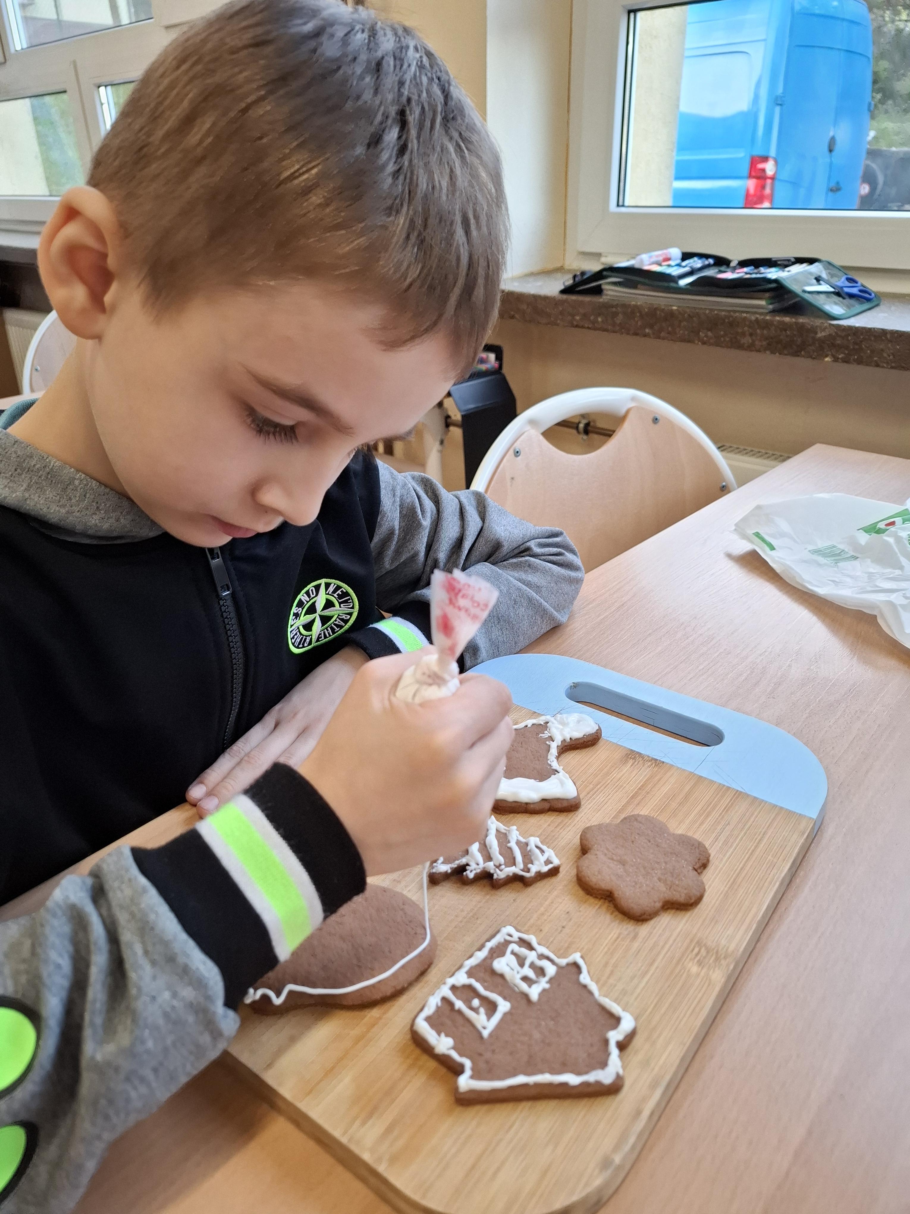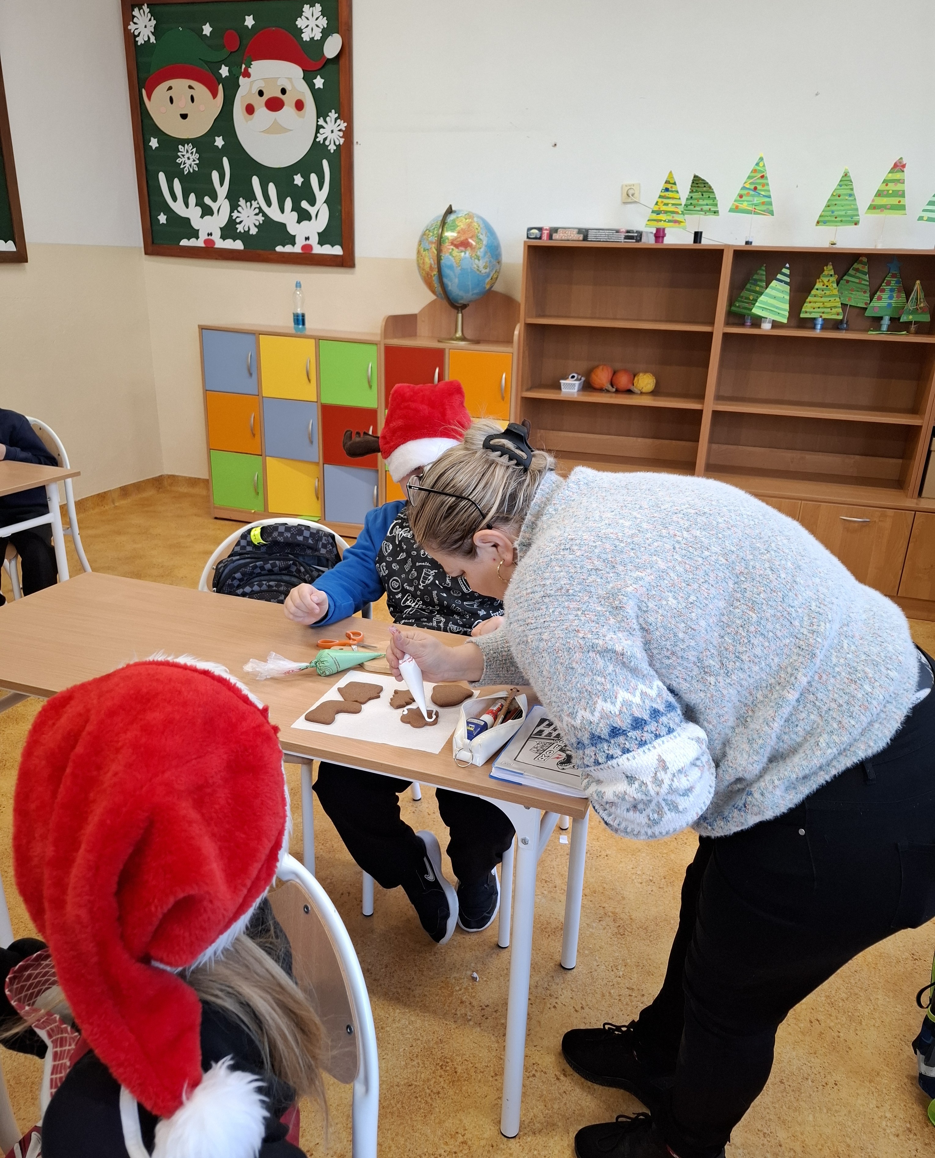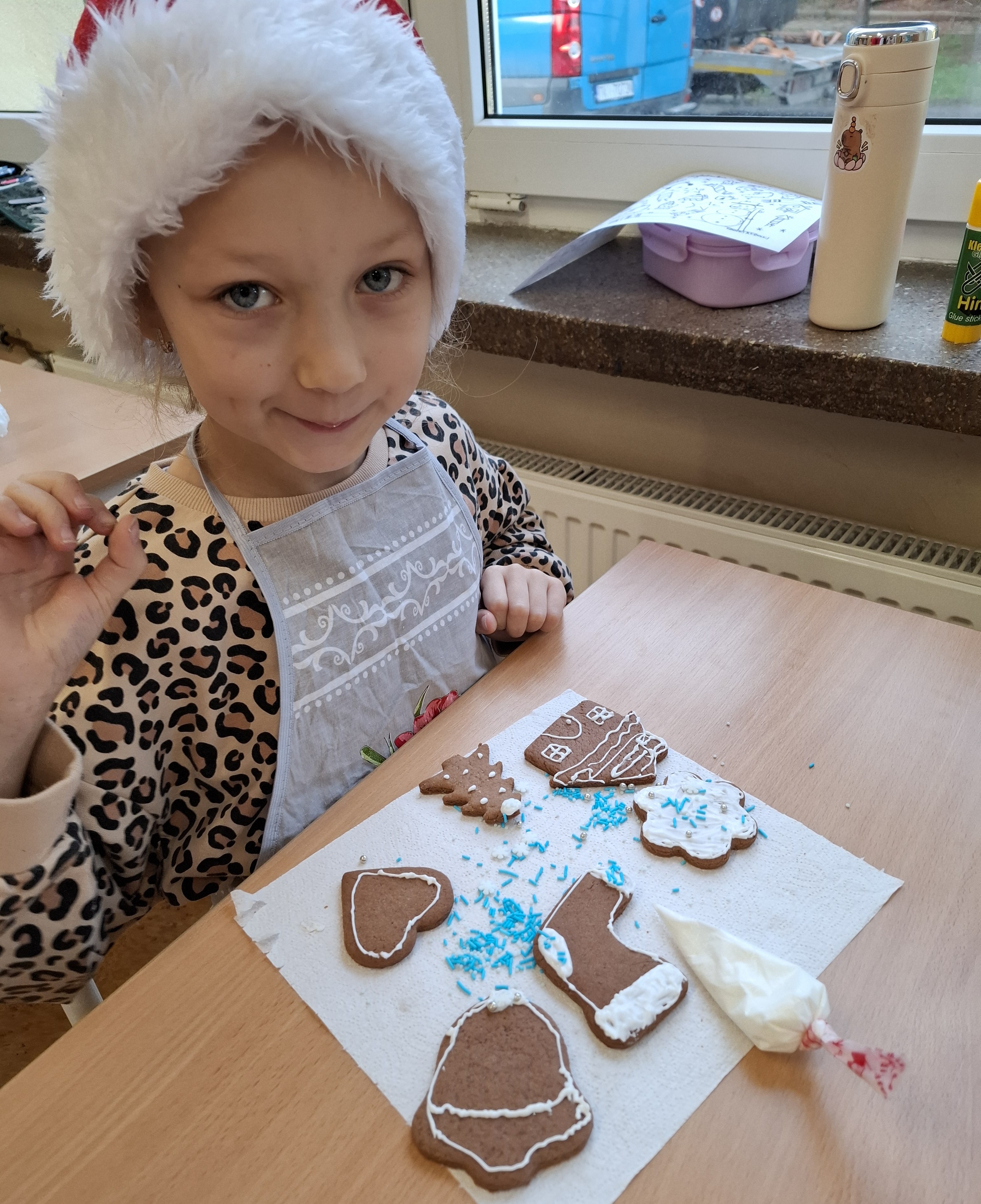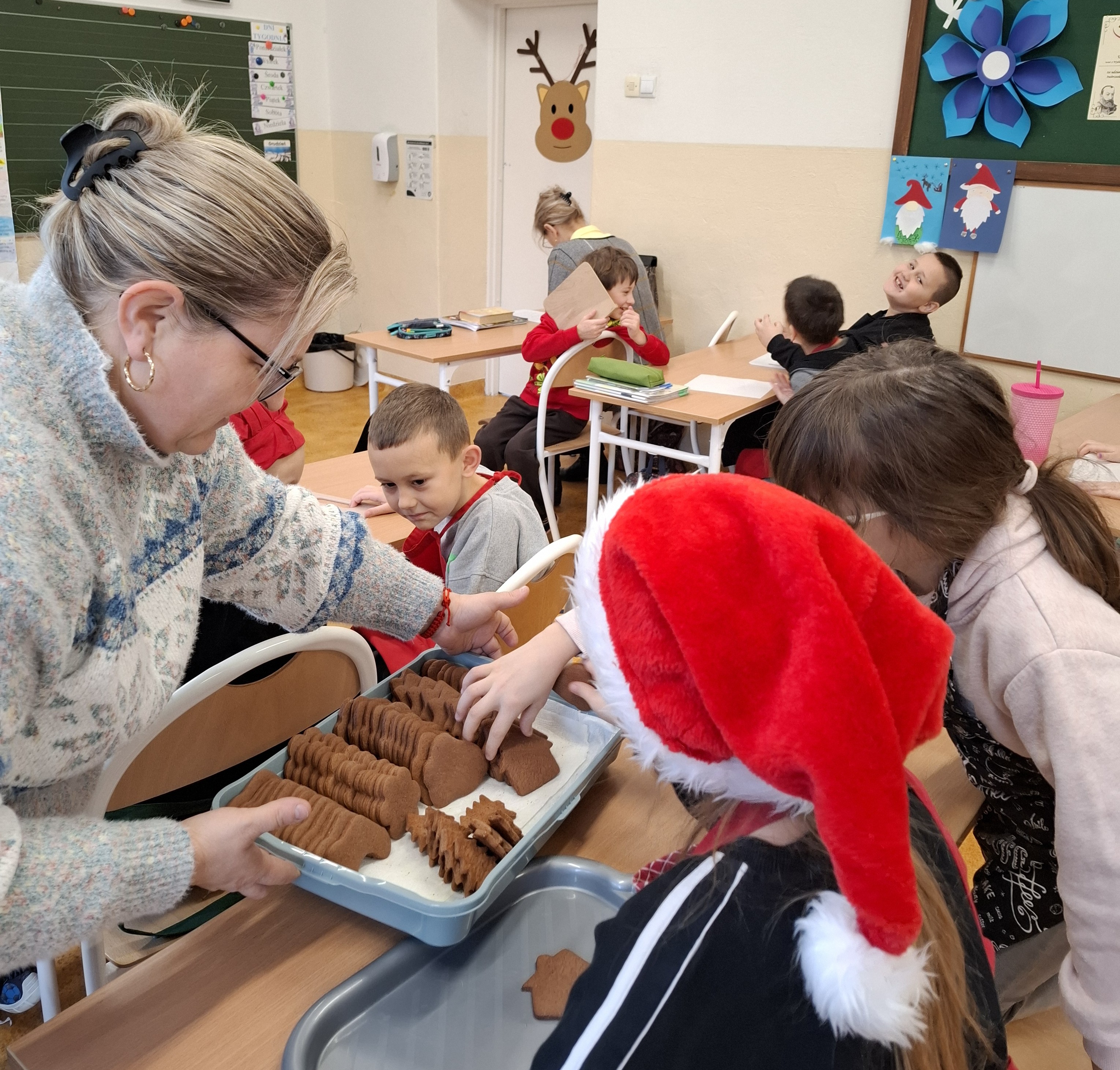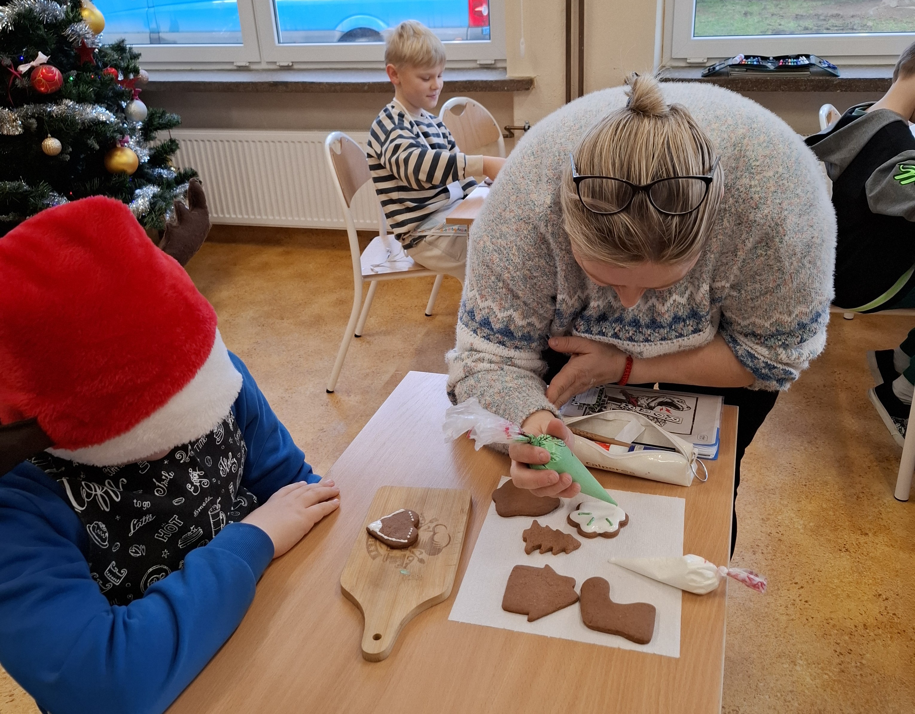 W Polsce już w XII wieku wyrabiano ciasto z miodem. 200 lat później przyprawiono je ostrymi, wonnymi korzeniami: pieprzem, goździkami, imbirem i cynamonem. To były już prawdziwe pierniki. Pieczono je na szczególne uroczystości, także dla zdrowia. W XV wieku spopularyzowano produkcję piernika, a takie miasta jak Gdańsk, Toruń i Kraków zasłynęły z ich wybornego smaku. Ciasto zarabiano 20 lat wcześniej, aby długo leżakowało i przeszło aromatem. W XVII i XVIII wieku pierniki zdobyły najwyższe uznanie. Pieczono nie tylko dla smaku i zdrowia, lecz także dla zabawy. Dla przybliżenia niezwykłej piernikowej tajemnicy przyrządzania średniowiecznych piernikowych delicji, zaprosiliśmy do naszej klasy mamę jednego z chłopców, panią Marię, która zapoznała uczniów z recepturą piernikowego ciasta, jak również wyczarowała aromatyczne pierniki o przeróżnych kształtach. Drugoklasiści własnoręcznie je udekorowali wyjątkowymi wzorami z błyszczącego lukru. Wykazali się ogromnym zaangażowaniem i kreatywnością. Było przy tym dużo śmiechu i zabawy. W czasie zajęć wszyscy degustowali korzenne ciasteczka. Warsztaty dekorowania pierników to doskonała okazja, by poczuć magię nadchodzących świąt i stworzyć własne, słodkie ozdoby świąteczne. Każdy uczestnik opuścił lekcję z piękną i smaczną pamiątką w dłoniach! Szczególne podziękowania, kierujemy do naszego gościa – pani Marii.