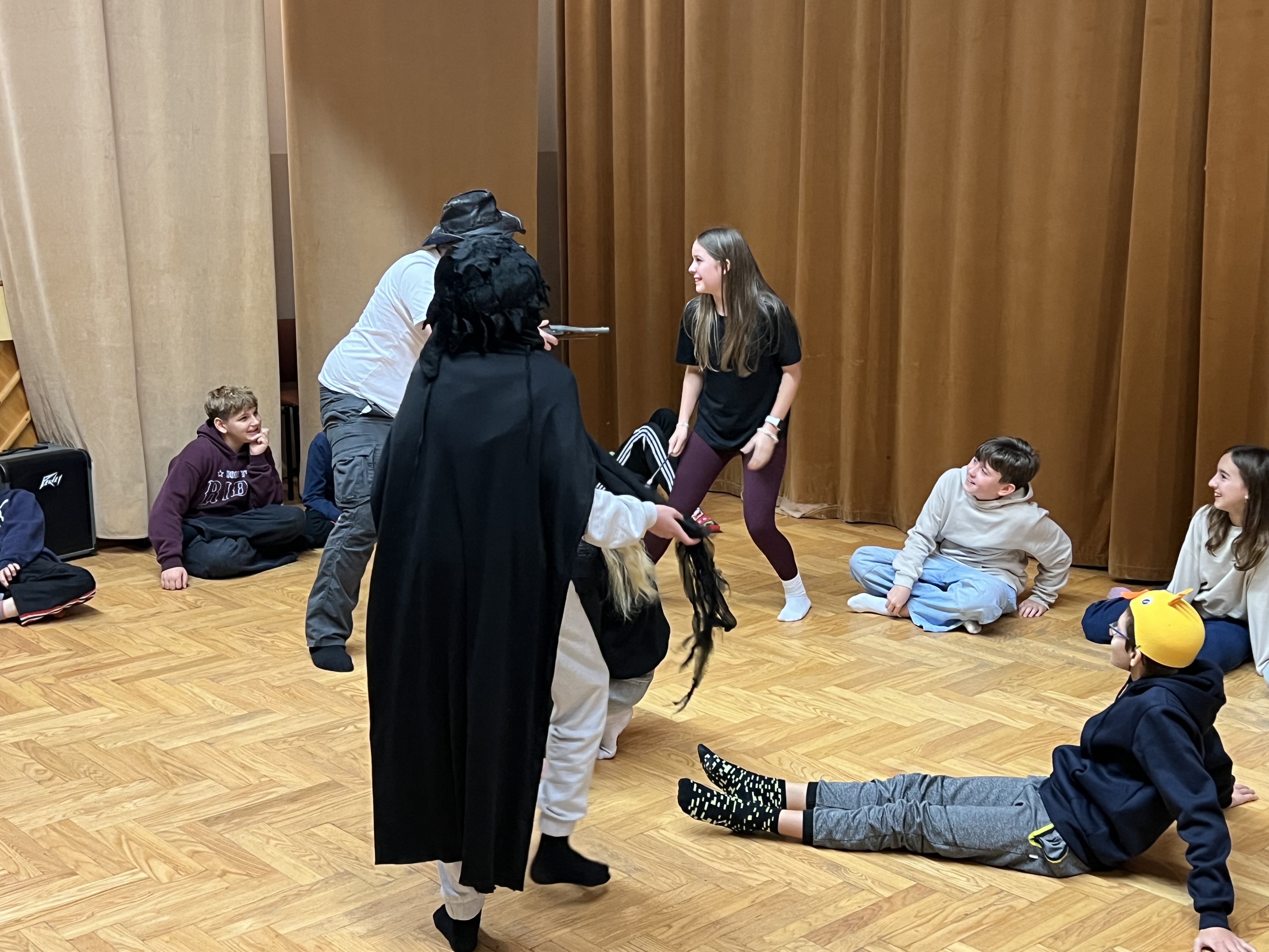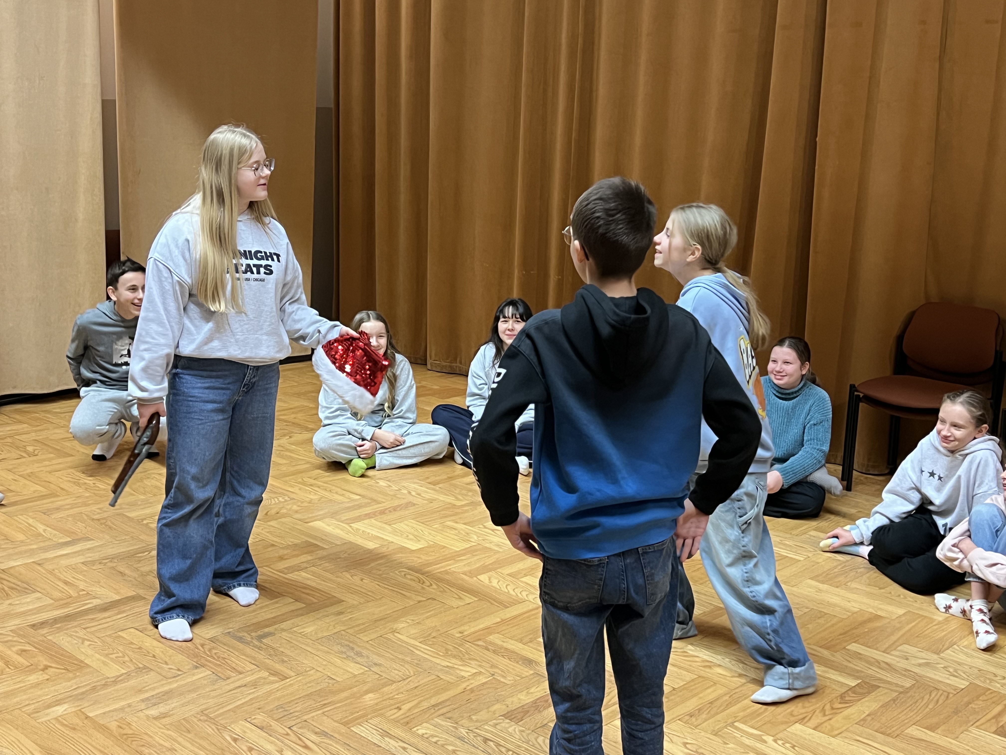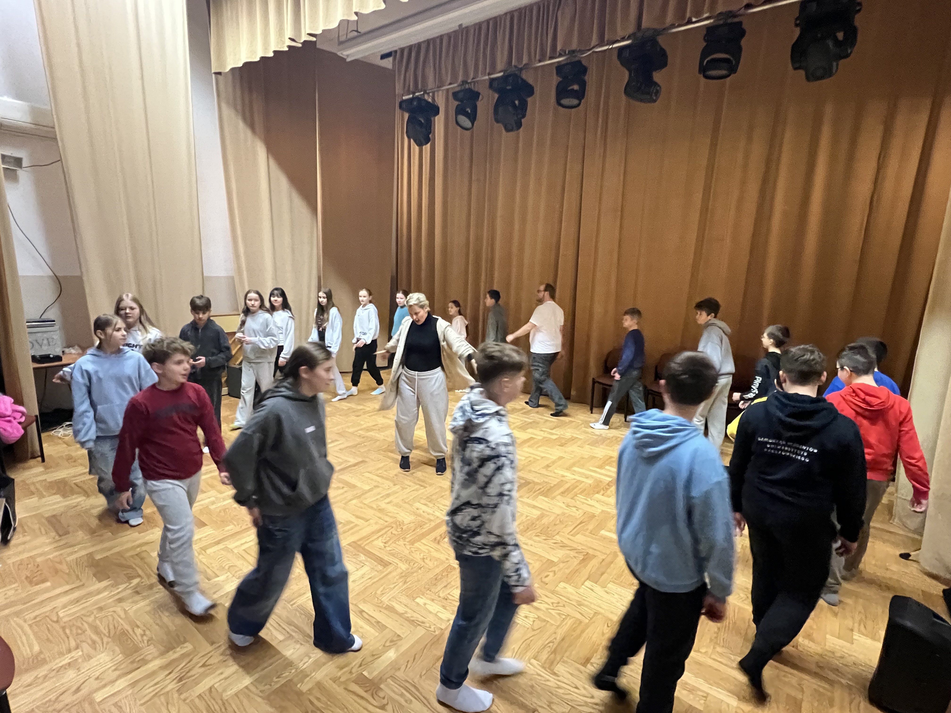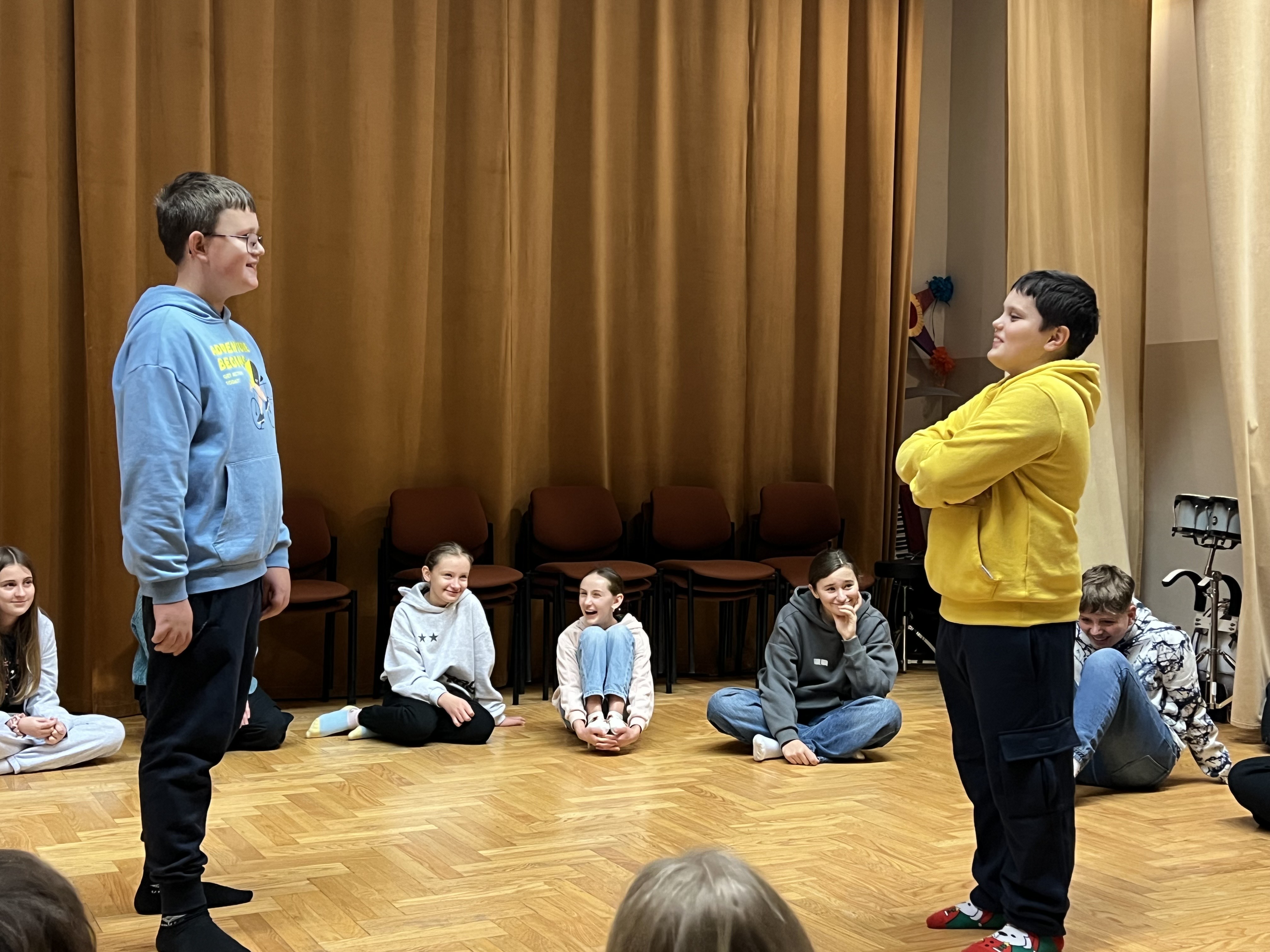 Uczniowie mogli wziąć udział w warsztatach dzięki uczestnictwu szkoły w rządowym programie „Wyjście z klasą”, którego celem jest uatrakcyjnienie procesu edukacyjnego poprzez organizowanie zajęć poza murami szkoły oraz rozwijanie kompetencji społecznych i kulturalnych dzieci i młodzieży. Program ten umożliwia uczniom zdobywanie nowych doświadczeń, rozwijanie pasji oraz odkrywanie talentów w różnorodnych dziedzinach. Podczas warsztatów teatralnych dzieci brały udział w ćwiczeniach ruchowych, improwizacjach aktorskich oraz zabawach integracyjnych, które sprzyjały rozwijaniu wyobraźni, kreatywności i umiejętności współpracy w grupie. Artyści z grupy Krak Art w przystępny i angażujący sposób wprowadzali uczestników w podstawy pracy aktora, ucząc ich wyrażania emocji, pracy z głosem oraz świadomego poruszania się na scenie.
