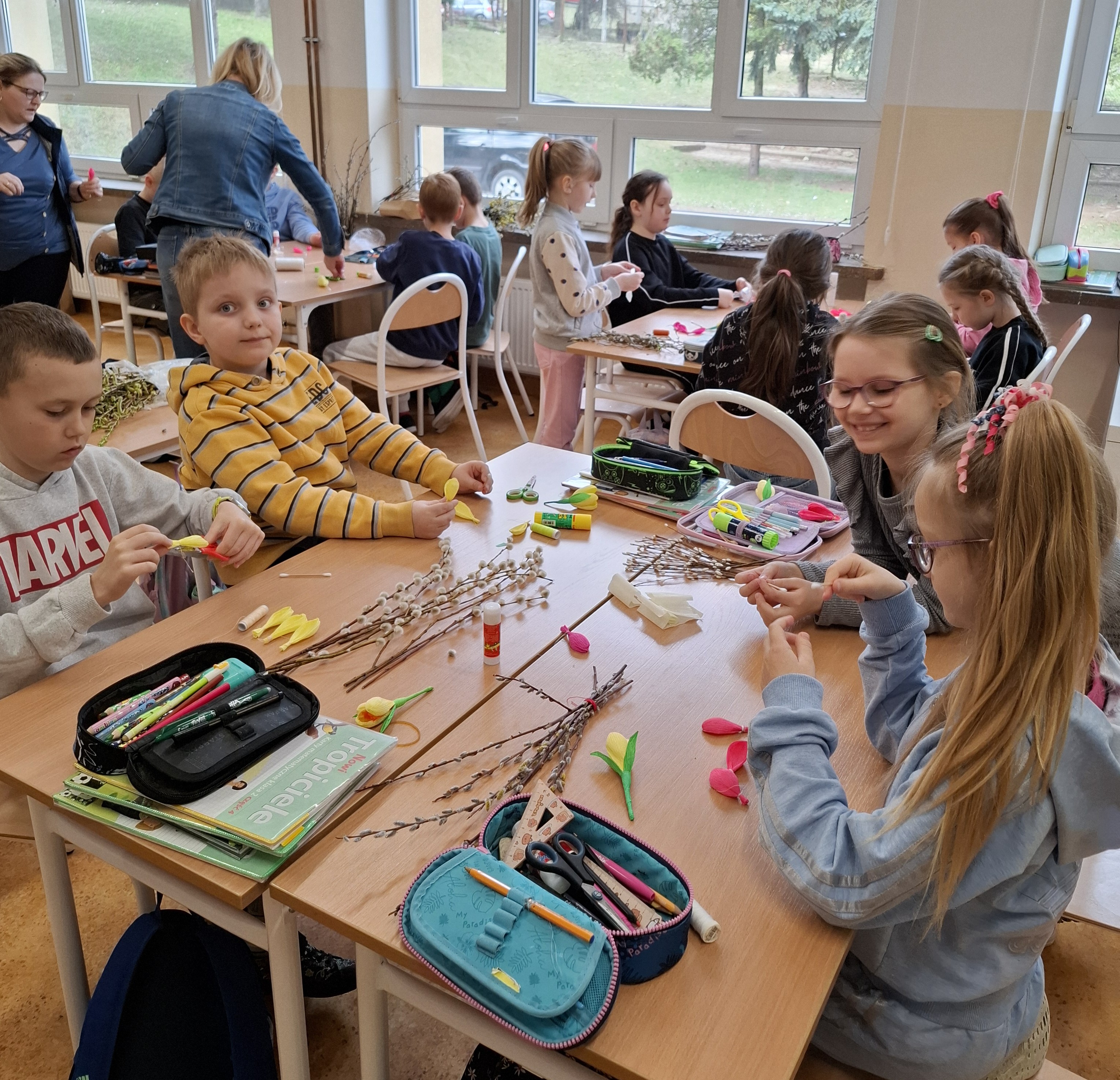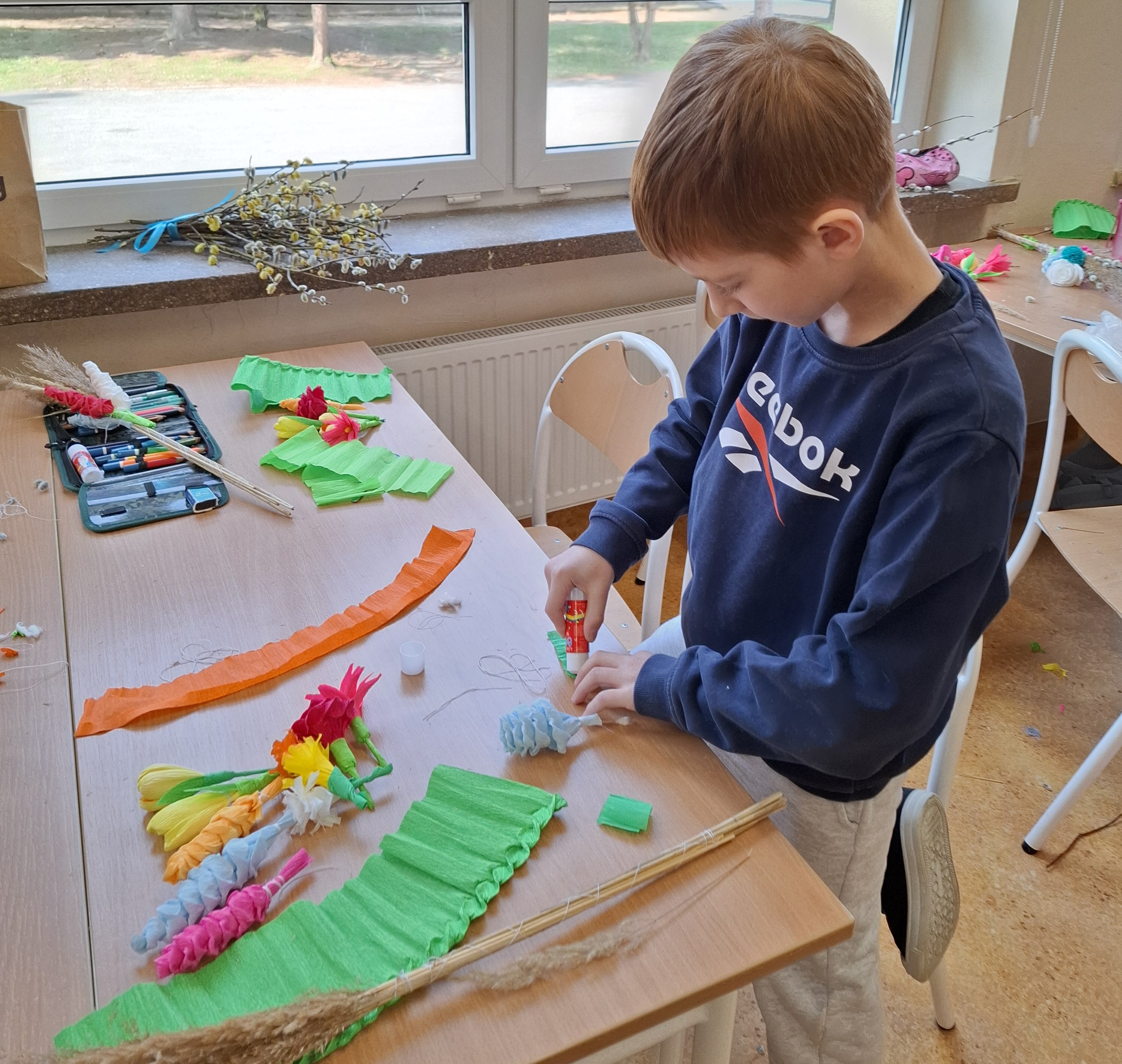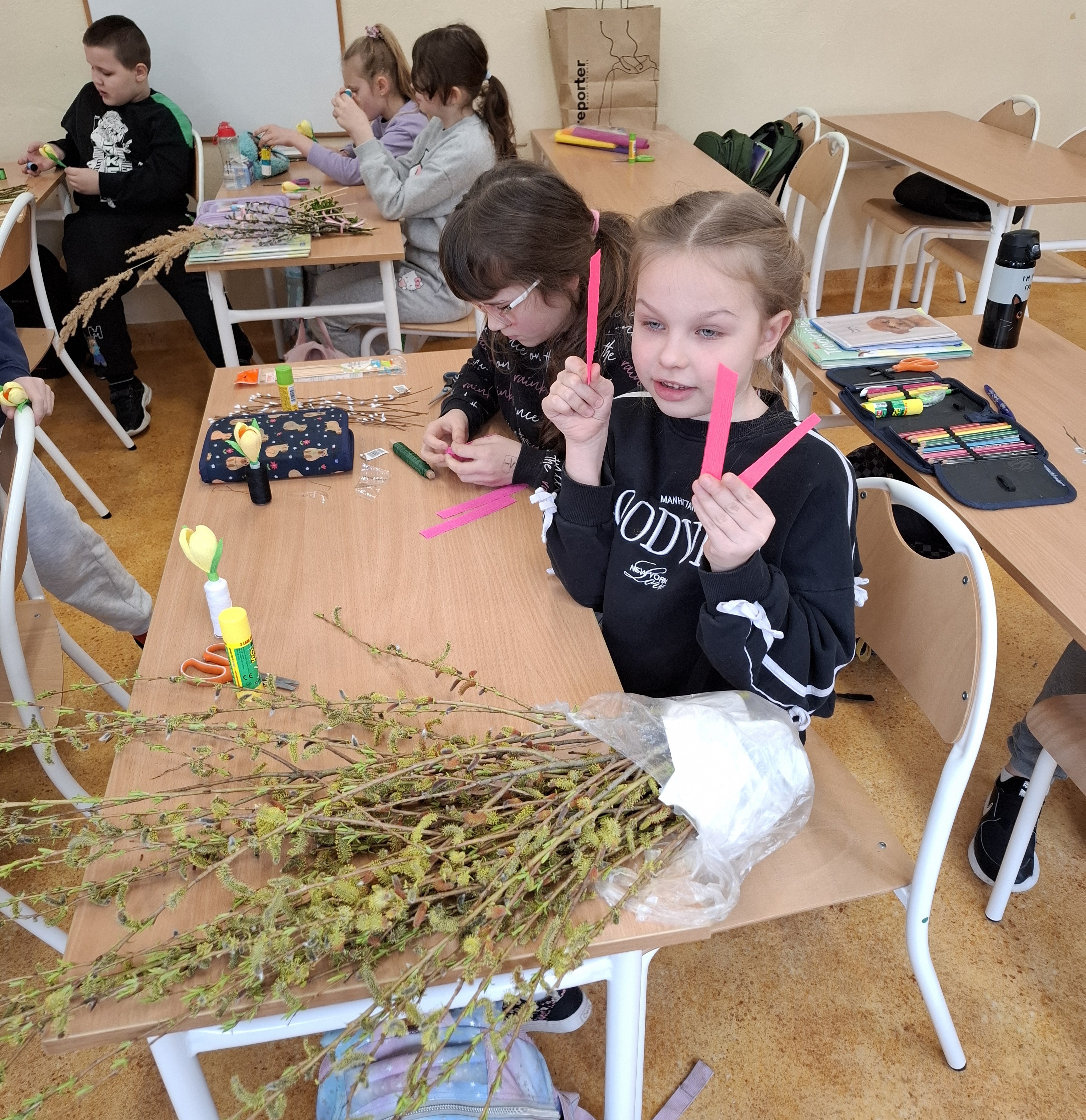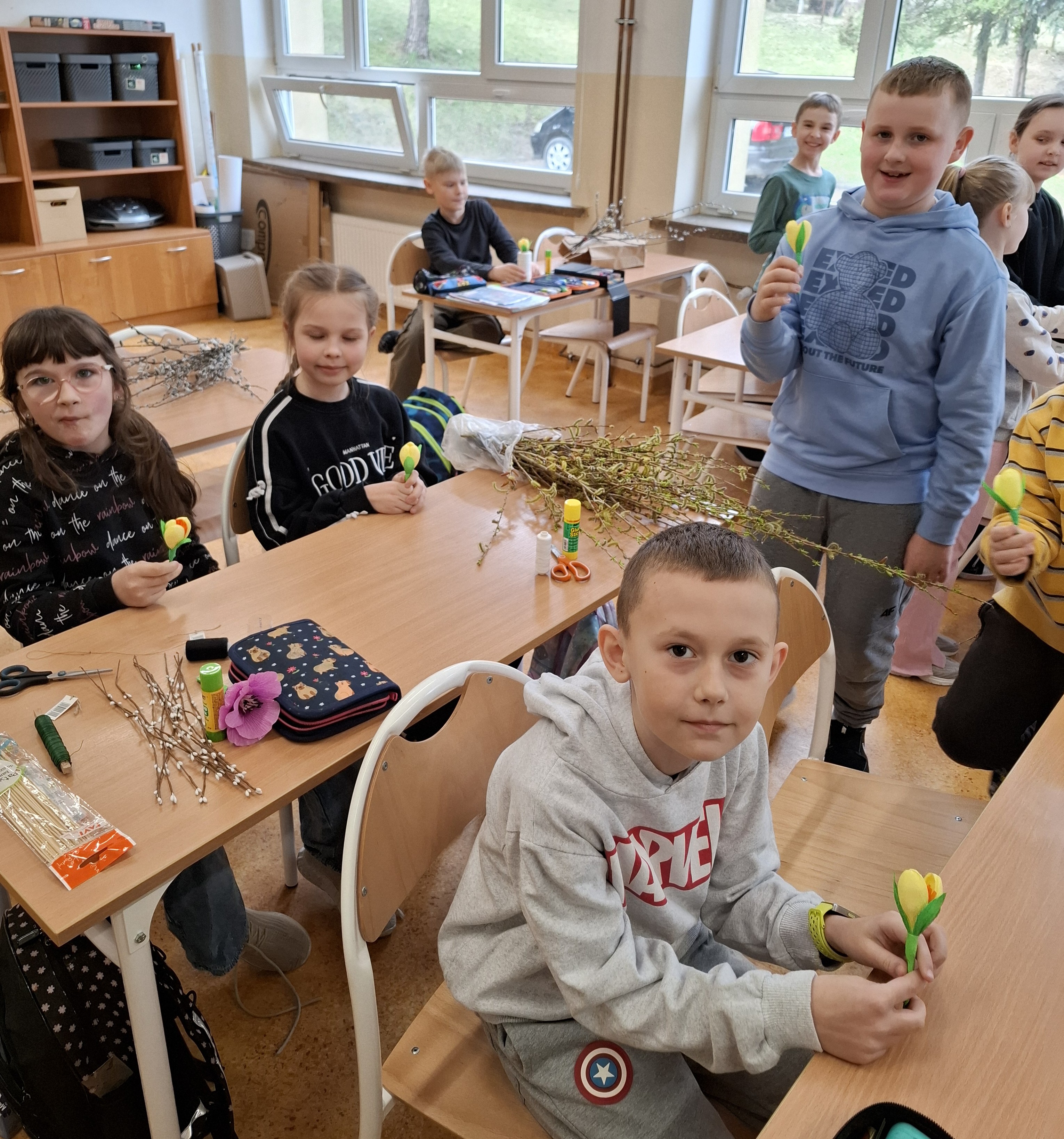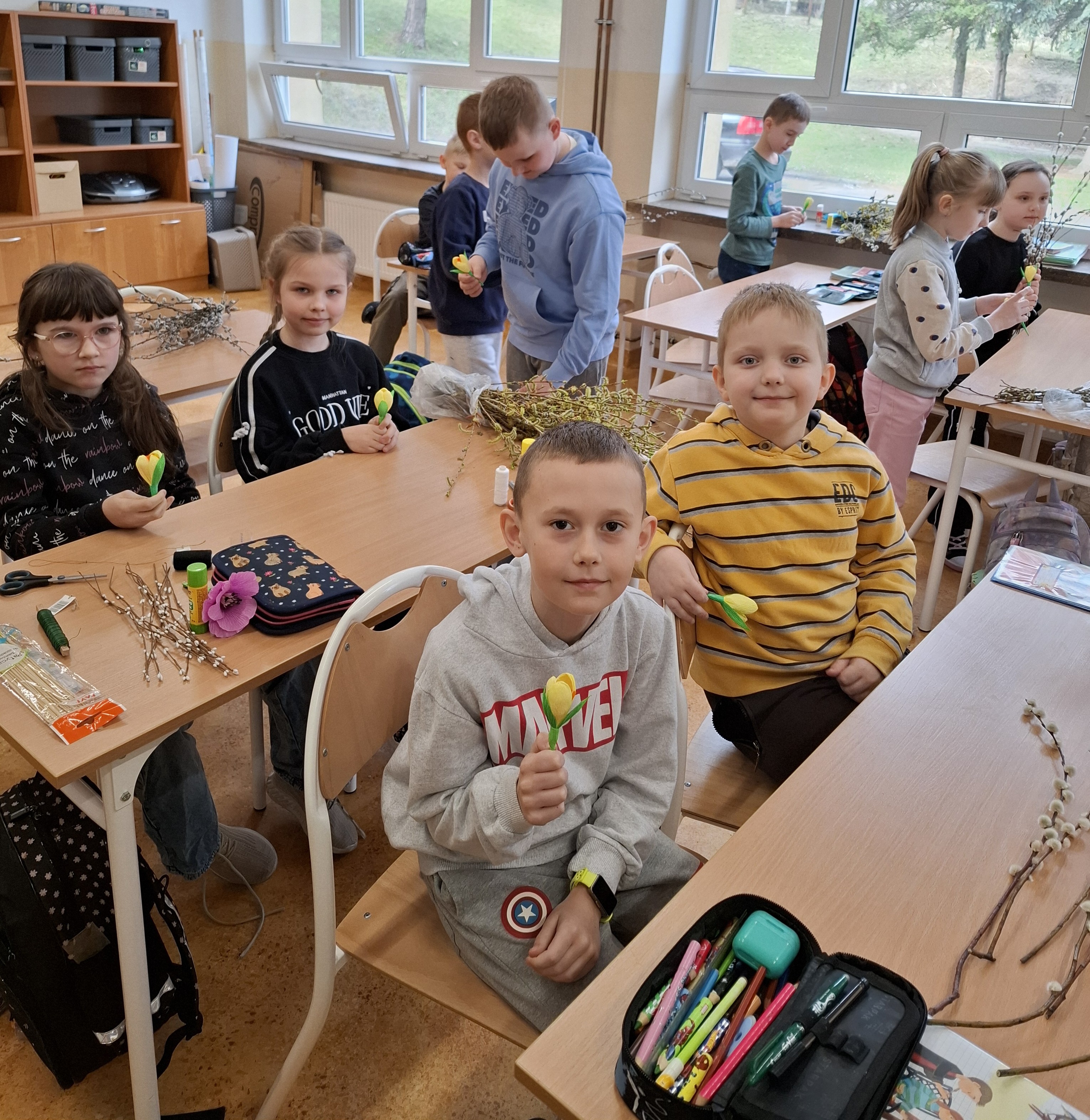To już kolejny raz, gdy do klasy 2c zawitała mama jednego z naszych uczniów, pani Maria. Krok po kroku przedstawiła drugoklasistom technikę wykonania palmy wielkanocnej. Dzieci wykorzystały do zrobienia rękodzieła różne materiały plastyczne i ekologiczne. Wykonanie palmy było pracochłonne, ale sprawiło uczniom dużo frajdy i satysfakcji. Uczniowie klasy 2c bardzo dziękują pani Marii za poświęcony czas oraz przekazanie informacji na temat tradycji wielkanocnych