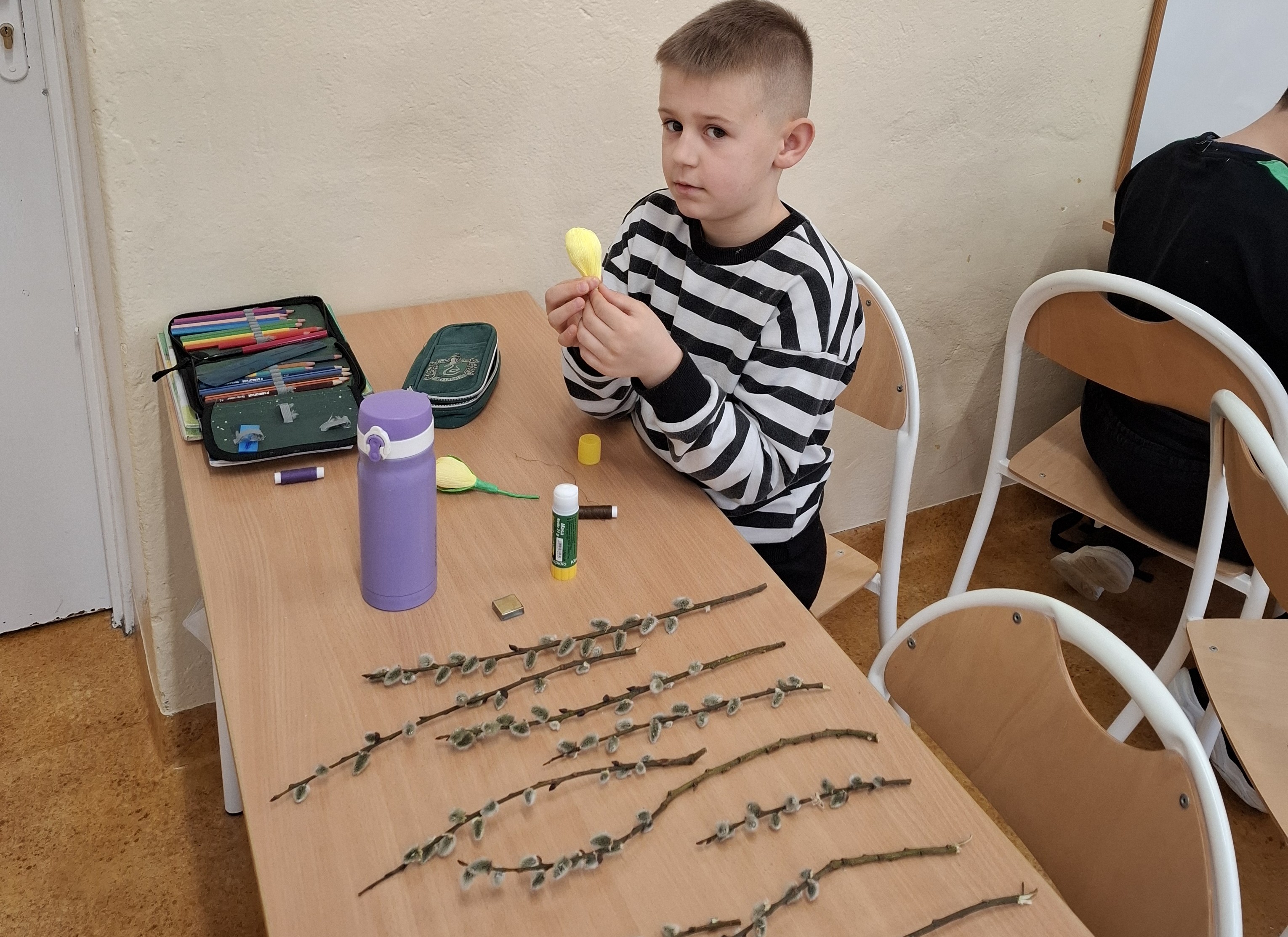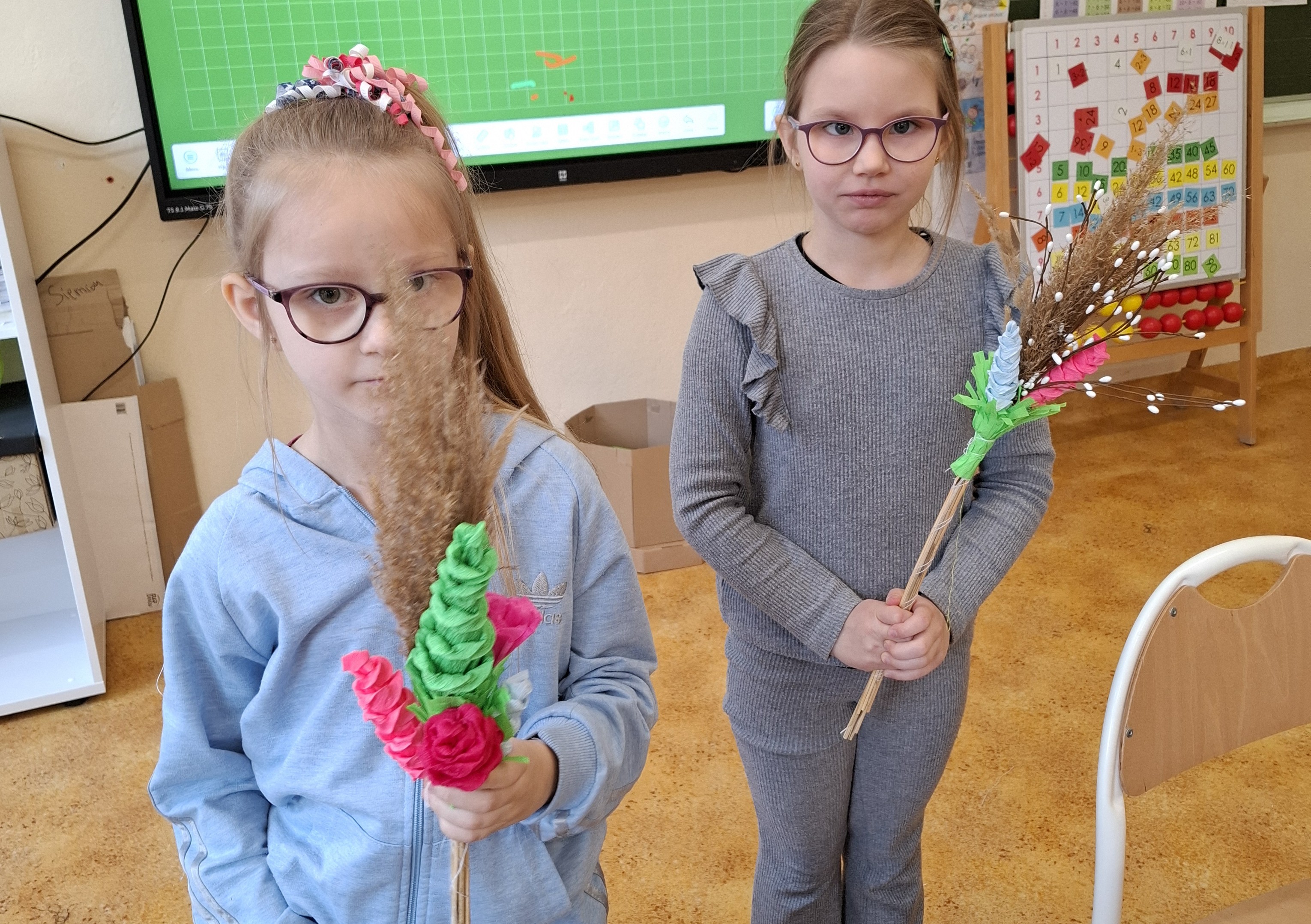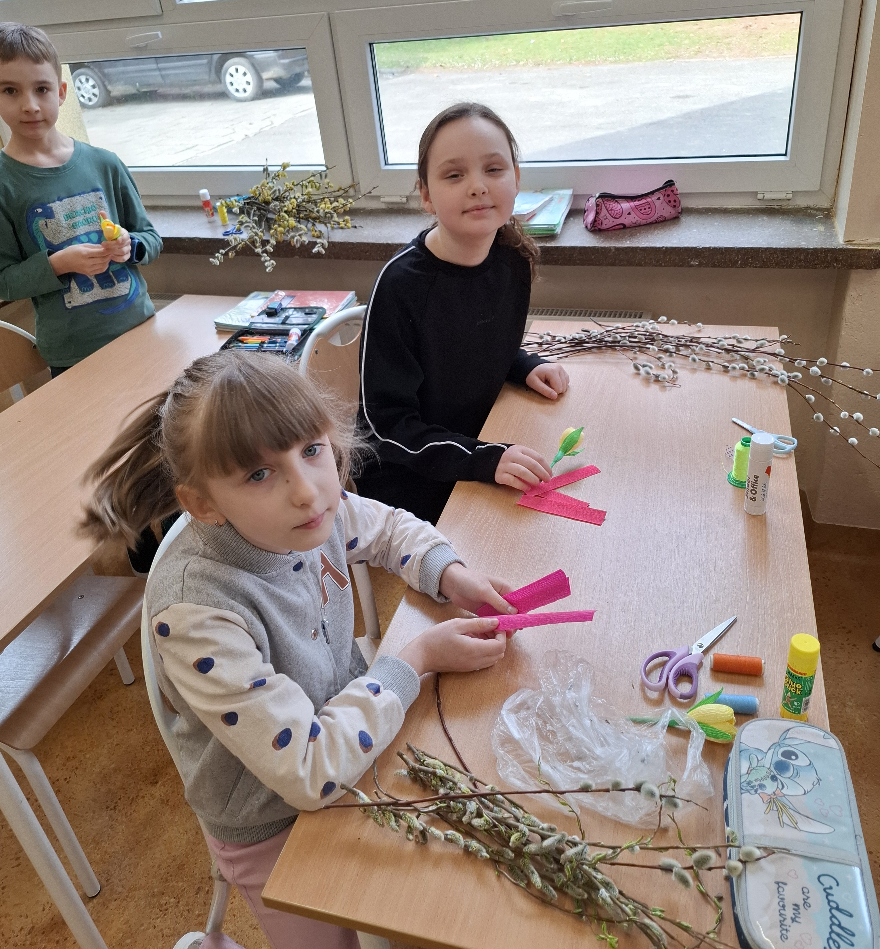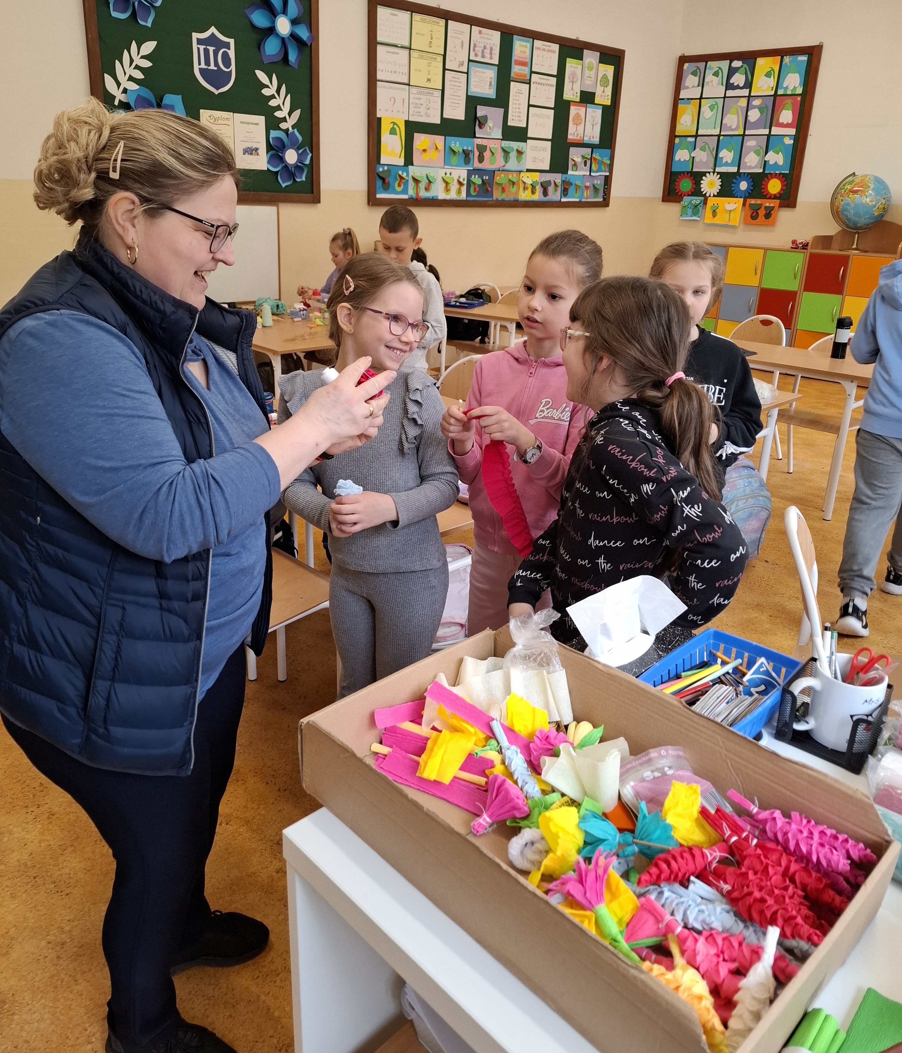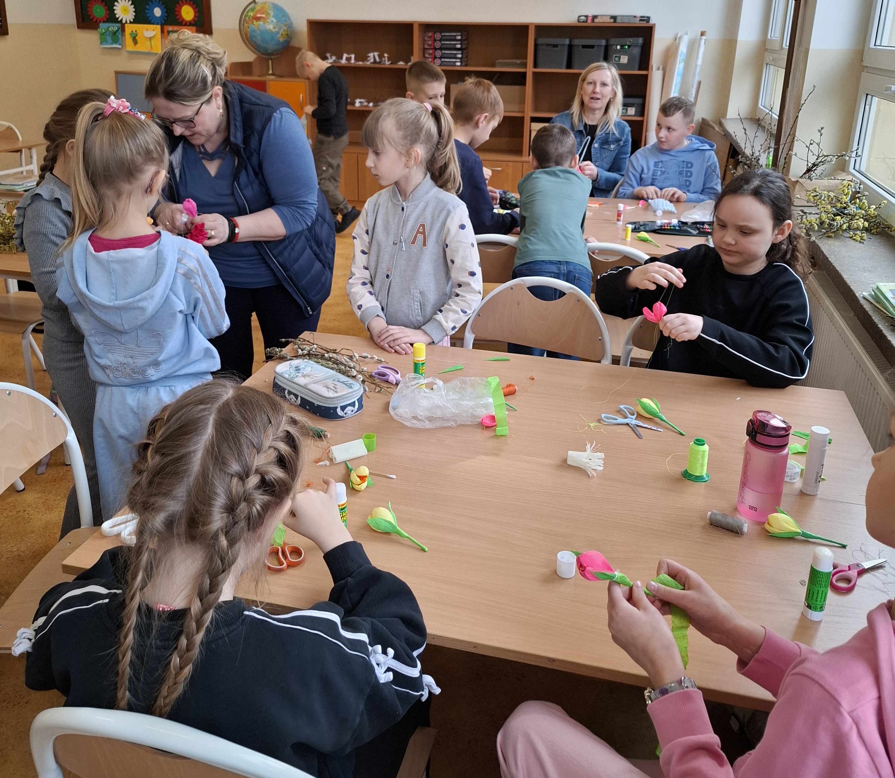 To już kolejny raz, gdy do klasy 2c zawitała mama jednego z naszych uczniów, pani Maria. Krok po kroku przedstawiła drugoklasistom technikę wykonania palmy wielkanocnej. Dzieci wykorzystały do zrobienia rękodzieła różne materiały plastyczne i ekologiczne. Wykonanie palmy było pracochłonne, ale sprawiło uczniom dużo frajdy i satysfakcji. Uczniowie klasy 2c bardzo dziękują pani Marii za poświęcony czas oraz przekazanie informacji na temat tradycji wielkanocnych