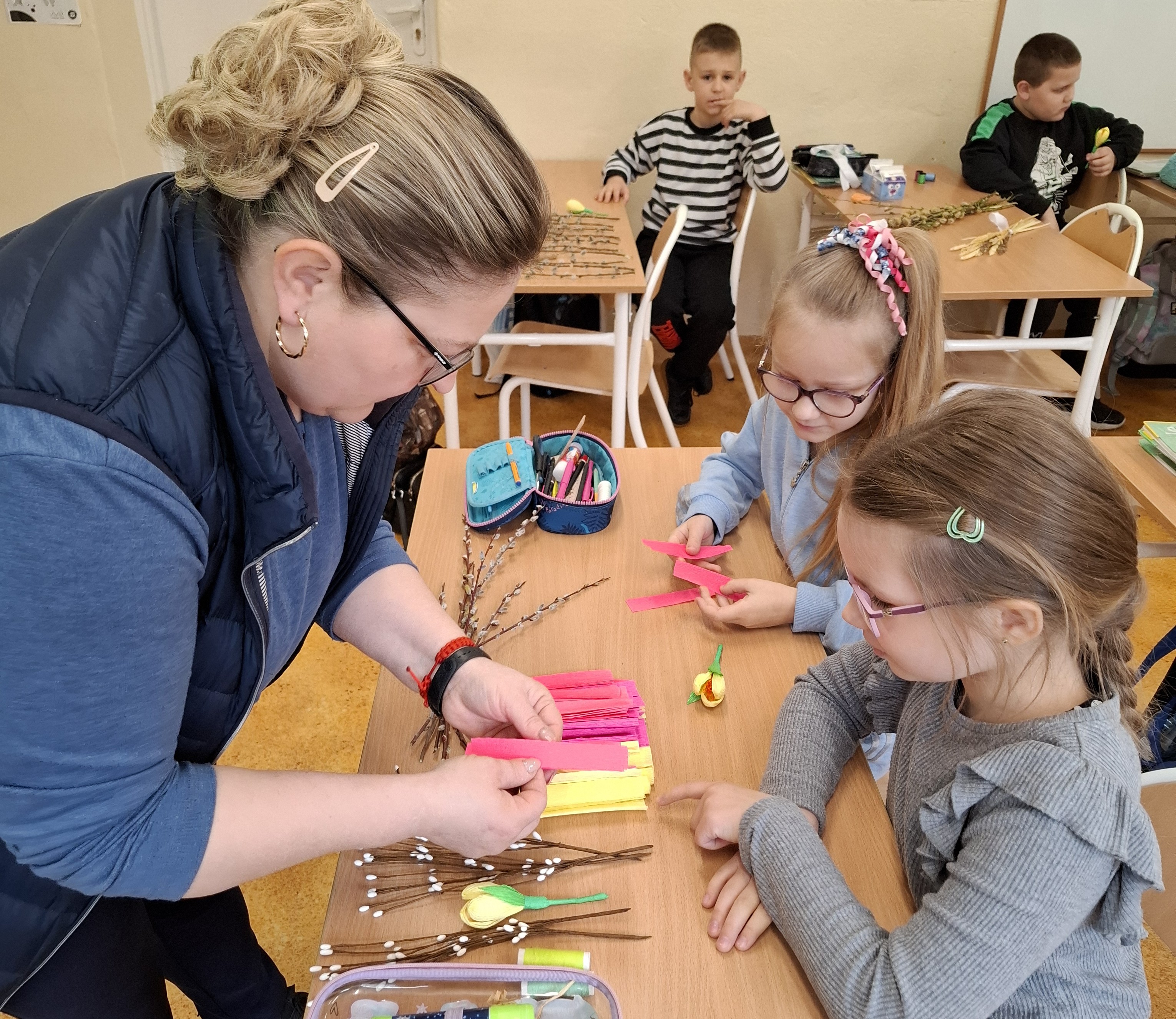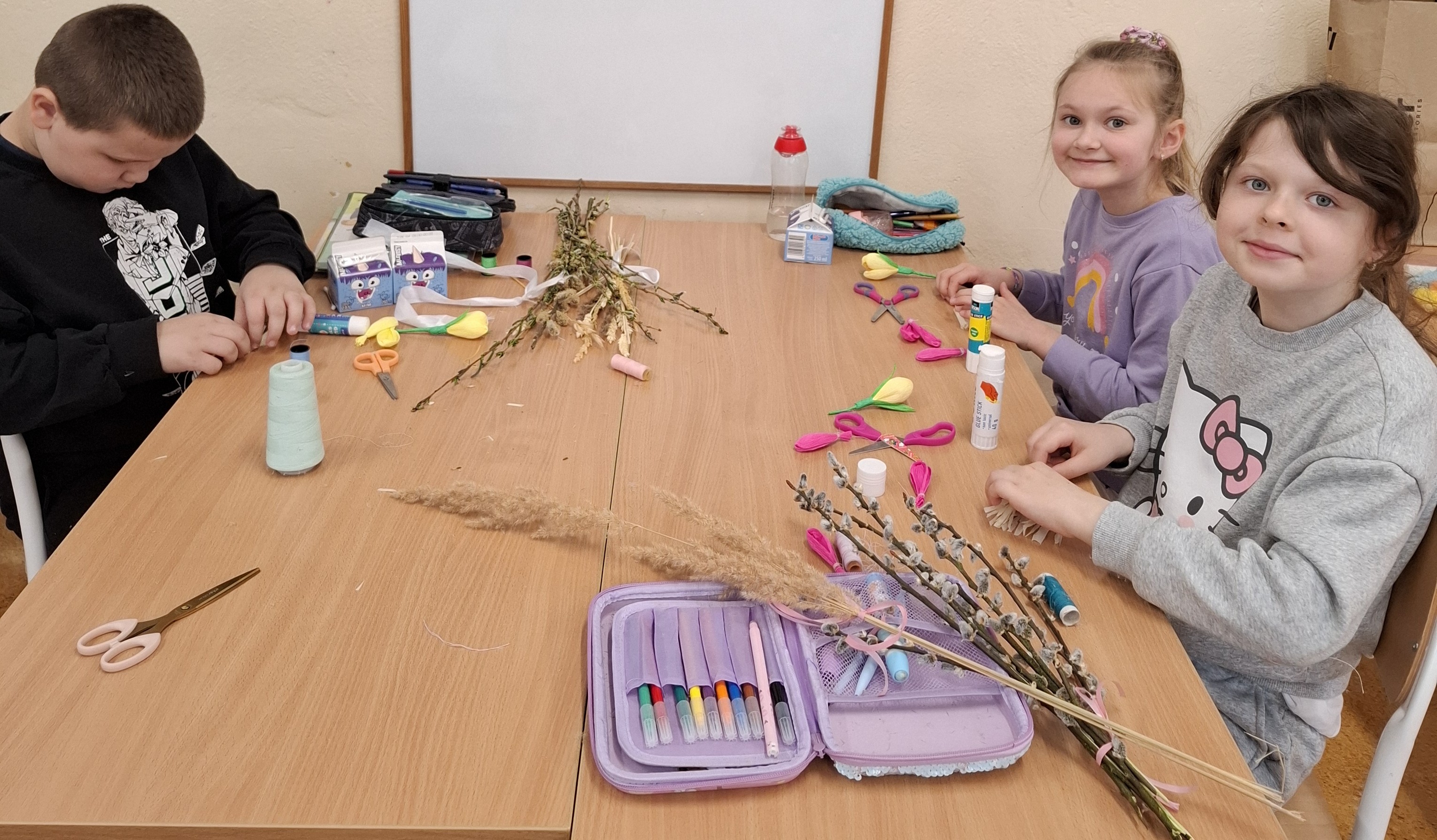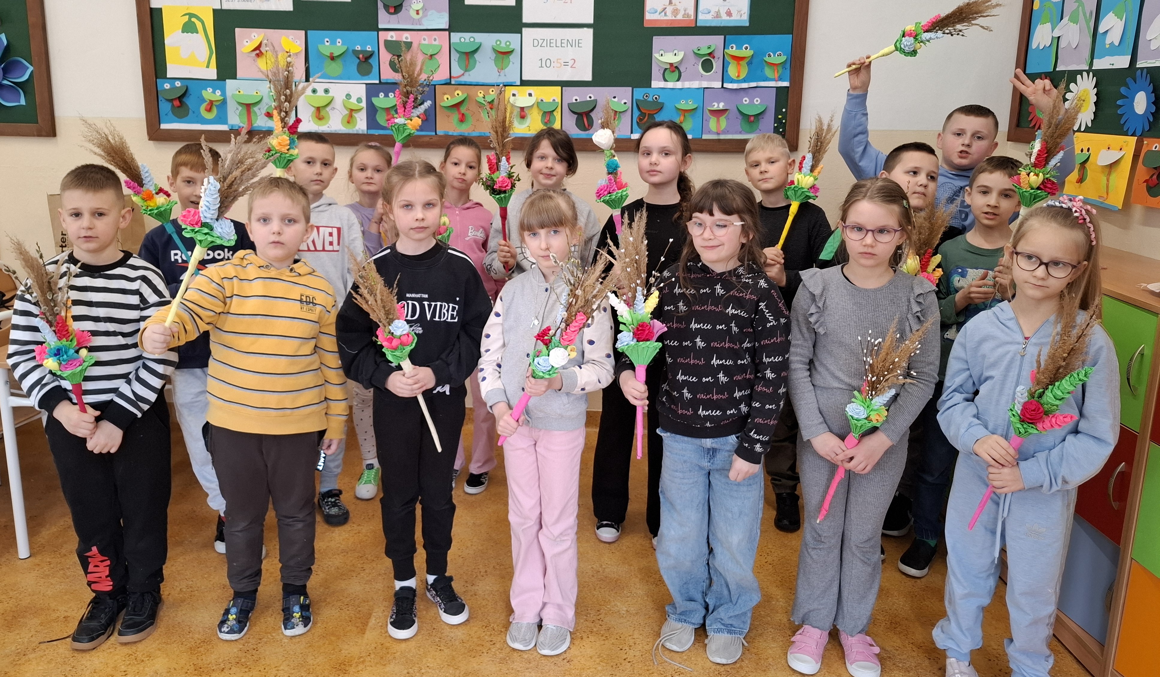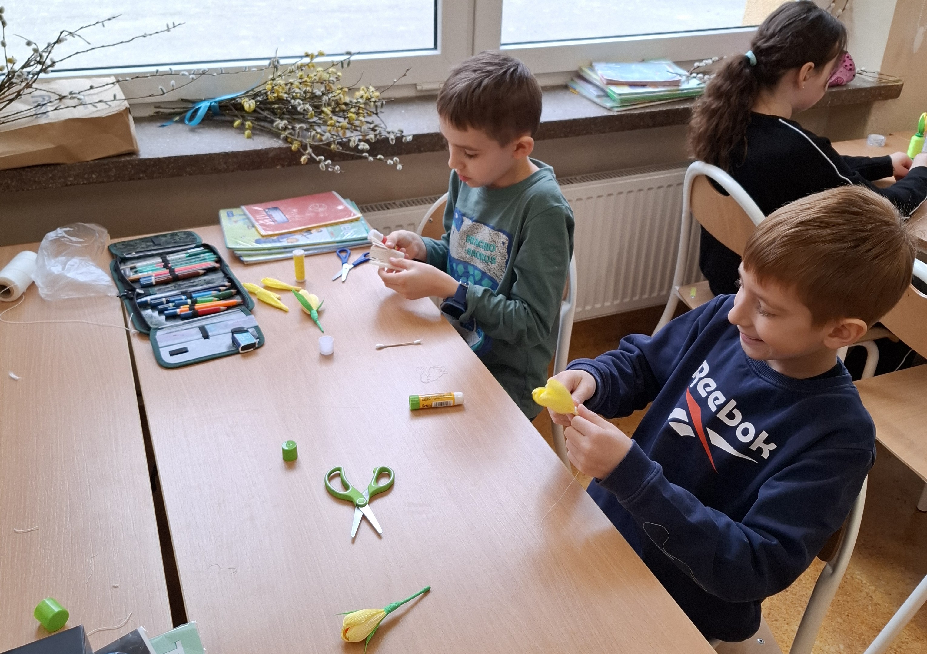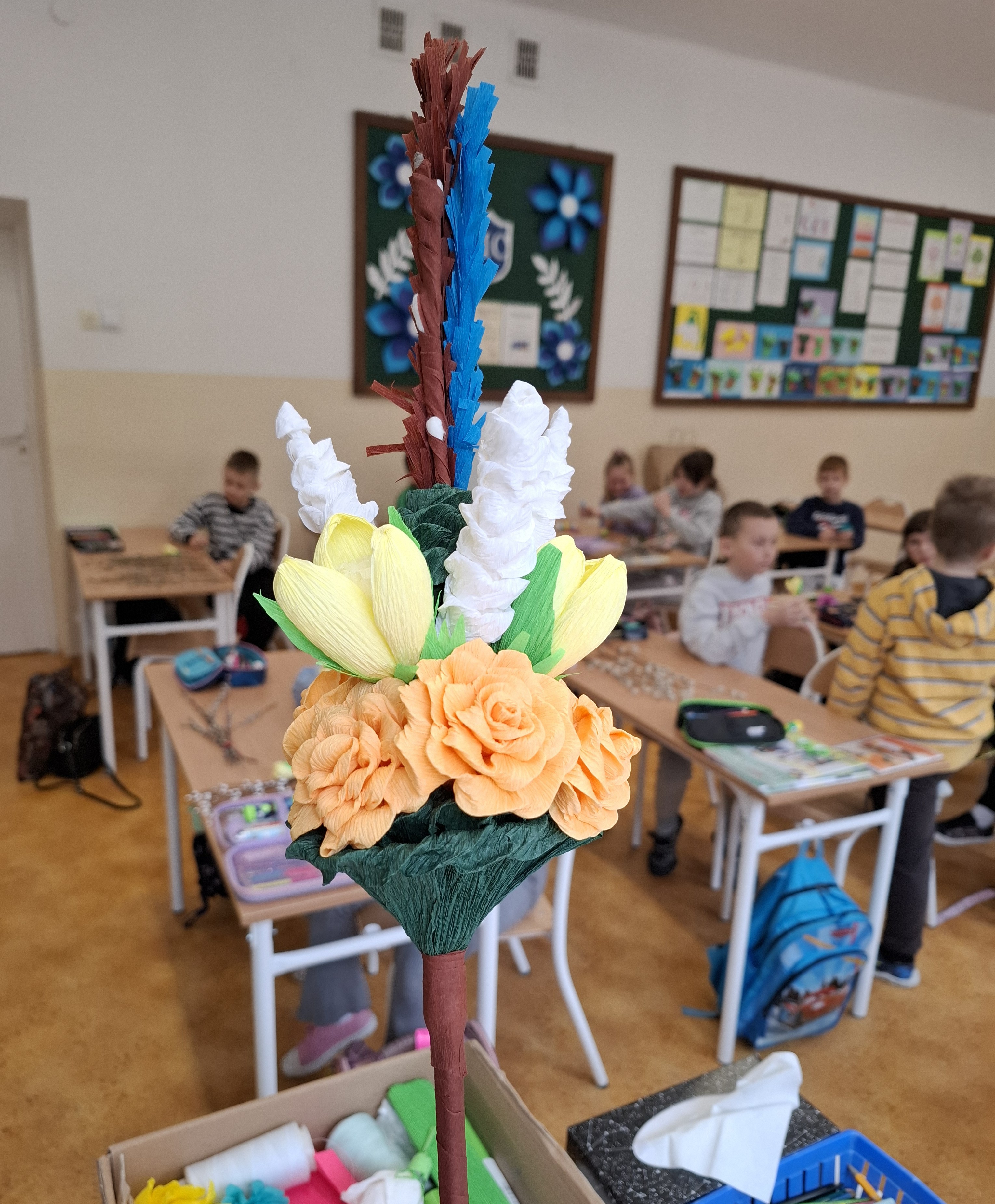 To już kolejny raz, gdy do klasy 2c zawitała mama jednego z naszych uczniów, pani Maria. Krok po kroku przedstawiła drugoklasistom technikę wykonania palmy wielkanocnej. Dzieci wykorzystały do zrobienia rękodzieła różne materiały plastyczne i ekologiczne. Wykonanie palmy było pracochłonne, ale sprawiło uczniom dużo frajdy i satysfakcji. Uczniowie klasy 2c bardzo dziękują pani Marii za poświęcony czas oraz przekazanie informacji na temat tradycji wielkanocnych