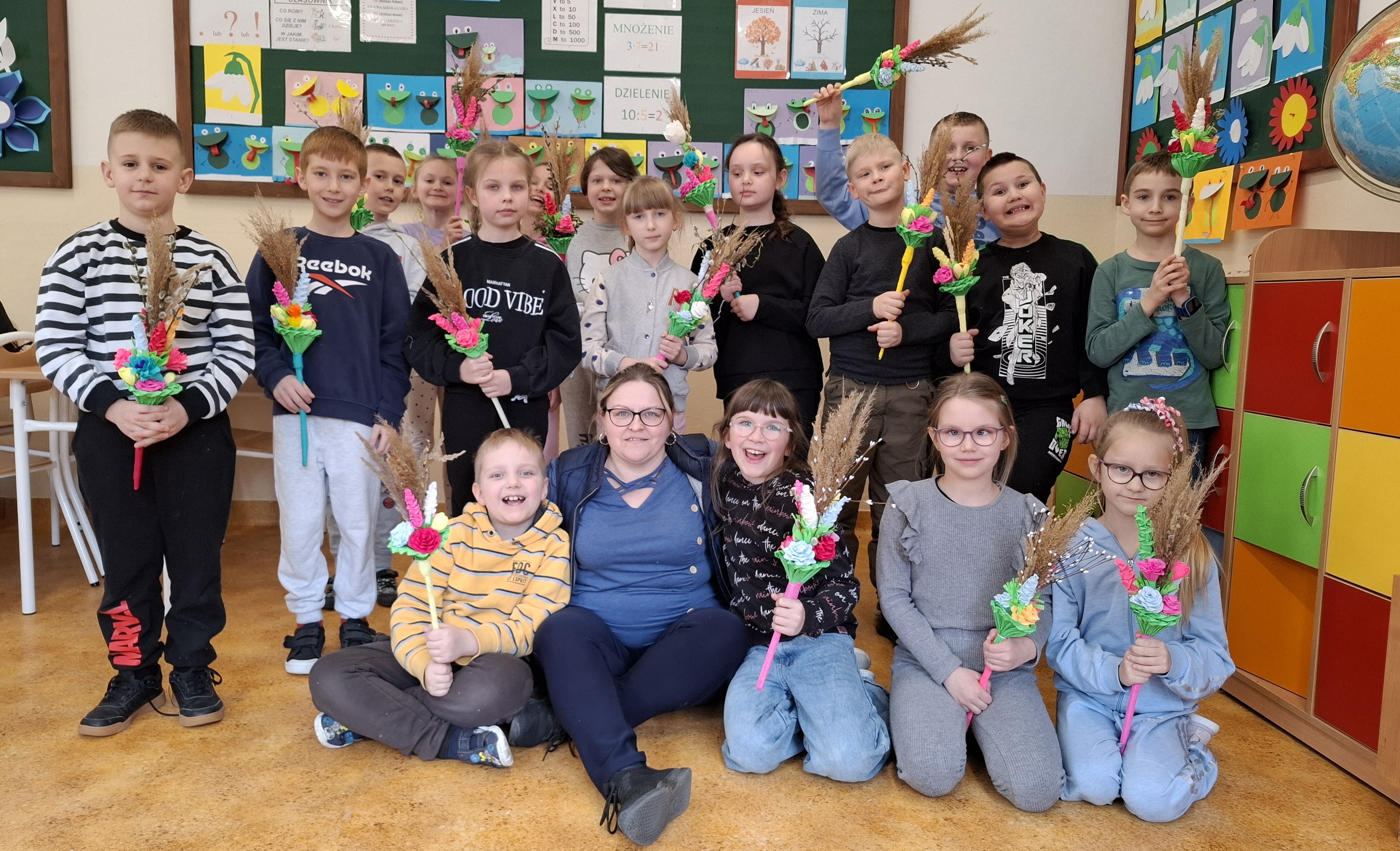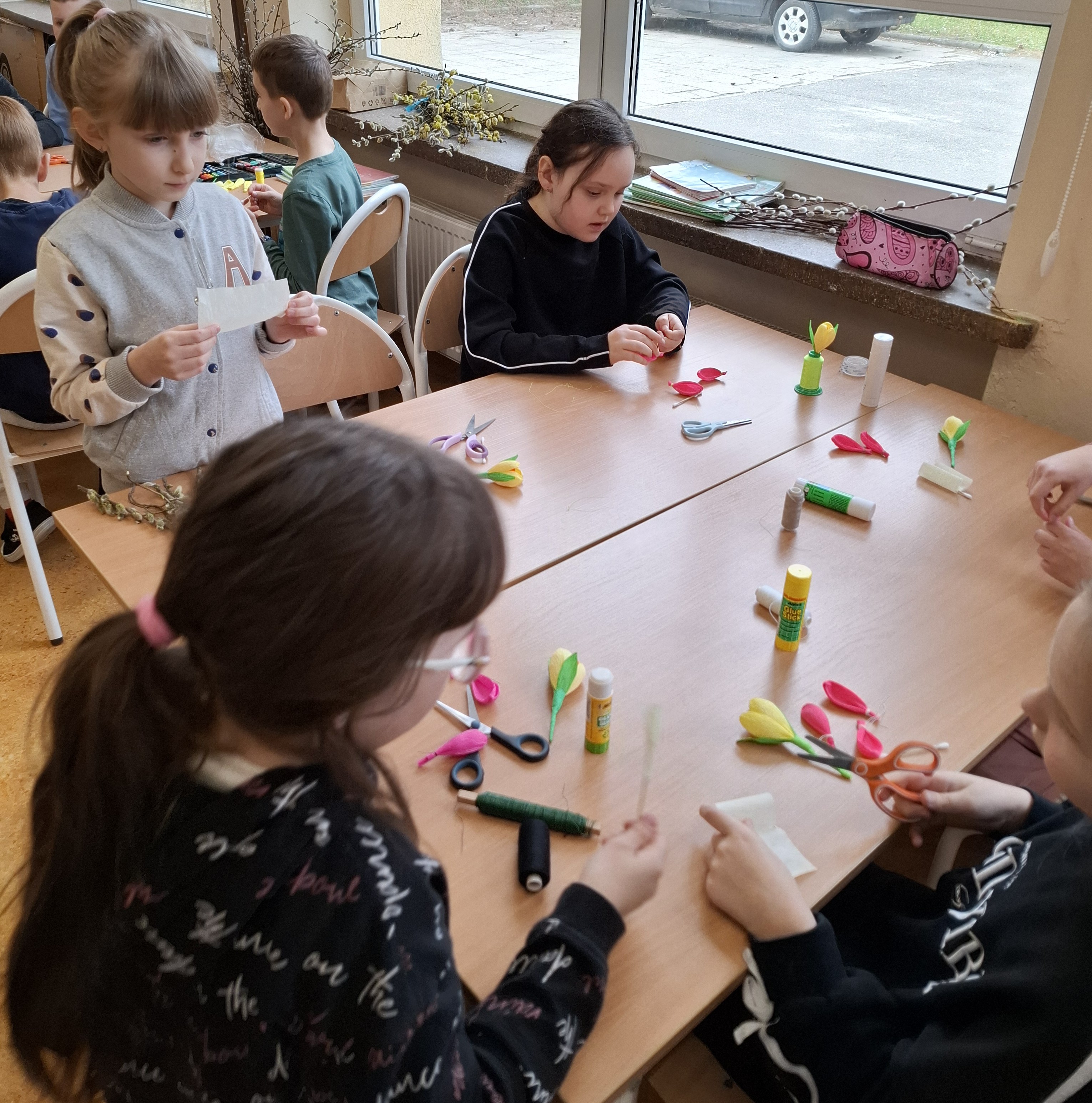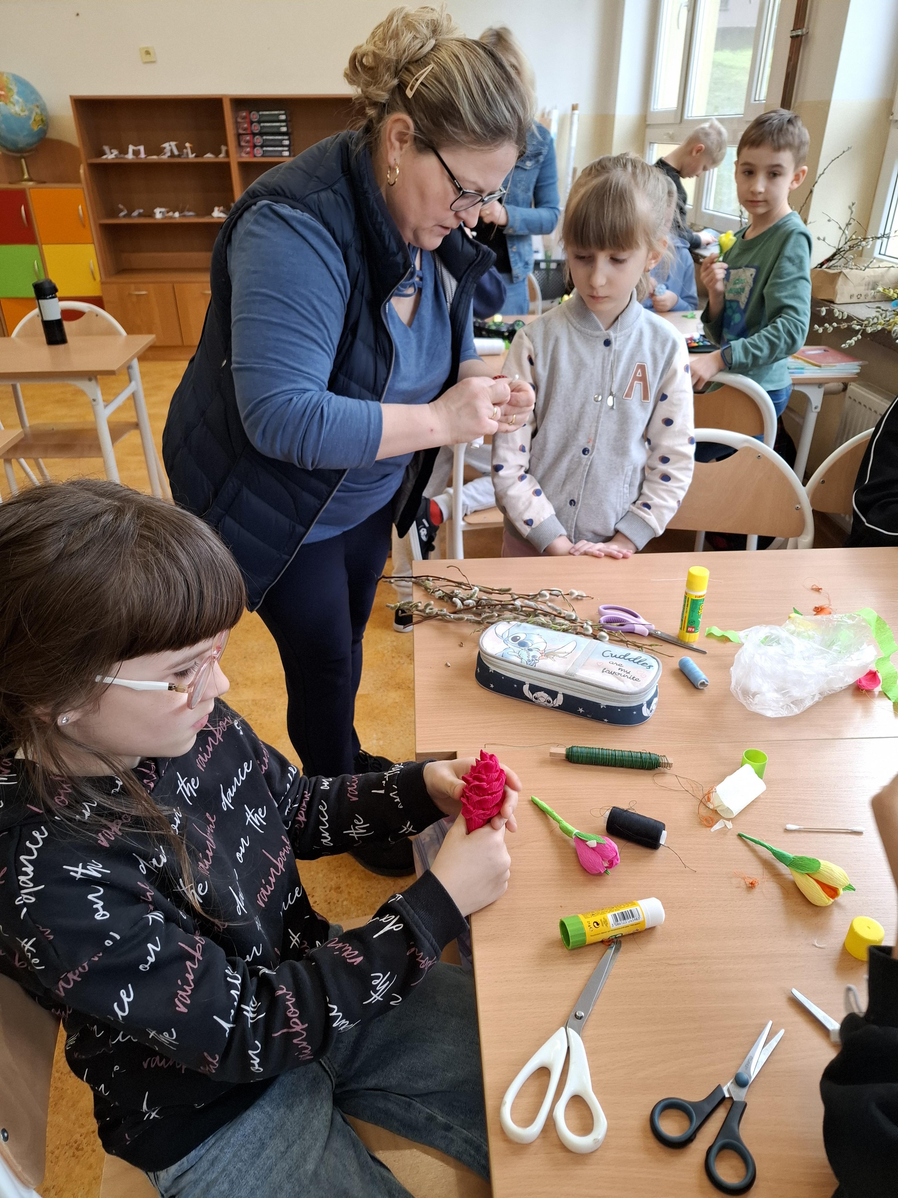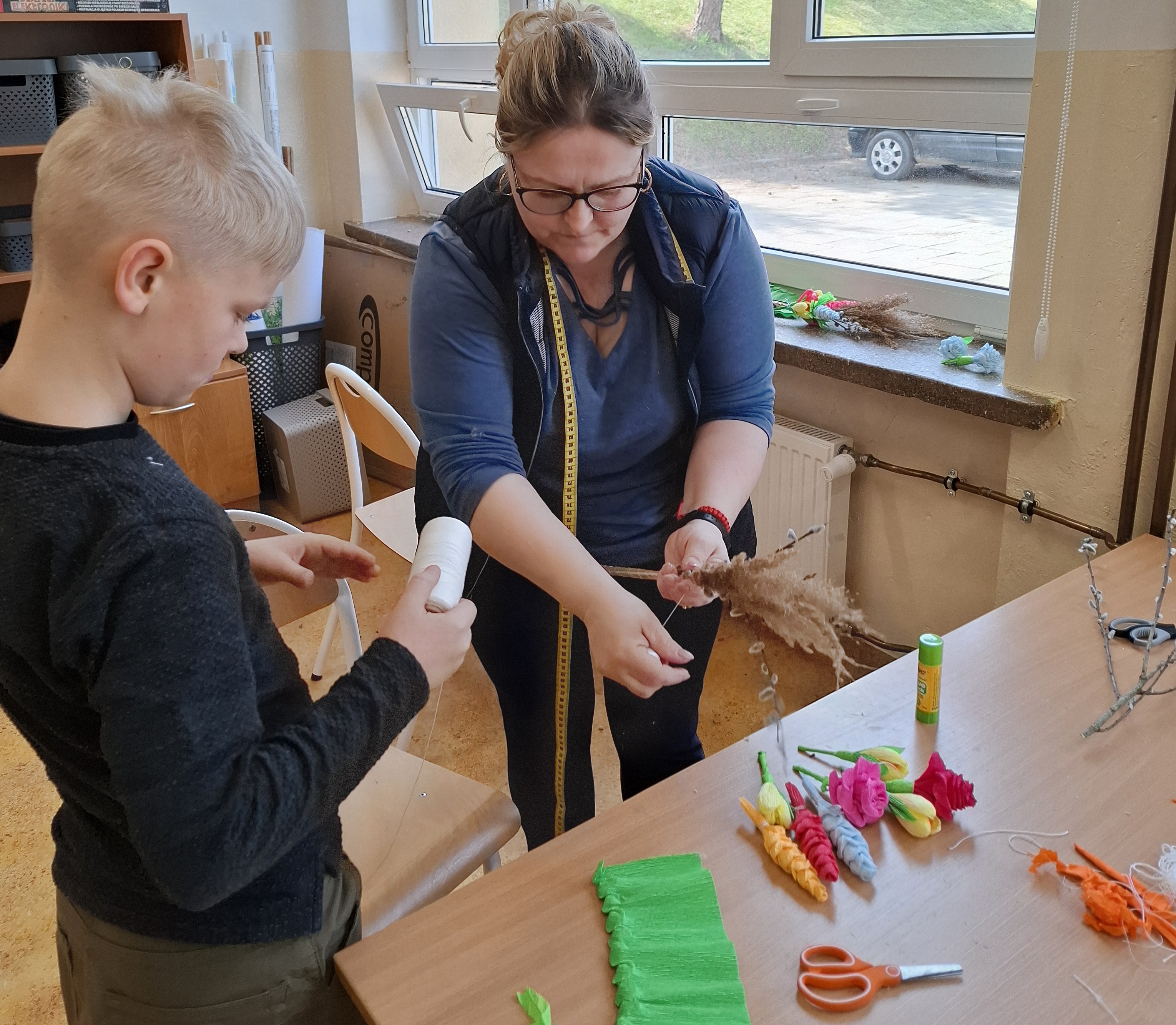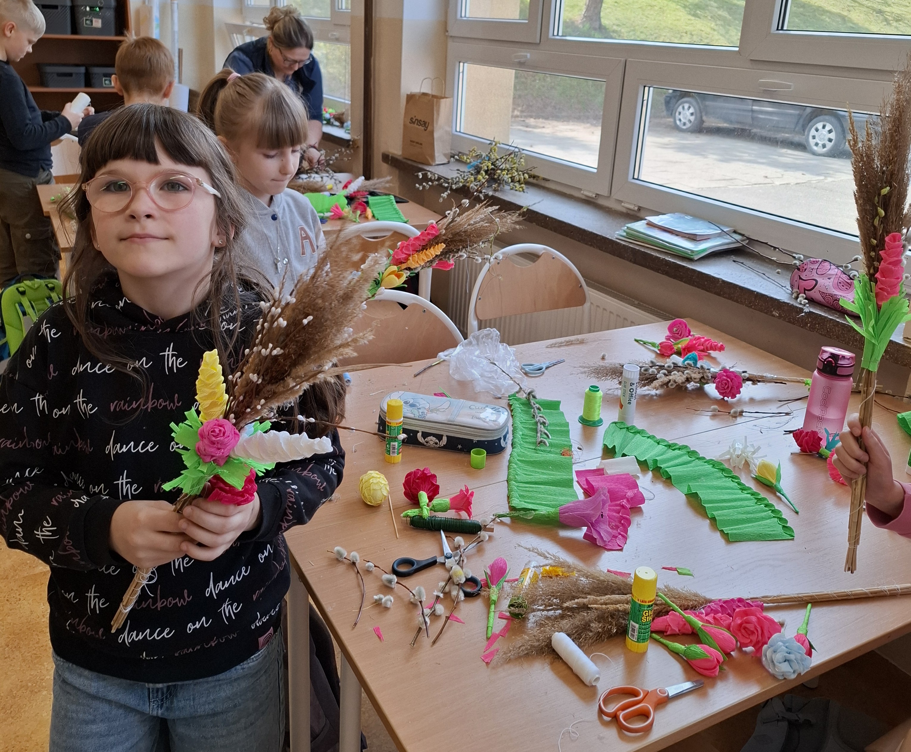 To już kolejny raz, gdy do klasy 2c zawitała mama jednego z naszych uczniów, pani Maria. Krok po kroku przedstawiła drugoklasistom technikę wykonania palmy wielkanocnej. Dzieci wykorzystały do zrobienia rękodzieła różne materiały plastyczne i ekologiczne. Wykonanie palmy było pracochłonne, ale sprawiło uczniom dużo frajdy i satysfakcji. Uczniowie klasy 2c bardzo dziękują pani Marii za poświęcony czas oraz przekazanie informacji na temat tradycji wielkanocnych