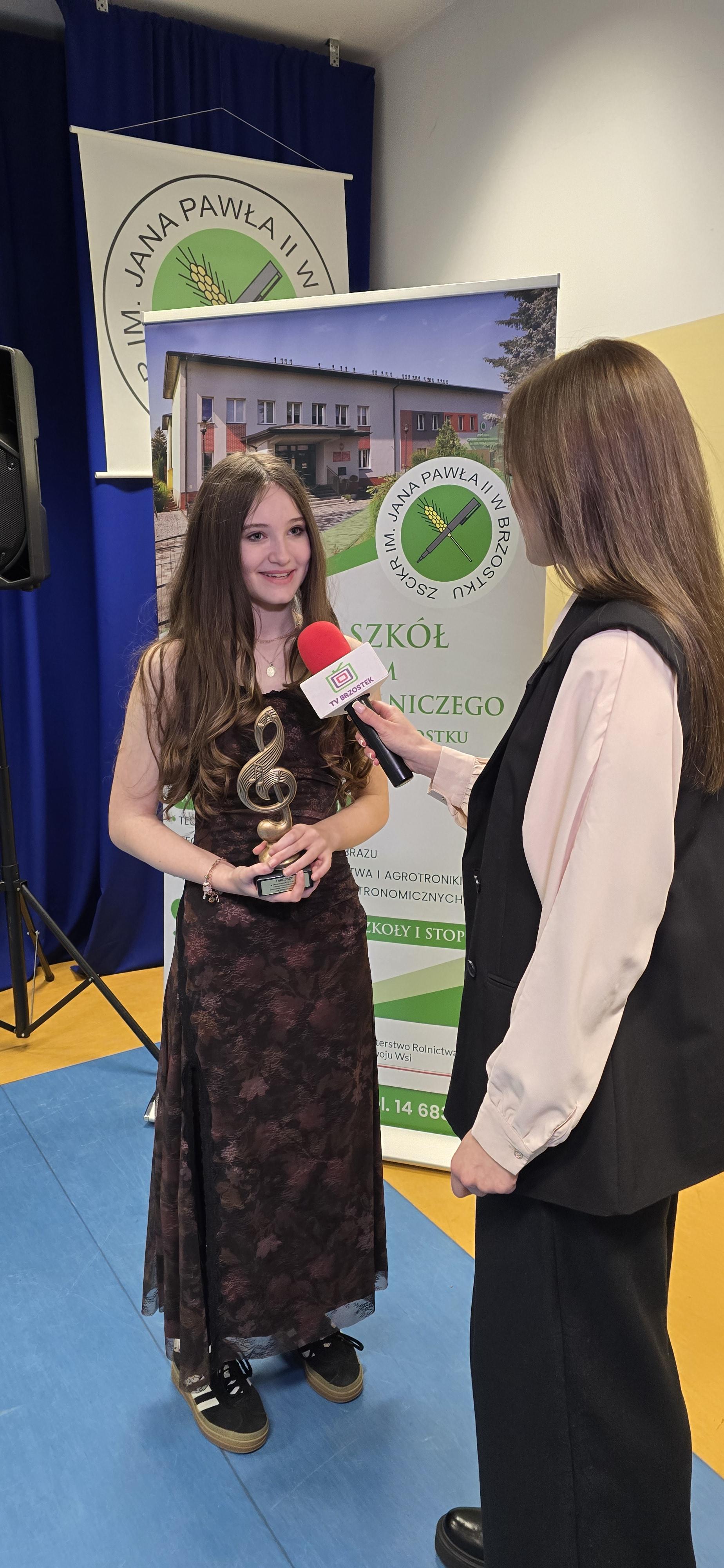 Szkołę Podstawową w Brzostku reprezentowały uczennice: Nadia Staniszewska z klasy IV „a” w piosence ‘The Climb’ Miley Cyrus oraz Viviana Piątek z klasy V „b” w piosence ‘Talking to the Moon’ Bruna Marsa. Viviana, rywalizując z dwunastoma uczestnikami konkursu z jedenastu szkół podstawowych powiatu dębickiego i jasielskiego, udowodniła, że prawdziwy talent w połączeniu z ciężką pracą nie zna granic. Występując z anglojęzycznym repertuarem, młoda artystka oczarowała jury, zdobywając bezapelacyjne pierwsze miejsce w gronie licznych i utalentowanych uczestników. Jej zwycięstwo to nie tylko sukces muzyczny, ale przede wszystkim świadectwo wielkiej dojrzałości scenicznej i językowej biegłości. Wypełniona życzliwością atmosfera konkursu sprzyjała artystycznej pasji, pozwalając Vivianie w pełni rozwinąć skrzydła i zaprezentować swój unikalny głos. Ukoronowaniem tego wyjątkowego dnia była zasłużona nagroda oraz wywiad dla lokalnej telewizji, podczas którego nasza laureatka z wielką klasą dzieliła się swoimi wrażeniami. To medialne spotkanie oraz występy przed szeroką publicznością stały się dla niej źródłem bezcennych, nowych doświadczeń, które z pewnością ukształtują jej dalszą drogę. Jesteśmy dumni, że Vivianka potrafiła zamienić zainteresowanie w tak spektakularny sukces, inspirując rówieśników swoją odwagą i autentycznością. Ten dzień zapisze się w jej pamięci jako milowy krok w budowaniu artystycznej tożsamości. Wierzymy, że tegoroczny triumf to dopiero początek pięknej i pełnej sukcesów przygody z muzyką.